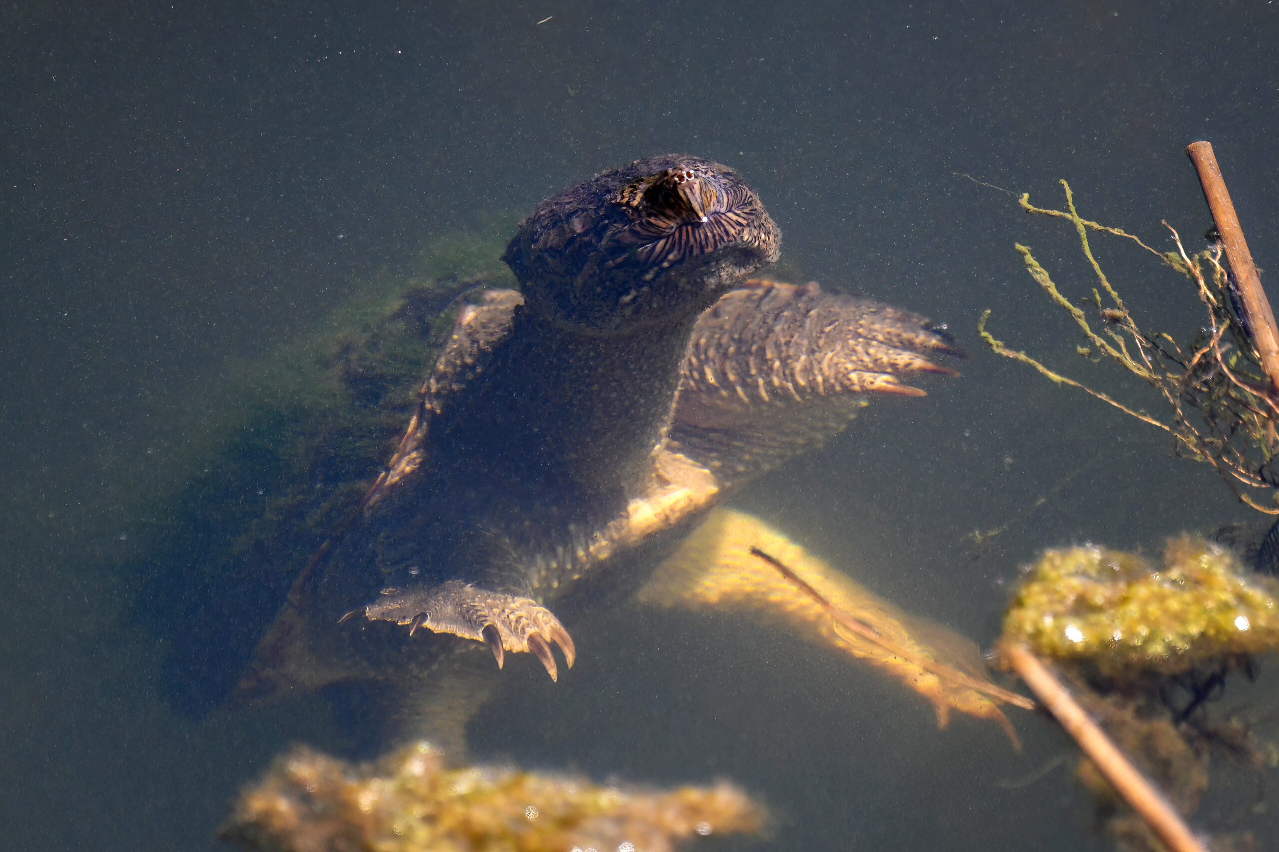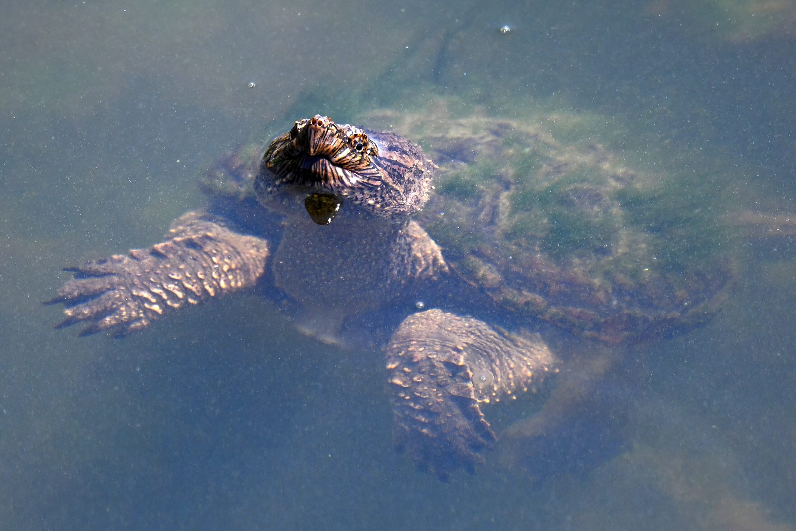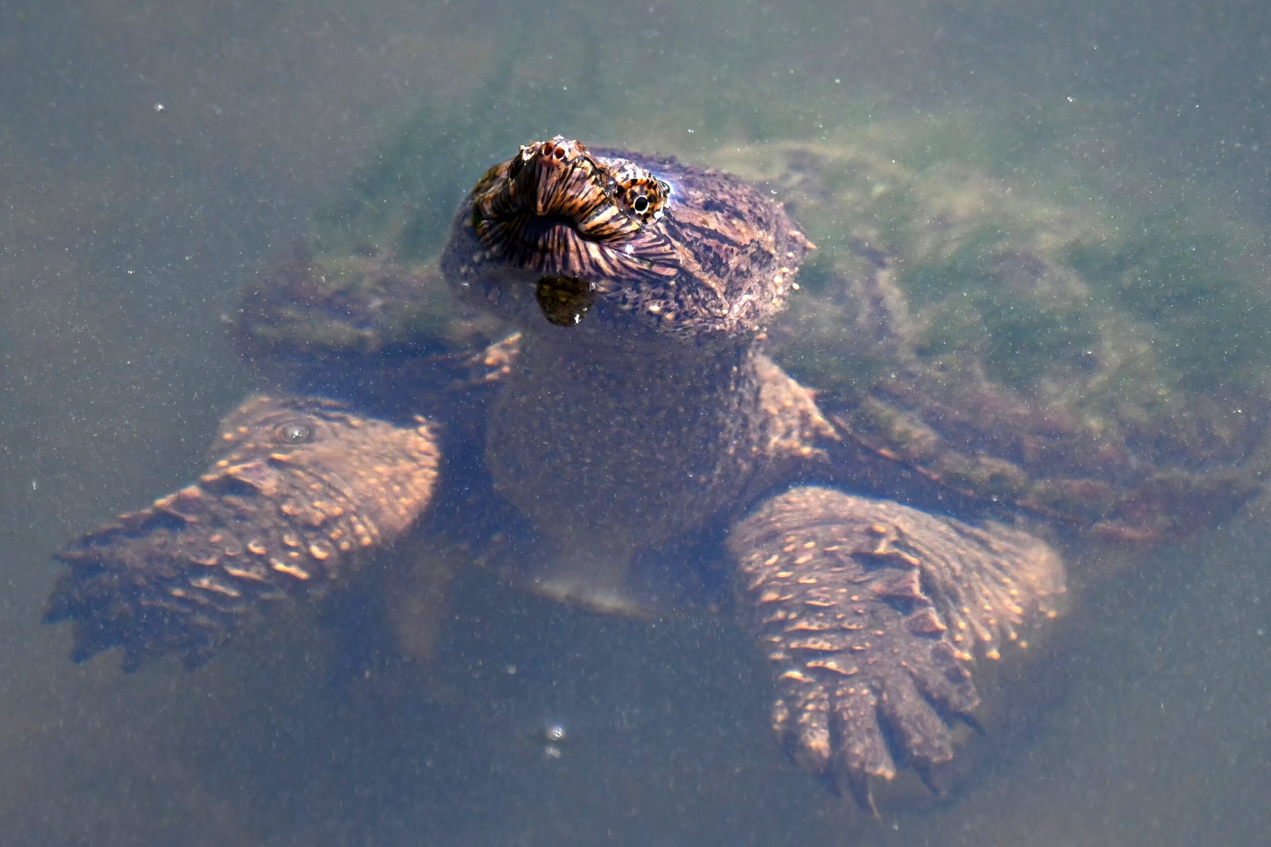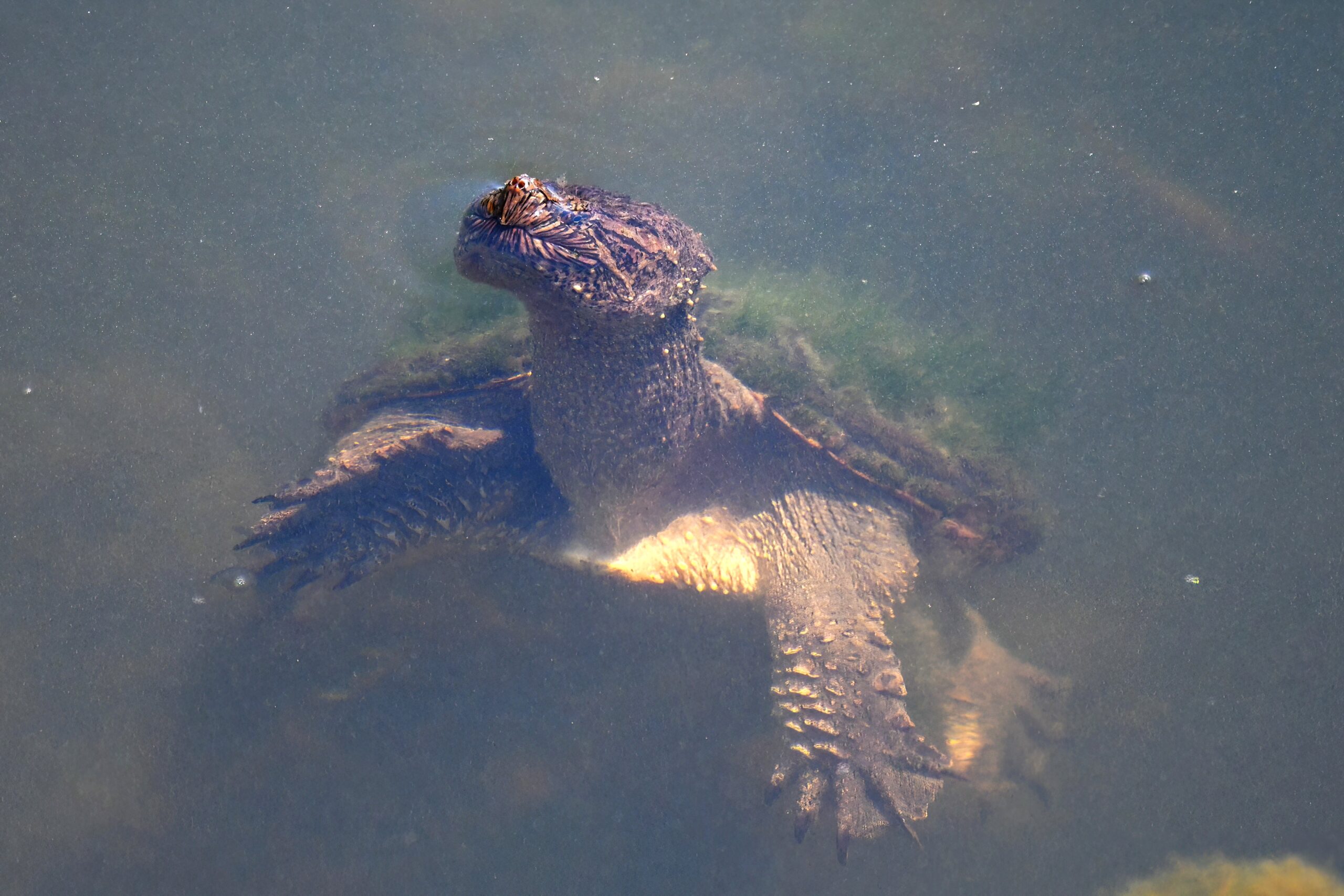 Guess it’s that time of the morning for coffee break, or some other sort of break – why not a herpetology break? – with recent, fun shots of Common Snapping Turtleย (Chelydra serpentina)ย in the enclosed pond at South Pier, Erie, Pennsylvania: