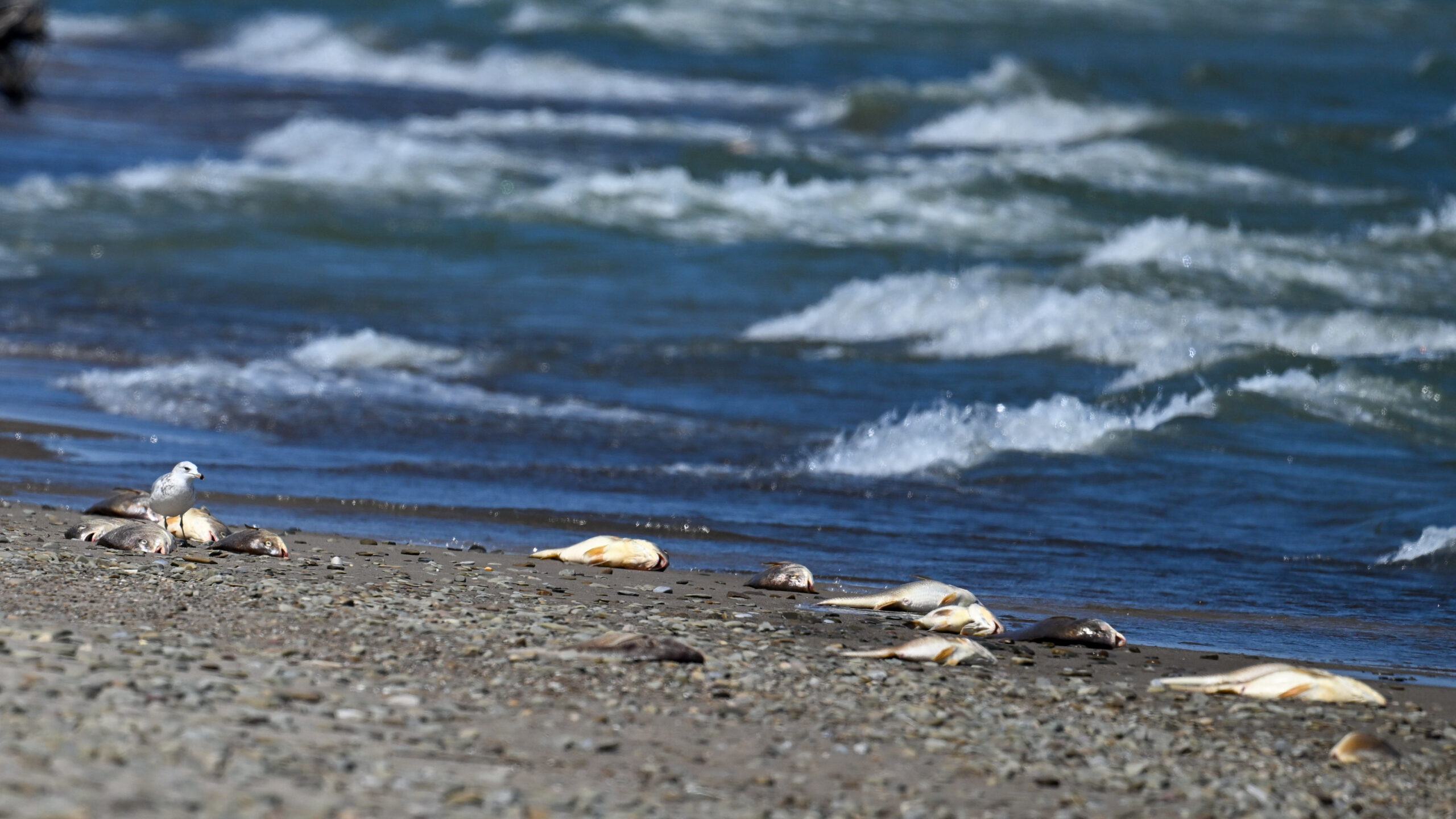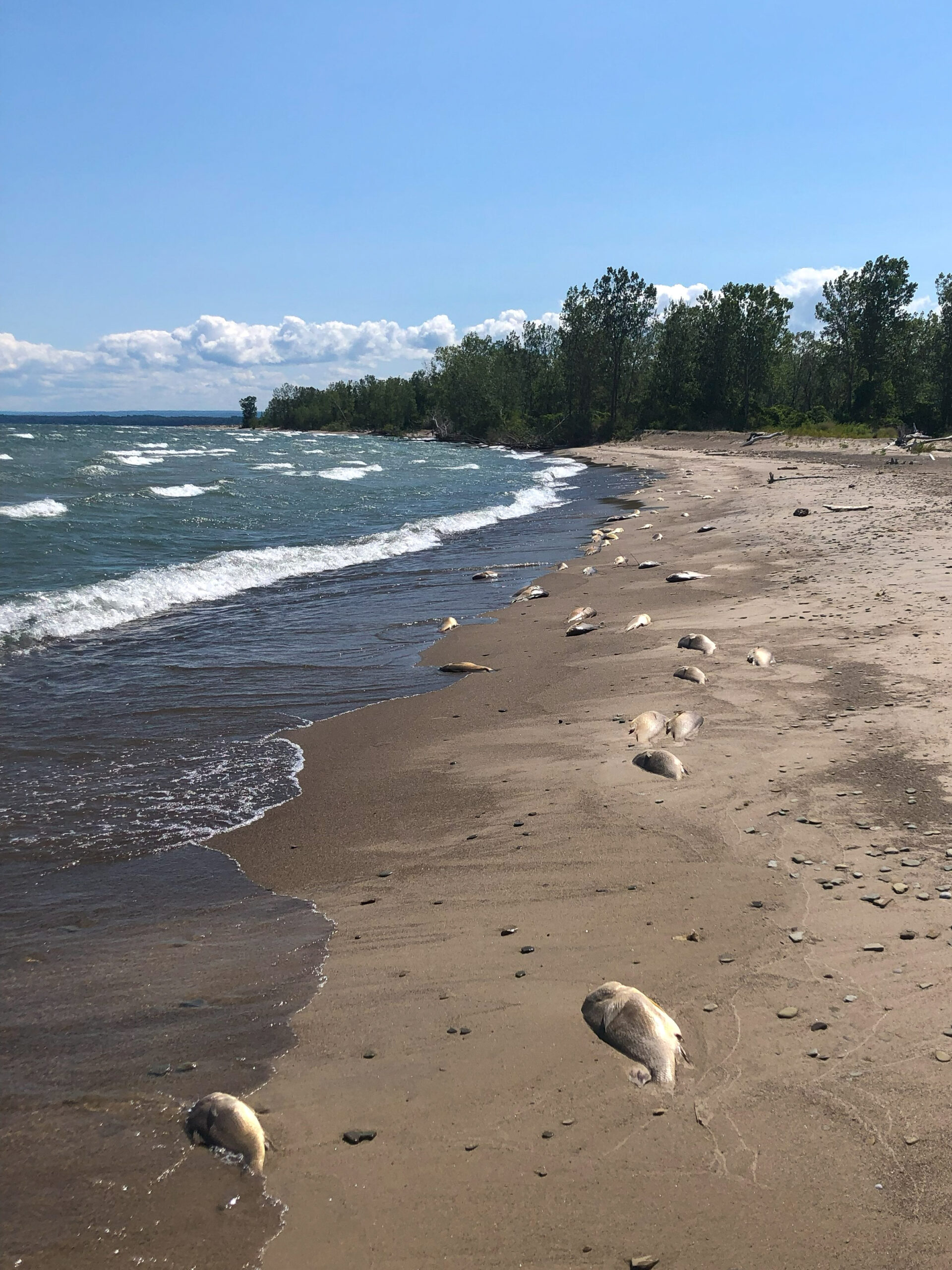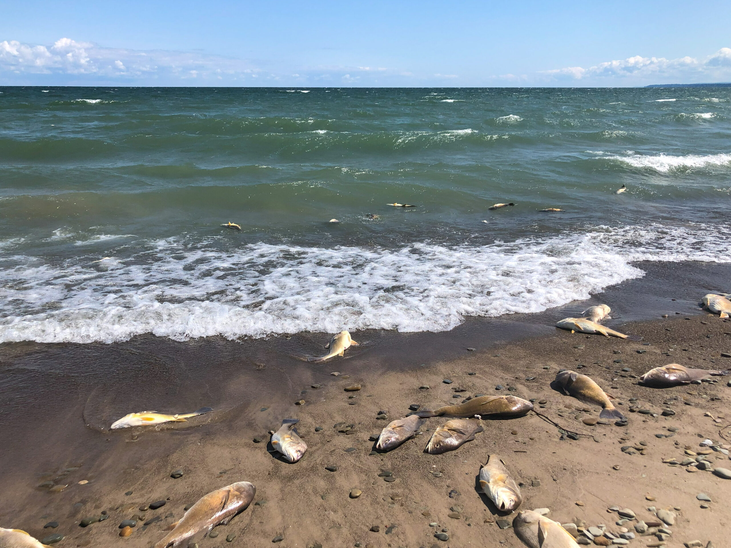 Preliminarily, this was attributed to hypoxic upwelling, where weather conditions (e.g., recent very windy weather) force de-oxygenated water up to the lake surface and fish closer to shore, where they suffer from hypoxia, leading to death by lack of oxygen.
