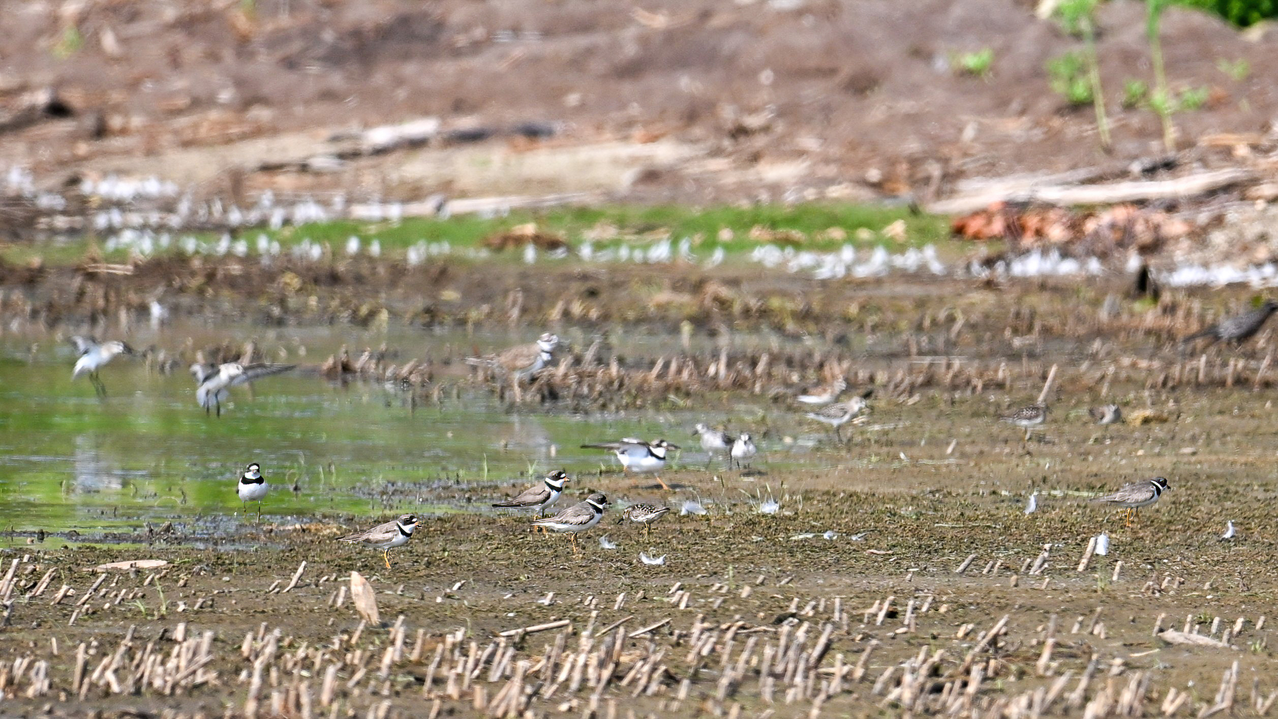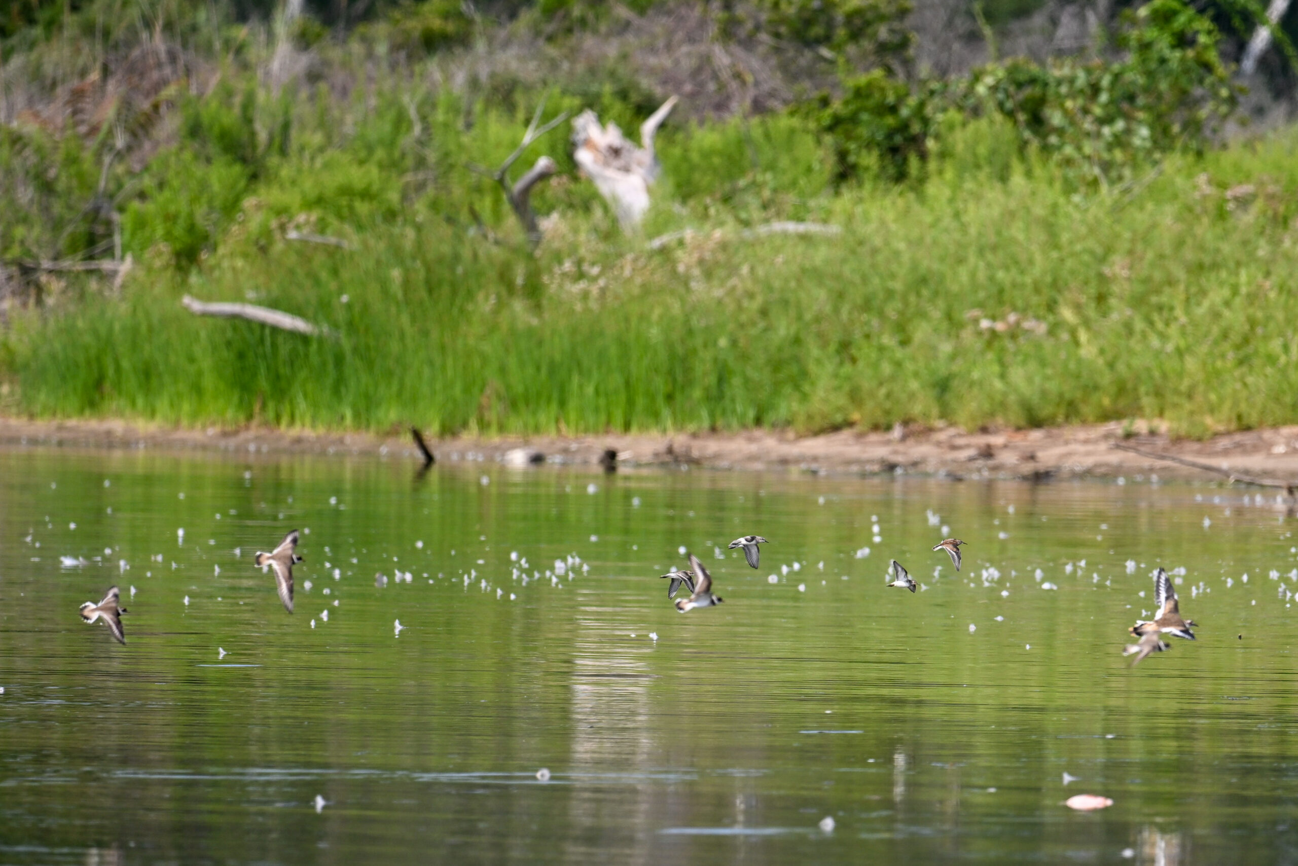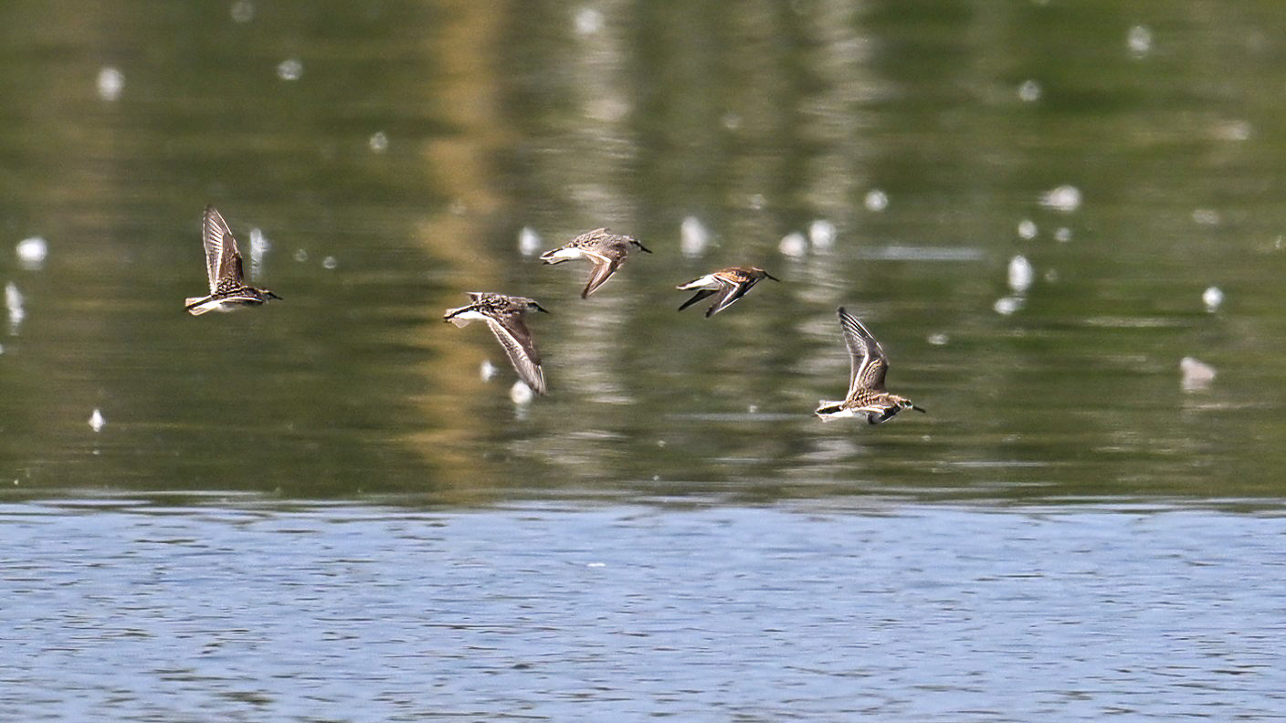 [Editor’s note: mixed small shorebirds in flight above – Least Sandpiper, Semipalmated Sandpiper, & Semipalmated Plover.]