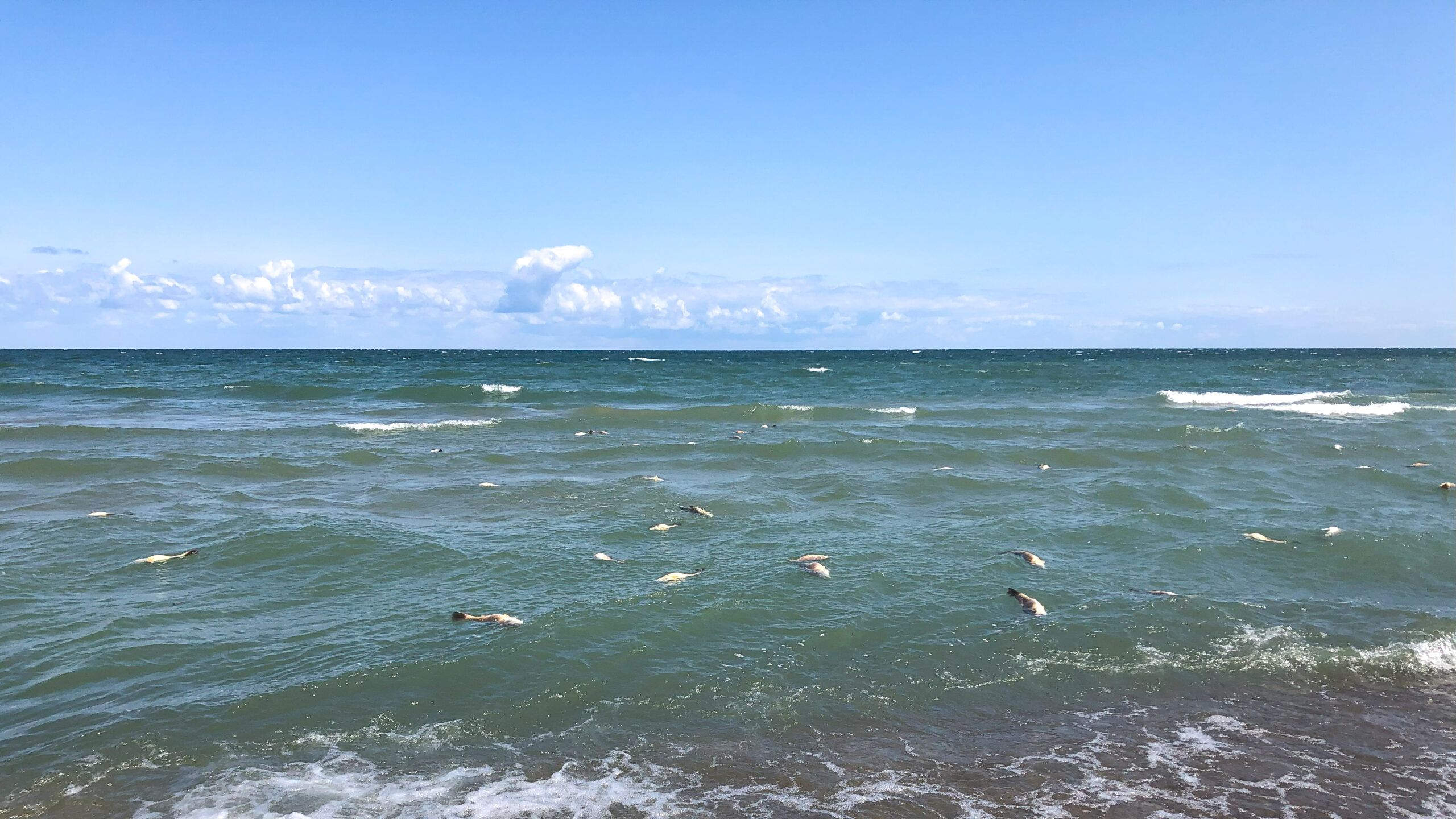 Dead fish cleanup crew IIView of dead fish on Budny BeachFish food for gullsDead fish on beach and in surfView down-beach w/ dead fishDead fish (sheepshead?) detailMore fish food for gullsDead fish in surf IIFish food for gulls IIIDead fish in surf IIIEast end of Budny BeachDead perchDead fish in surf IVView towards Gull Point (horizon, left)