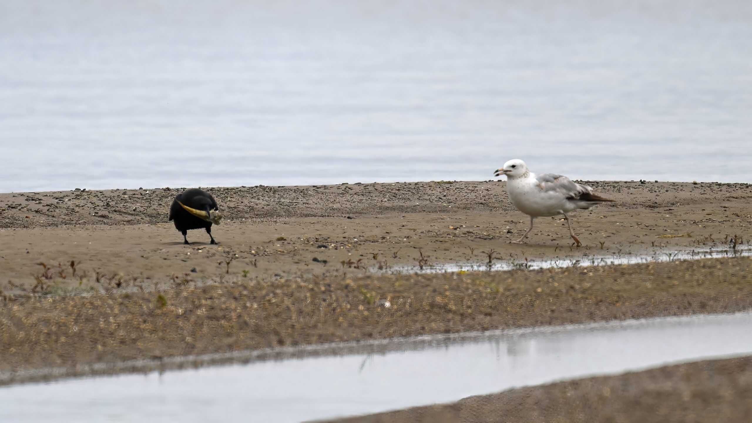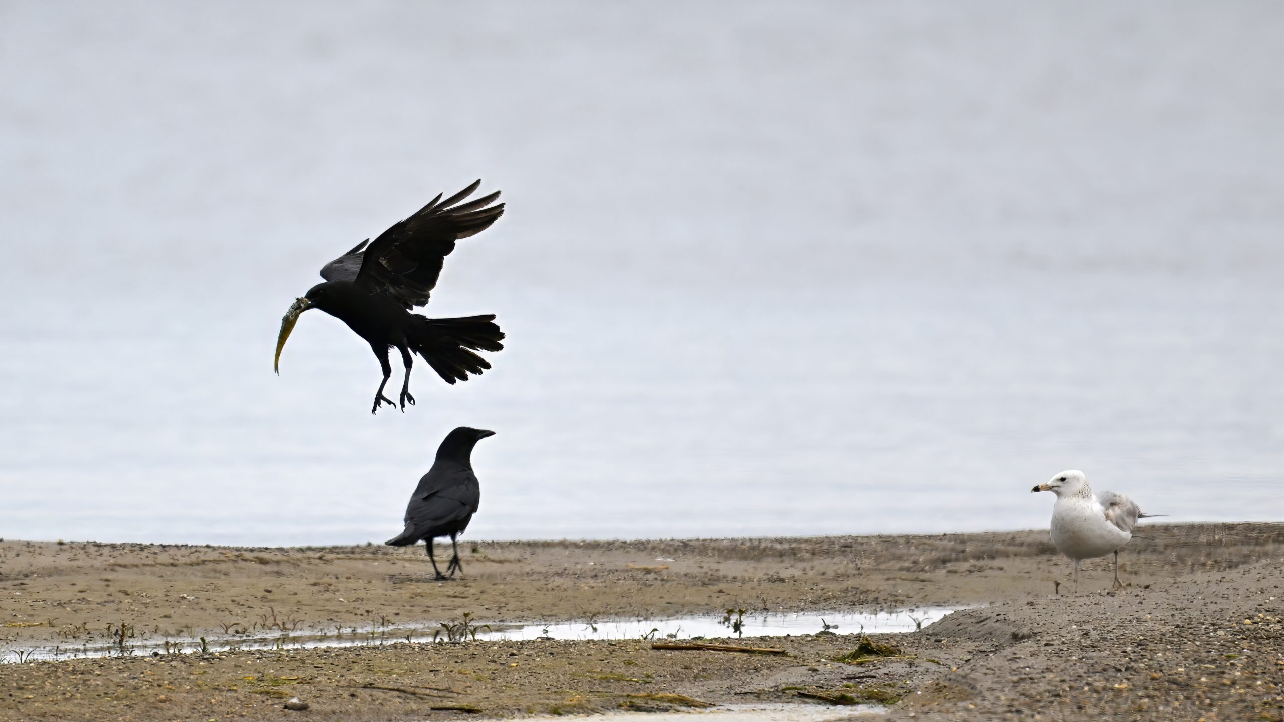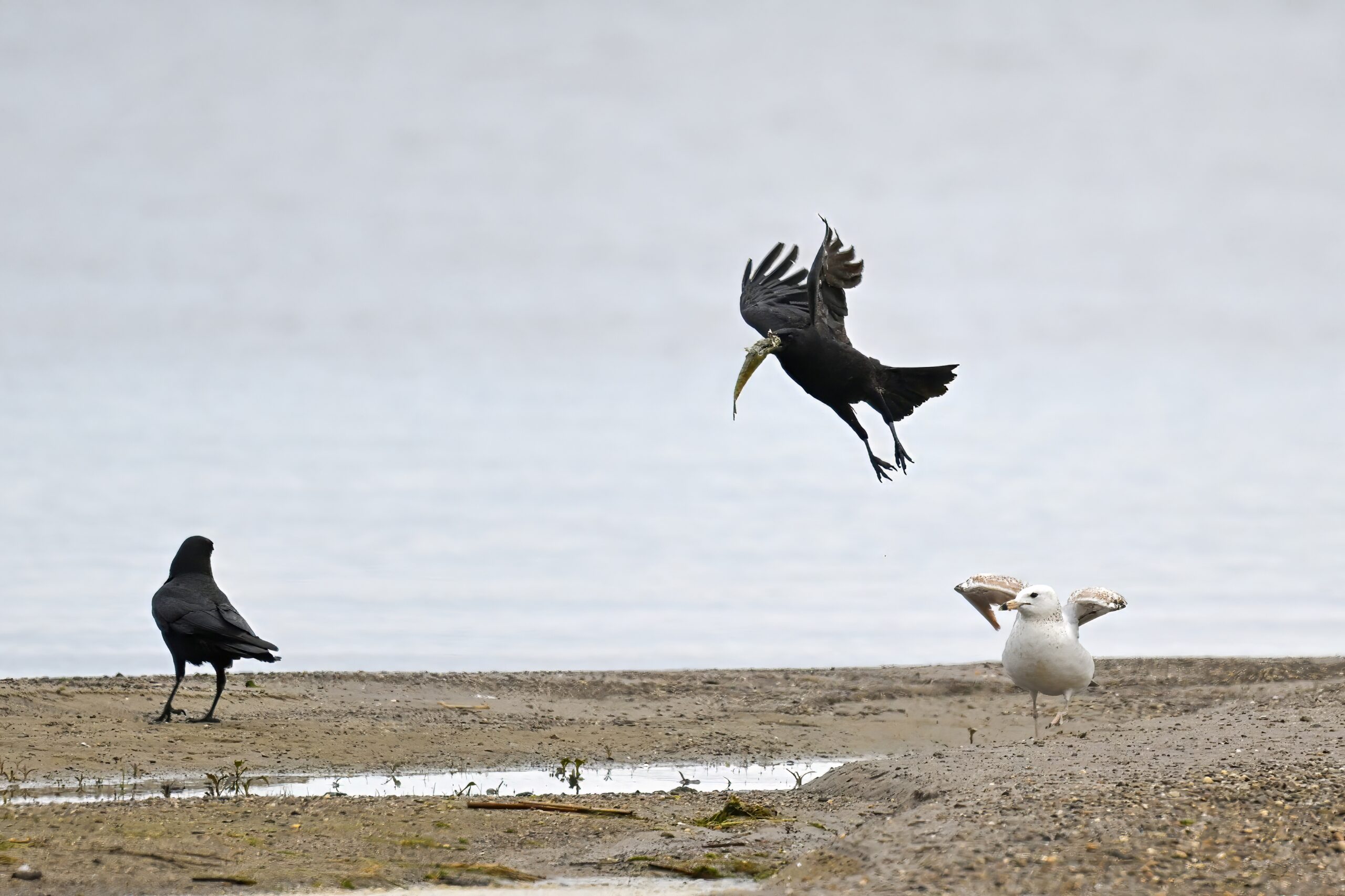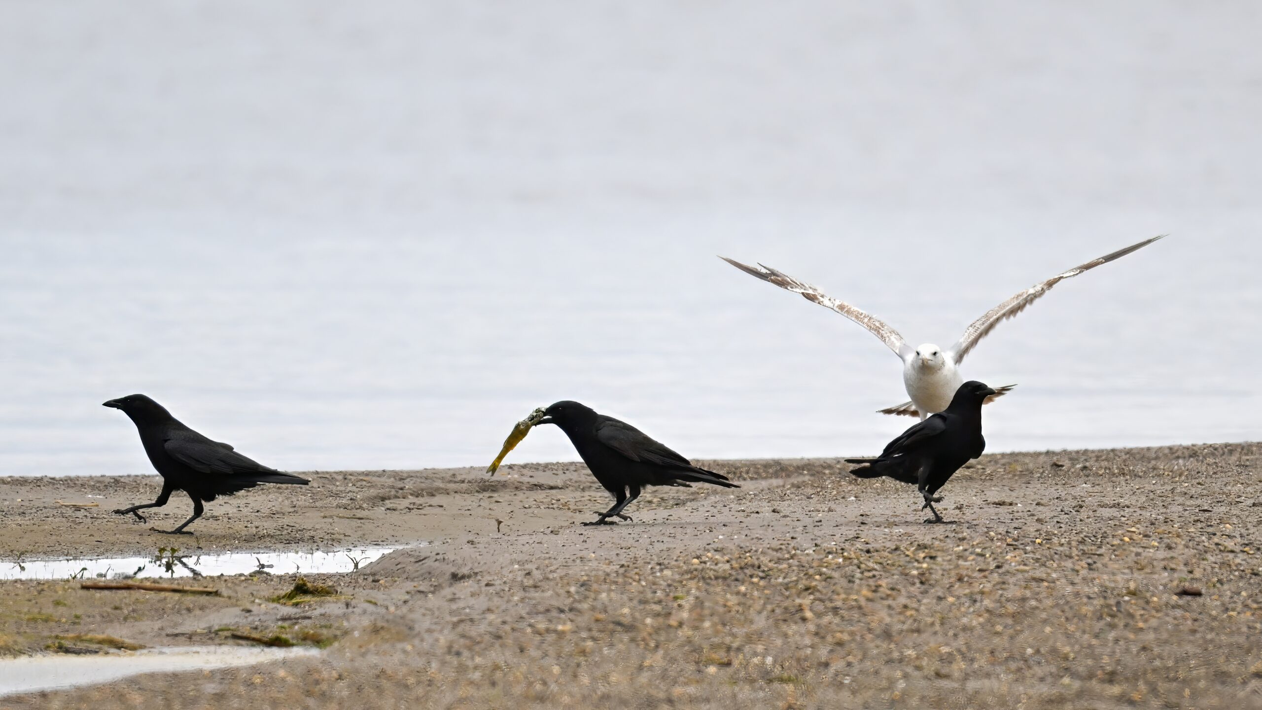 In part 2, it’s an American Crow w/ fish scrap vs. Ring-billed Gull:
