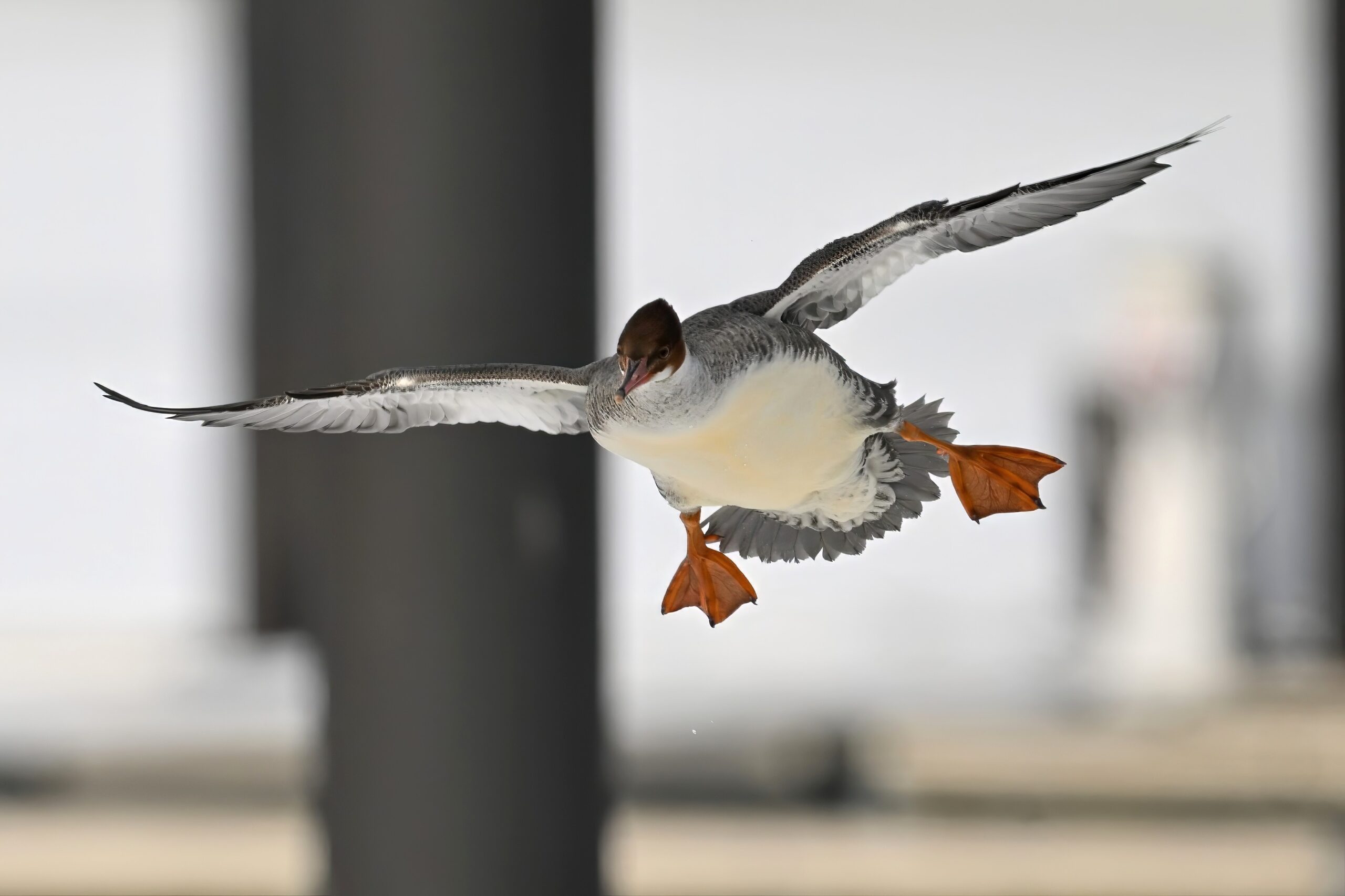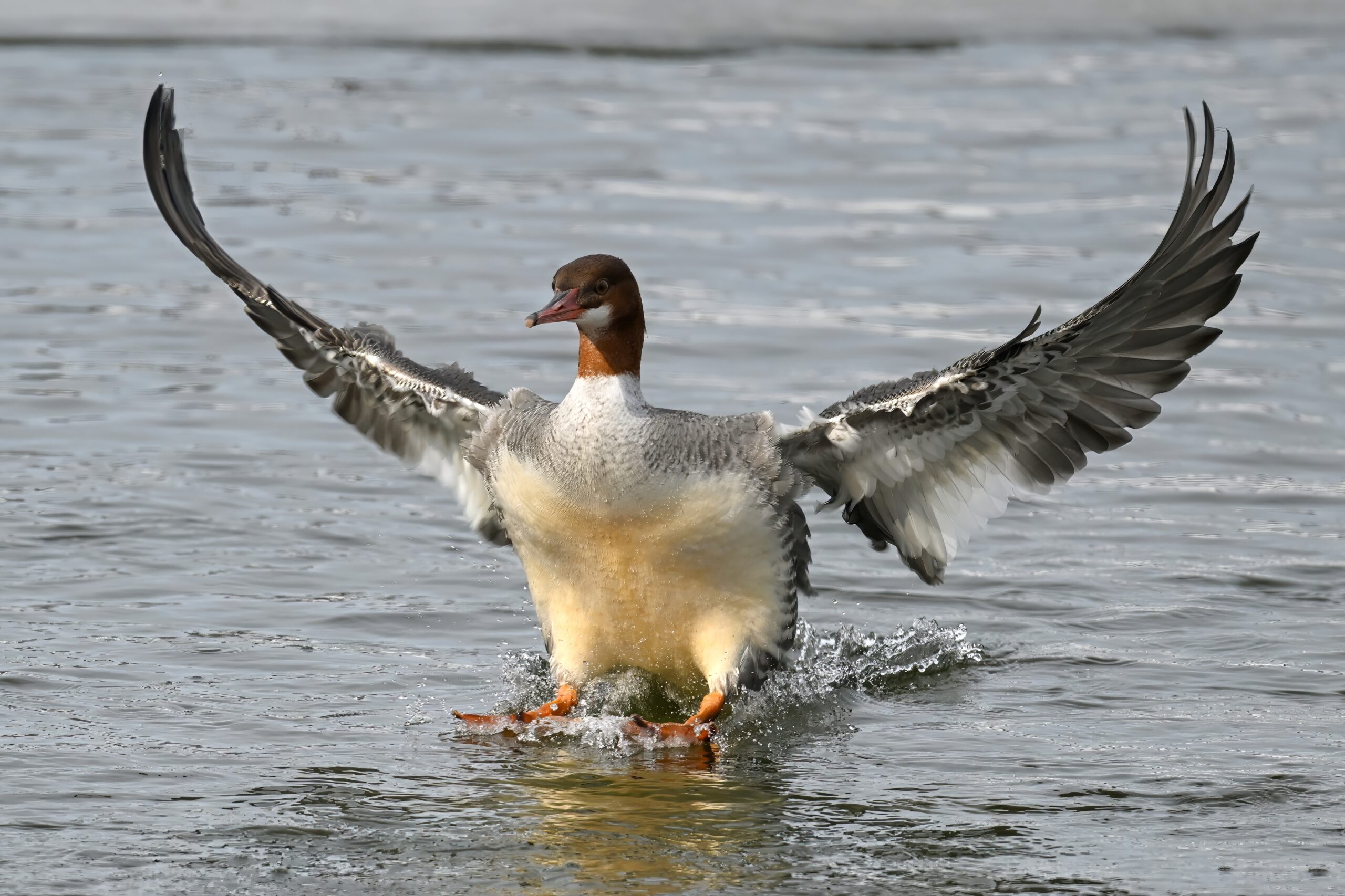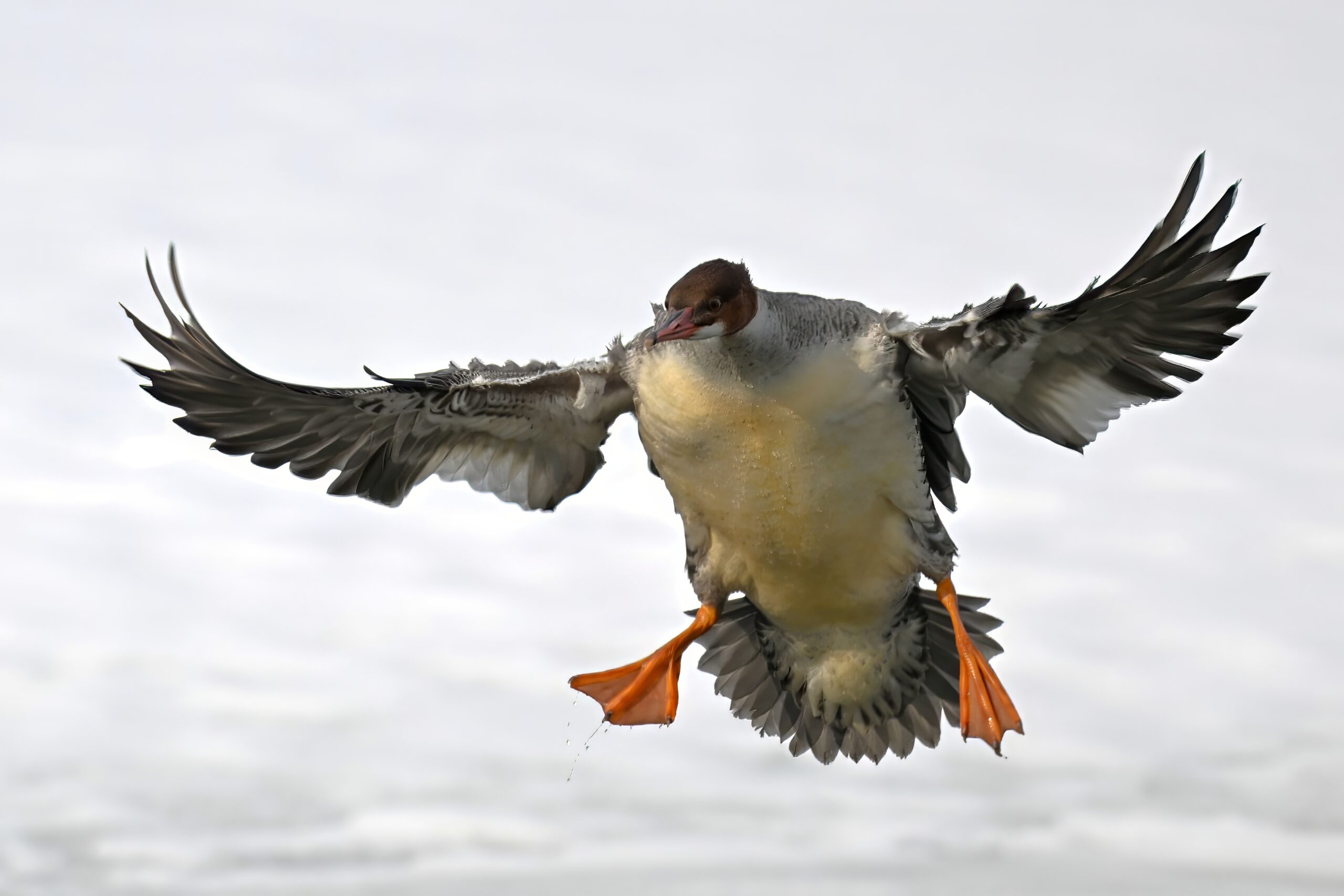 Nothing more fun in the world of bird photography than “landing ducks,” even with uneven lighting/exposure due to cloudy conditions. This is a female Common Merganser recently seen at Presque Isle Marina, in chronological order: