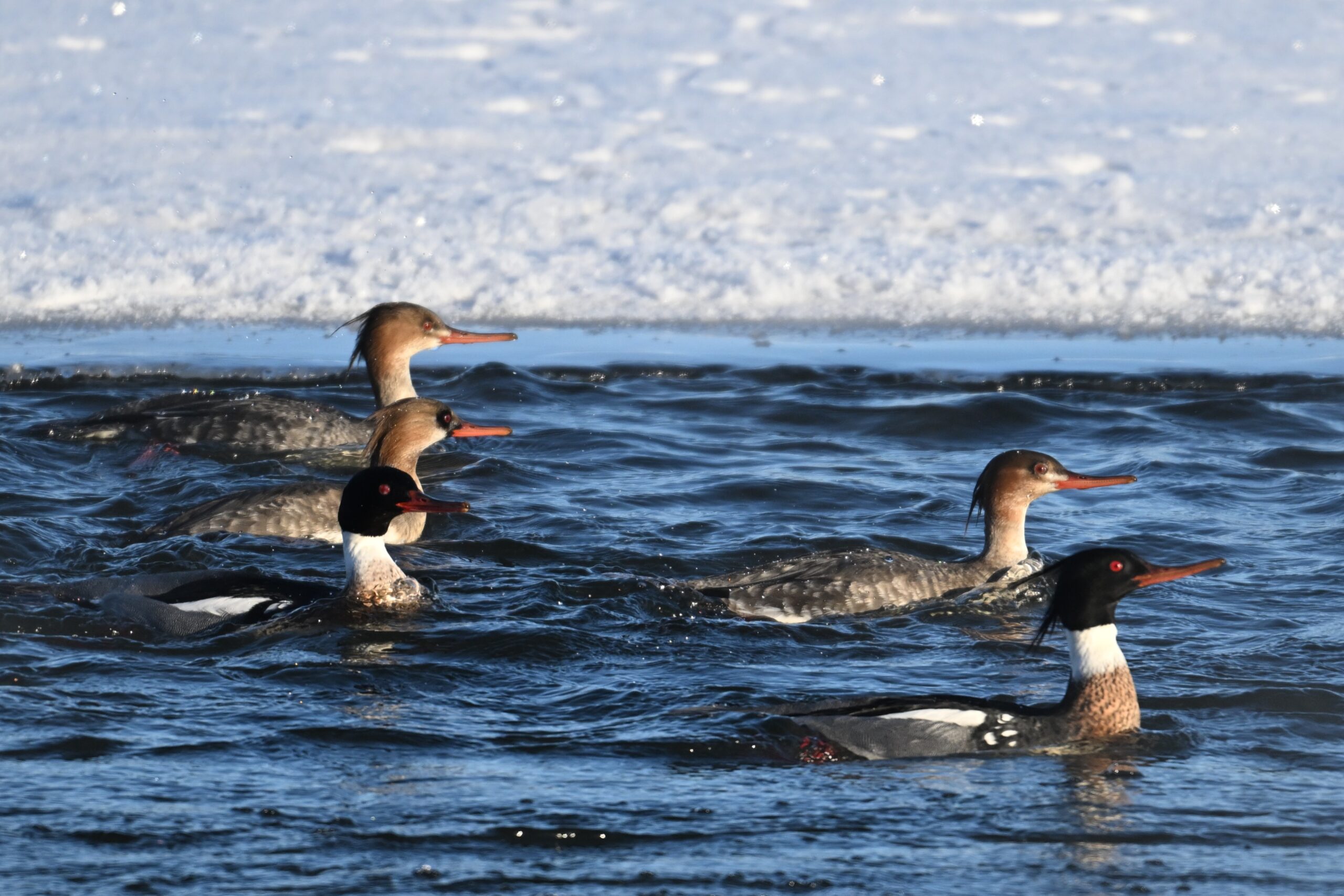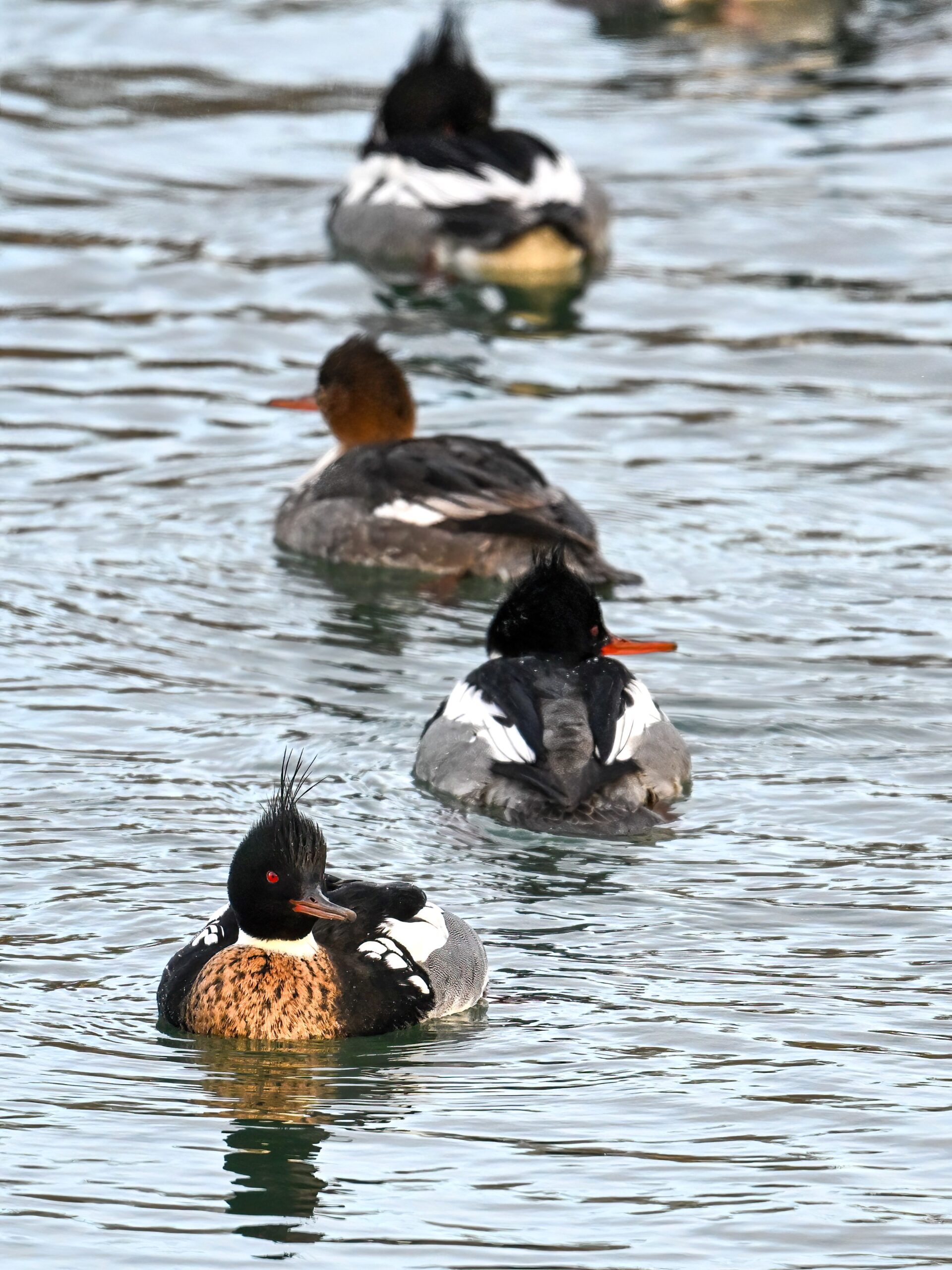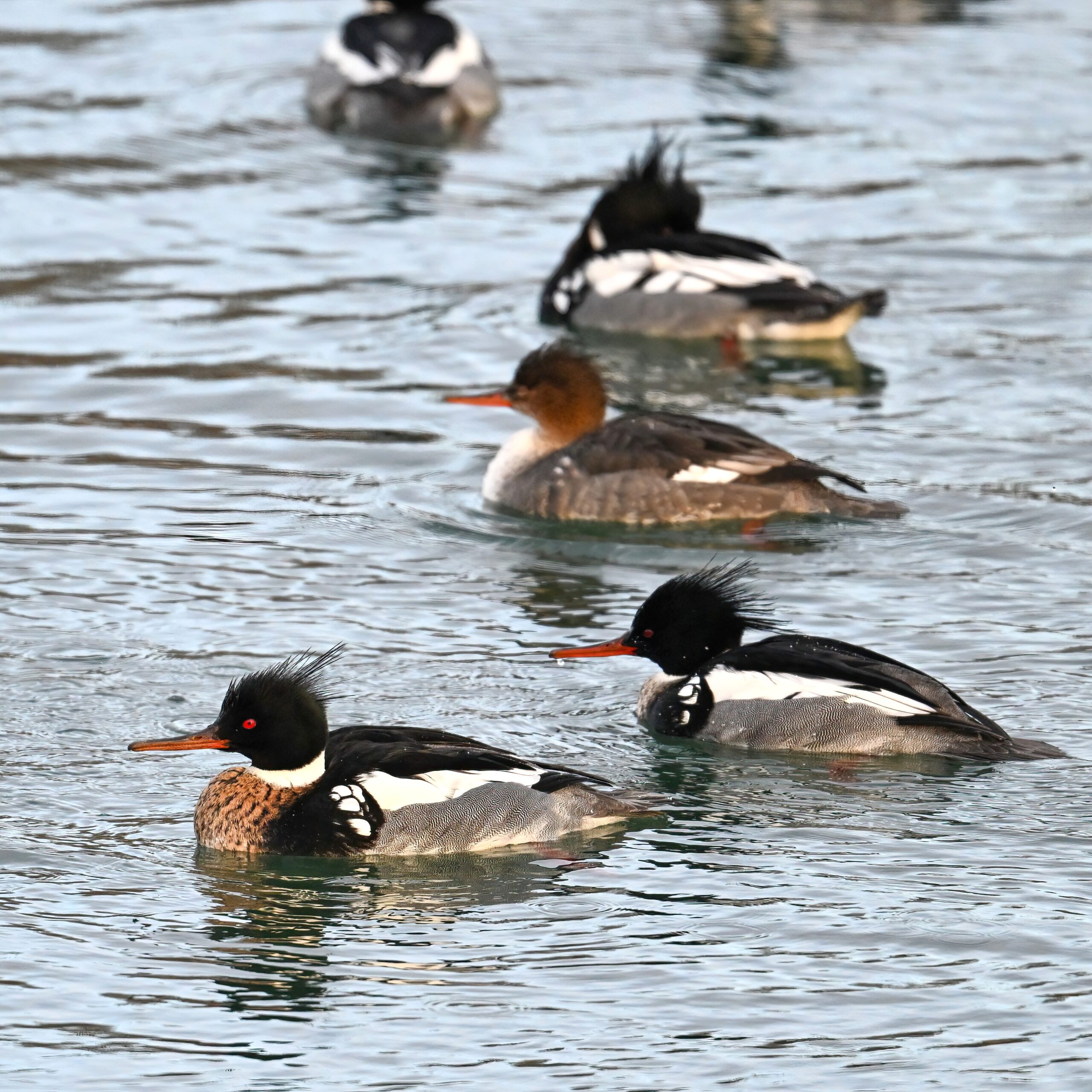 If birding the greater Erie, Pennsylvania bayfront area this time of year, likely to see many beautiful Red-breasted Mergansers, like these mostly males at South Pier: