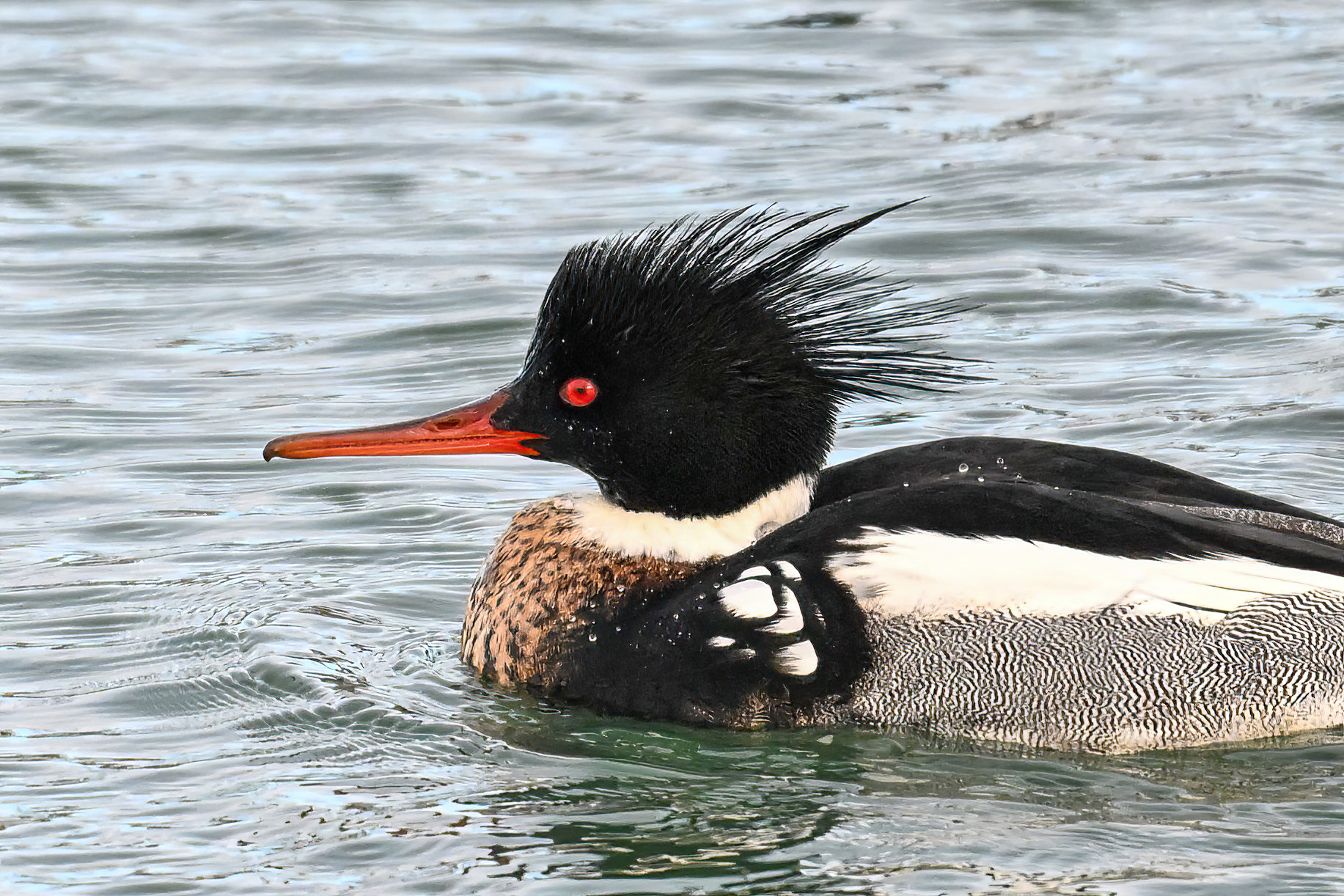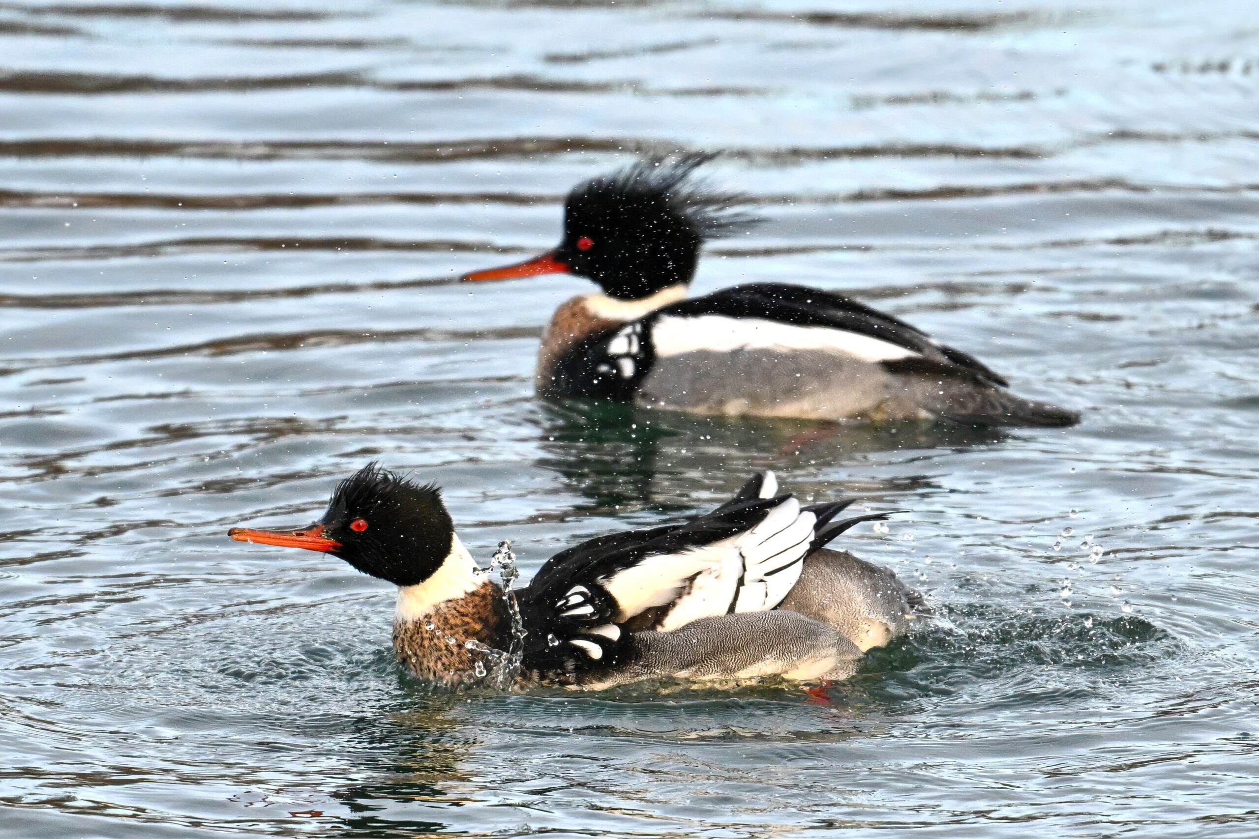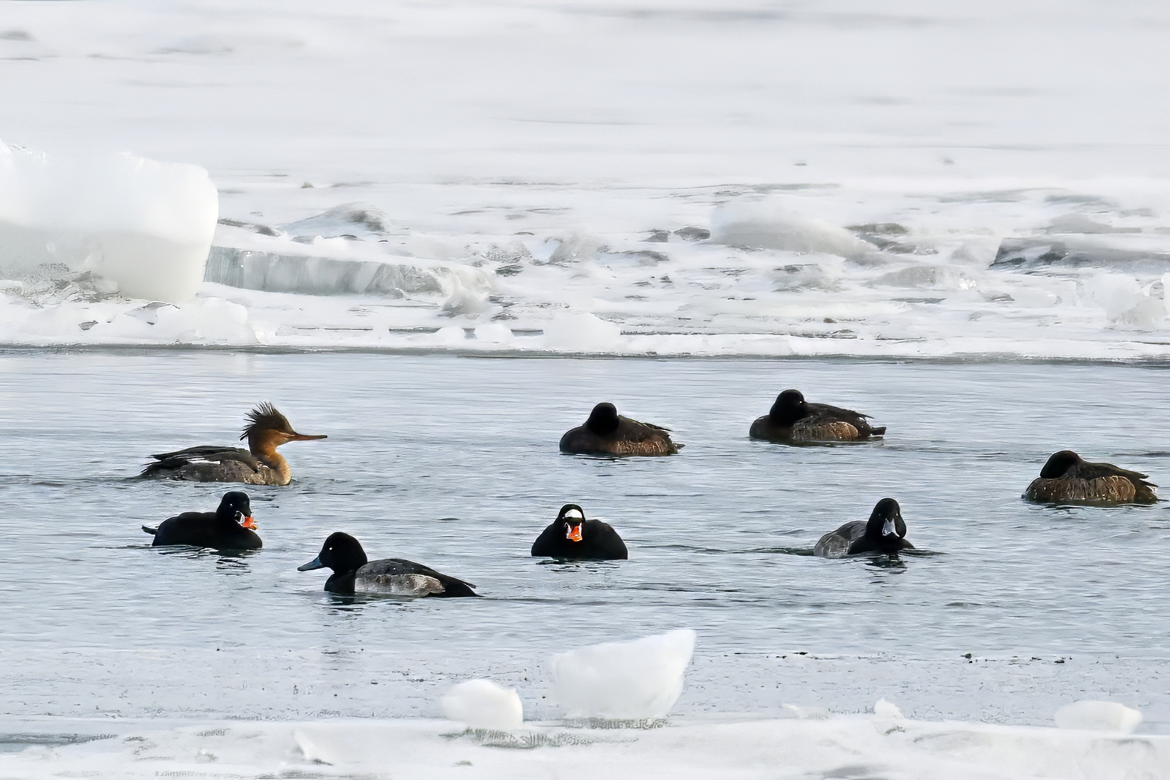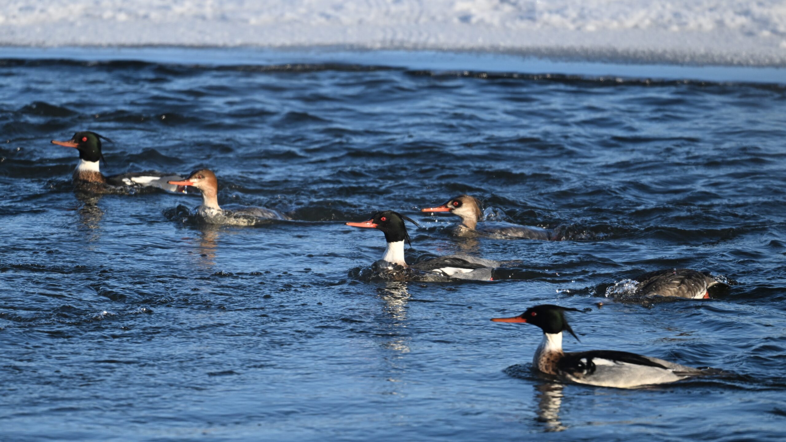 If birding the greater Erie, Pennsylvania bayfront area this time of year, likely to see many beautiful Red-breasted Mergansers, like these mostly males at South Pier: