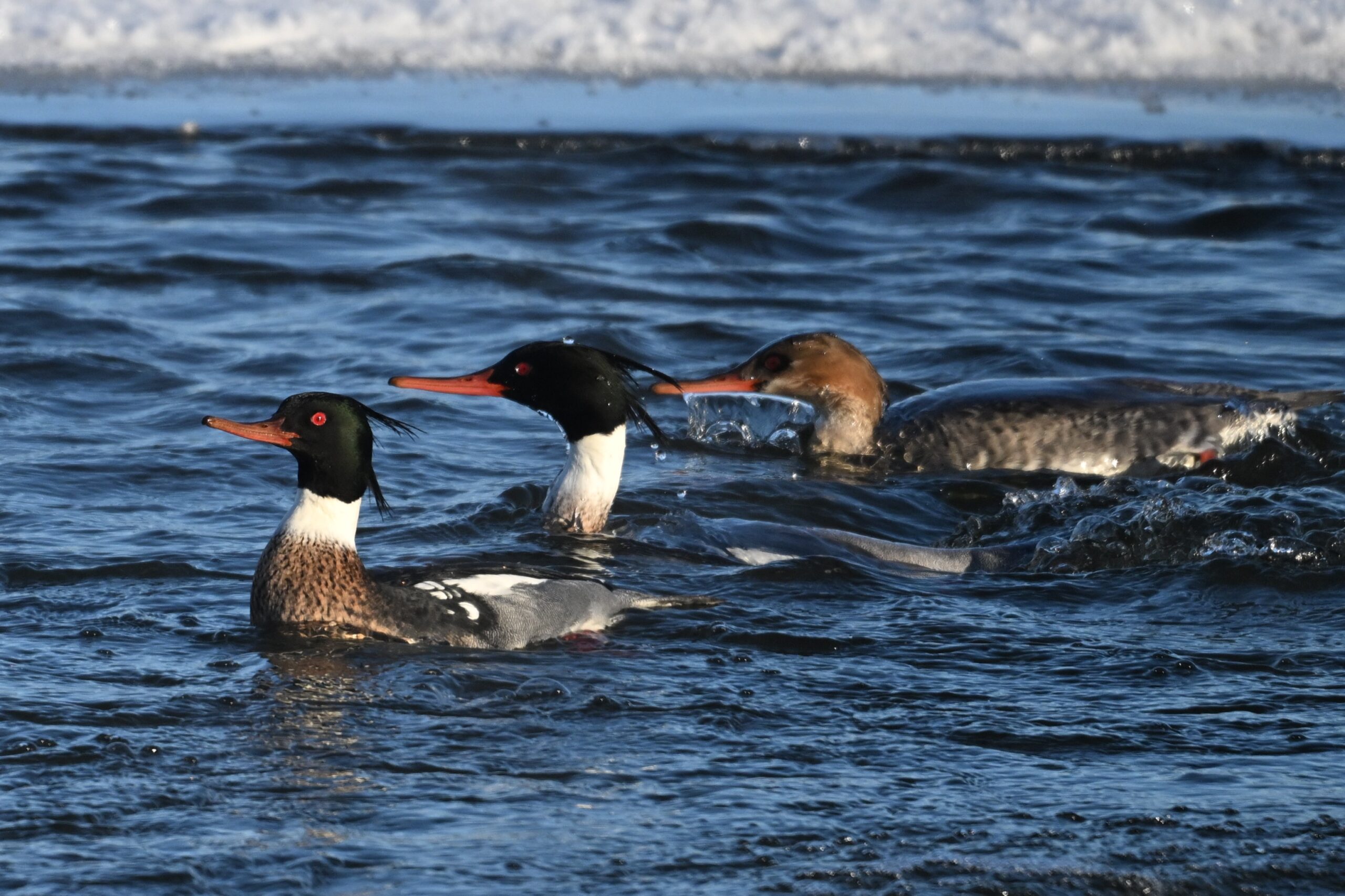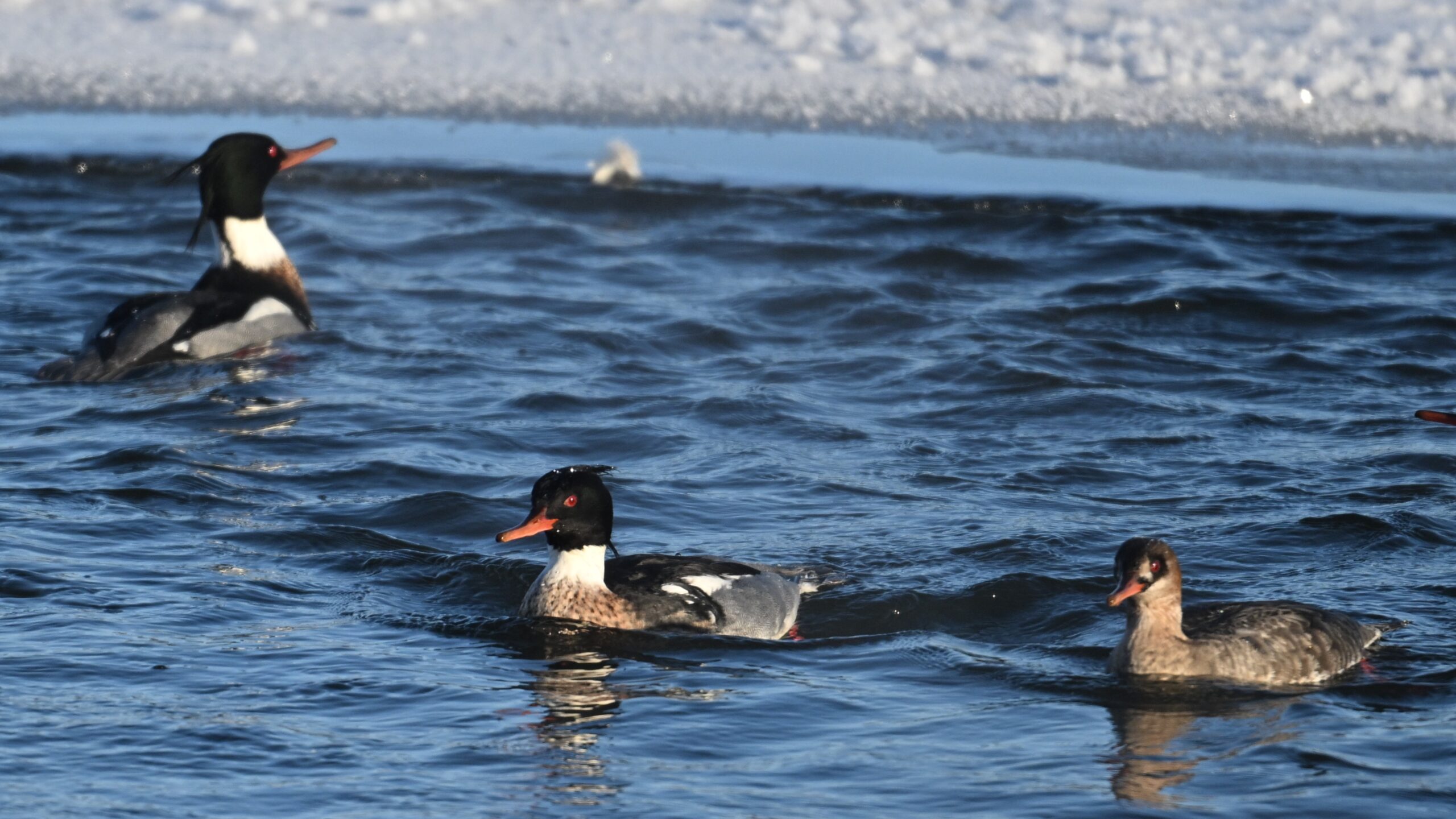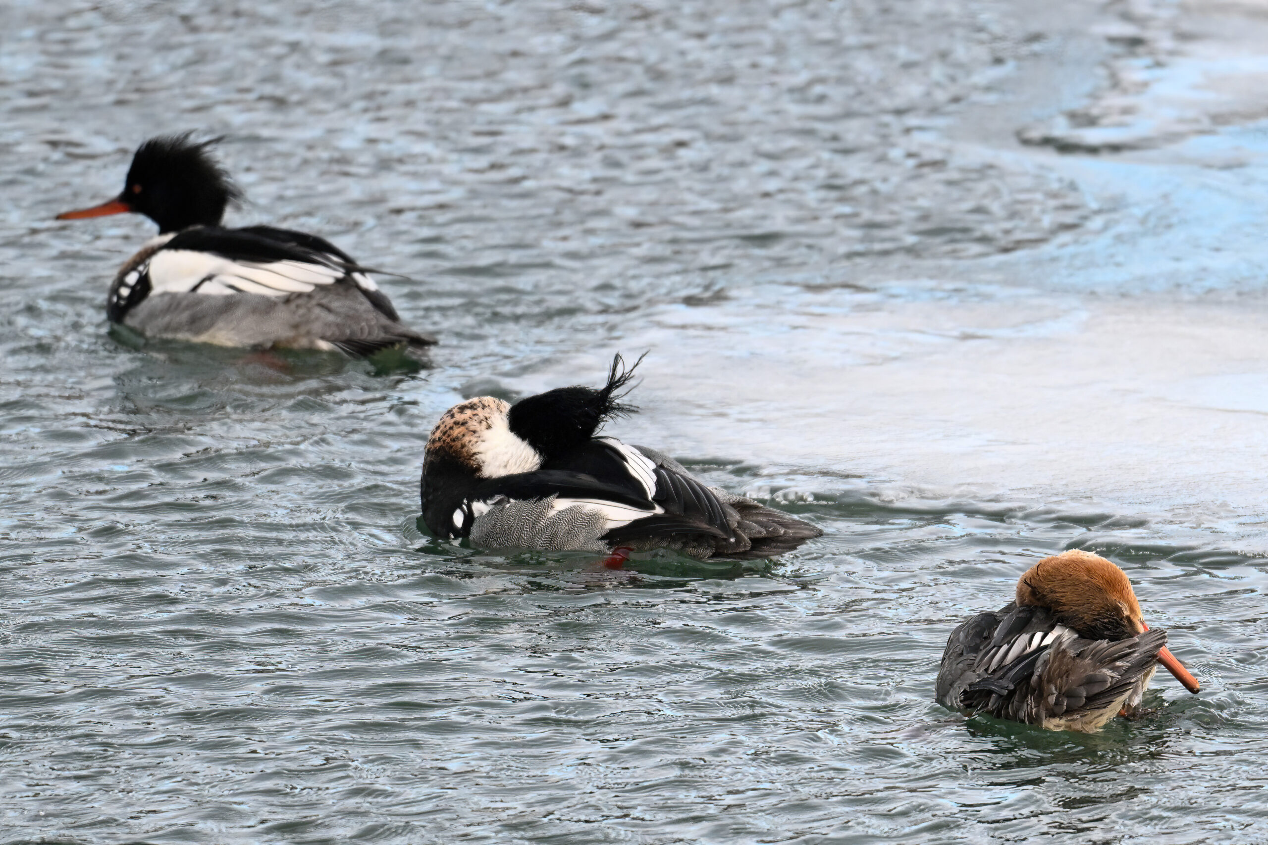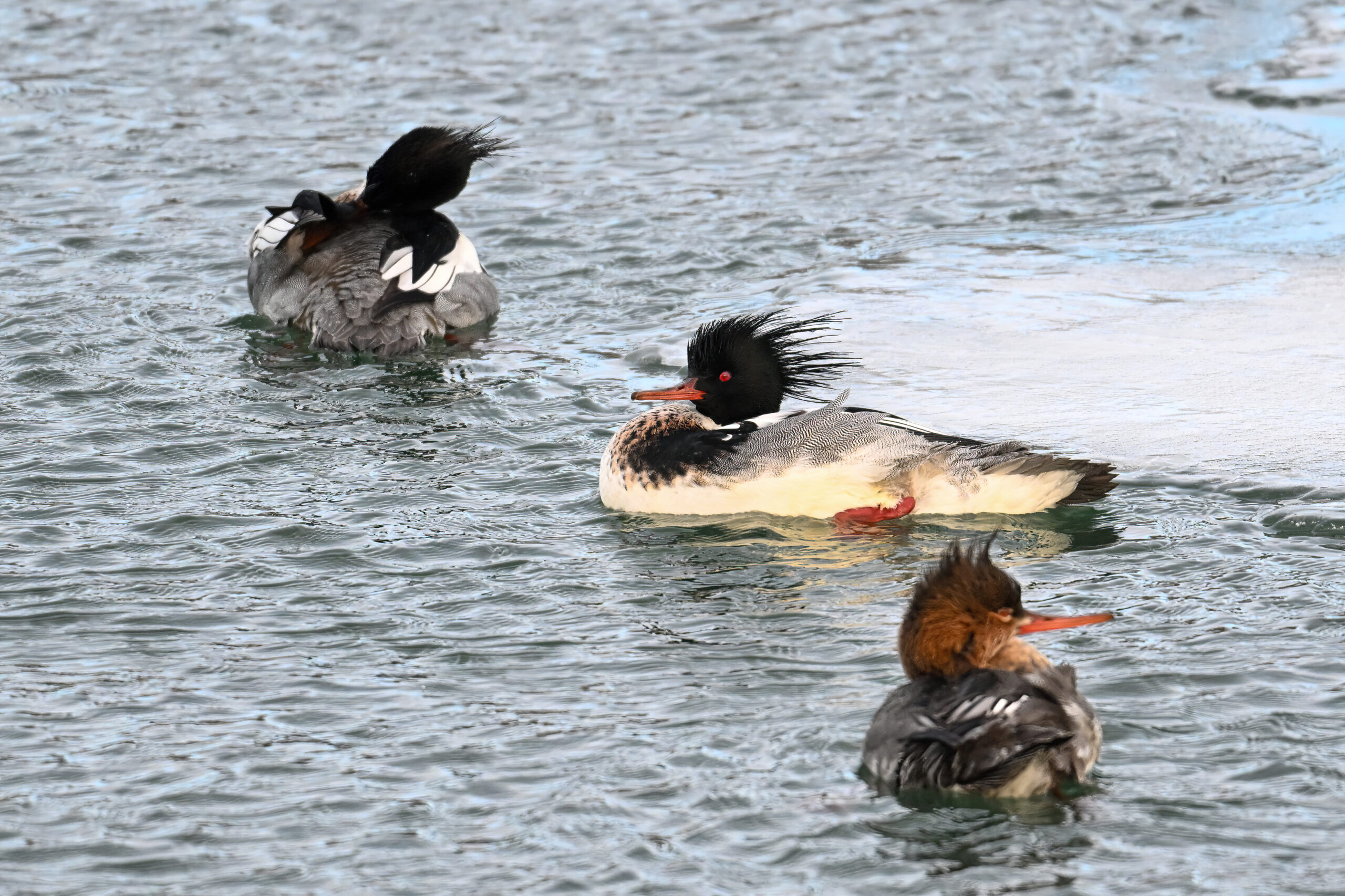 Male, female, & immature Red-breasted Merganser: