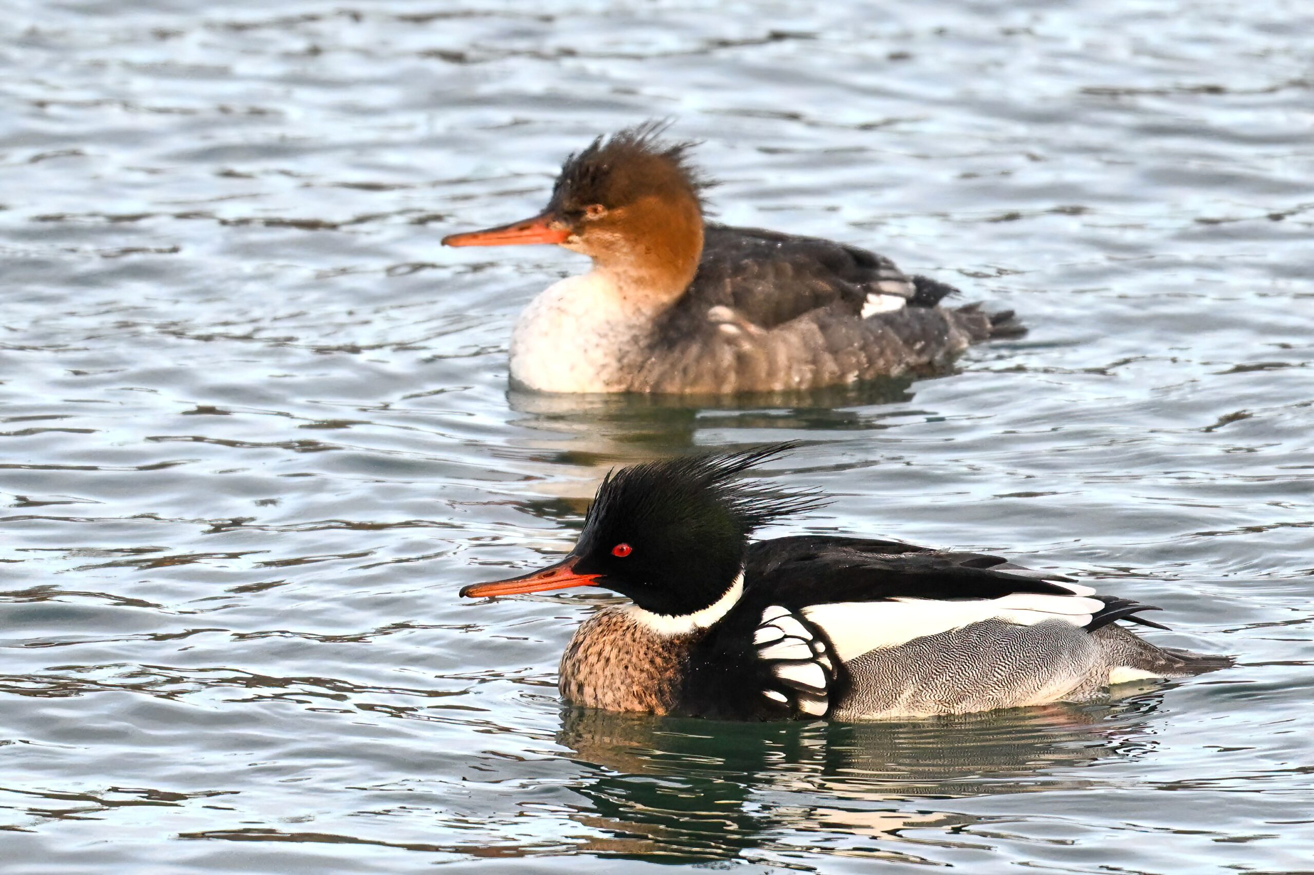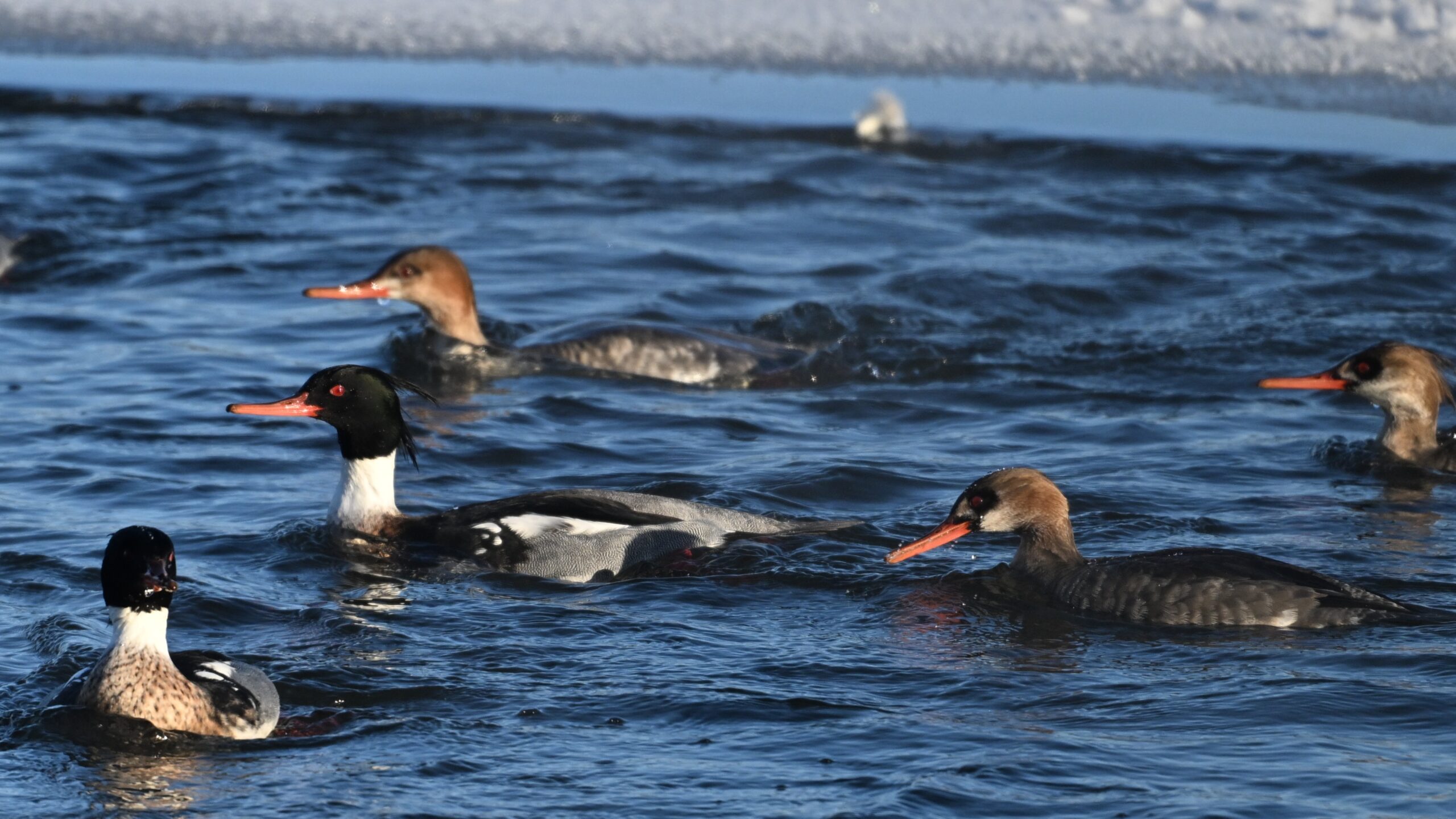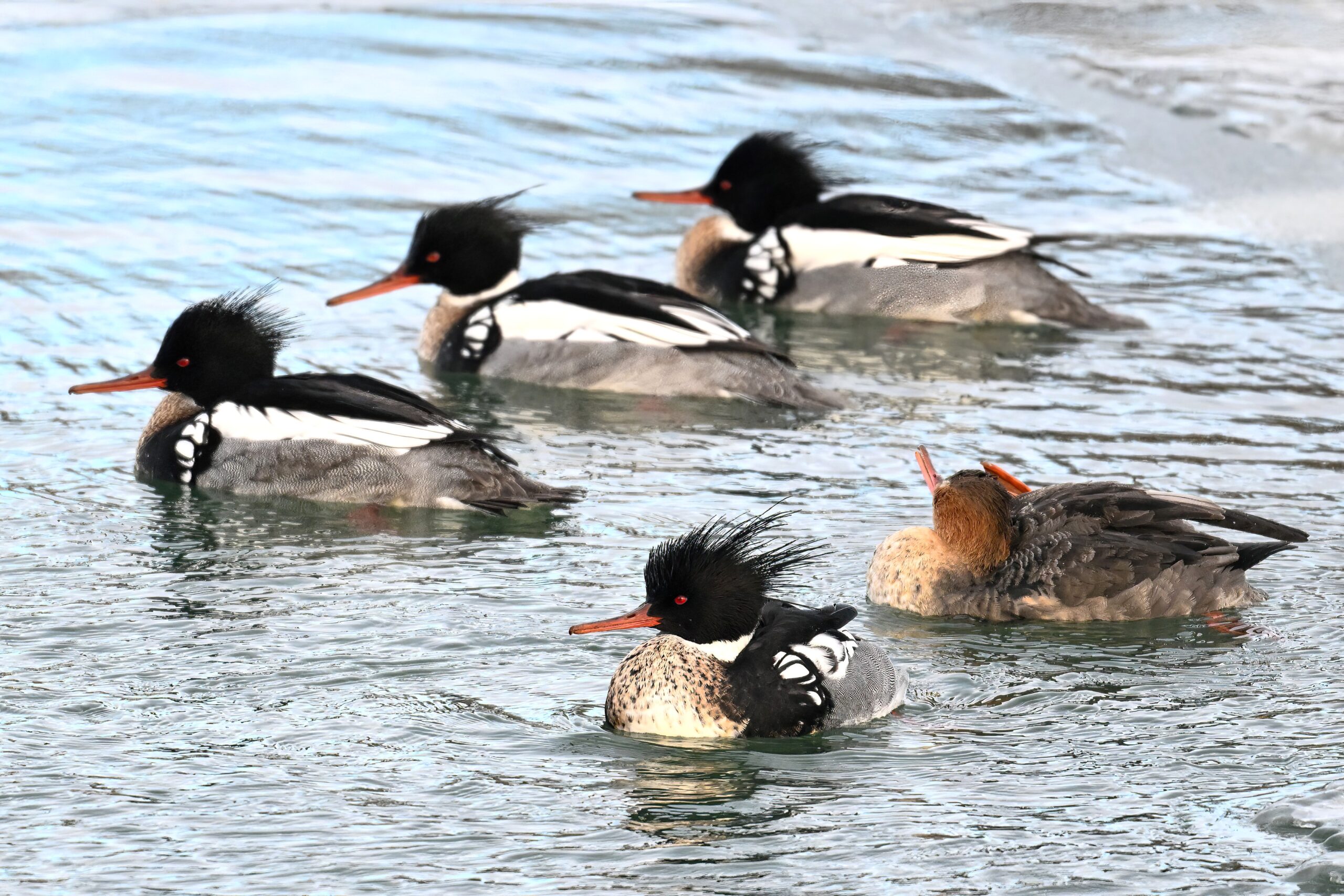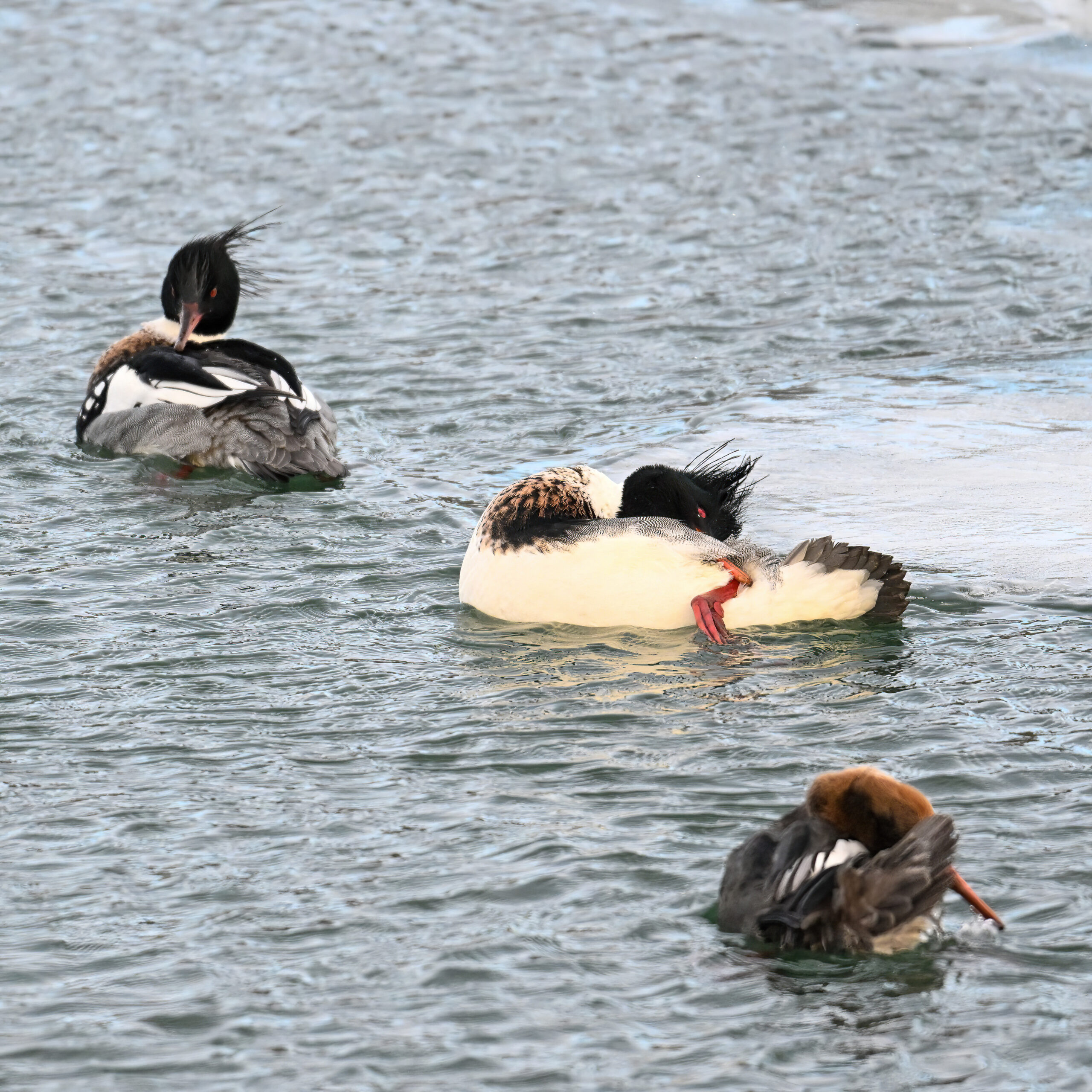 Male, female, & immature Red-breasted Merganser: