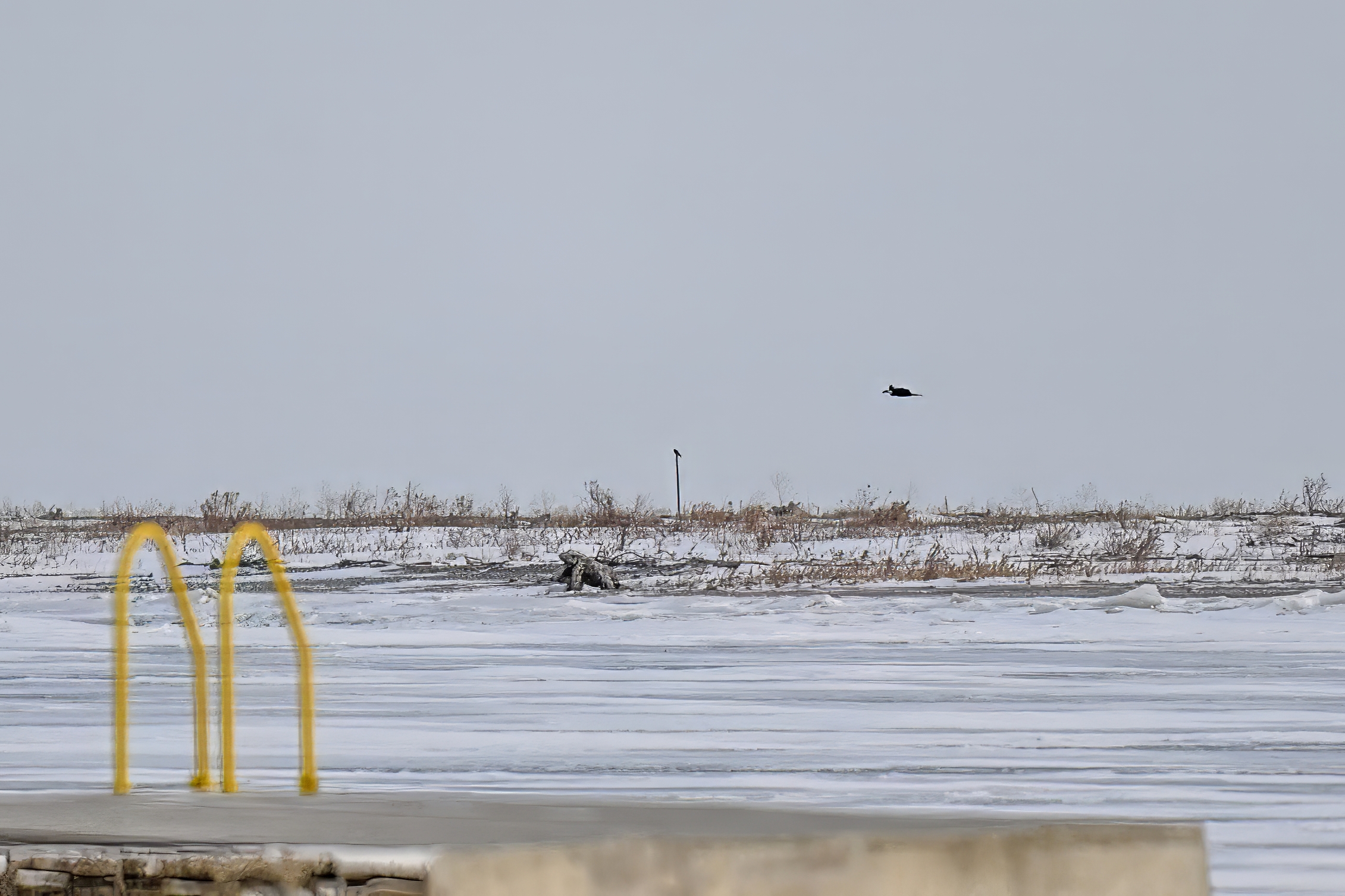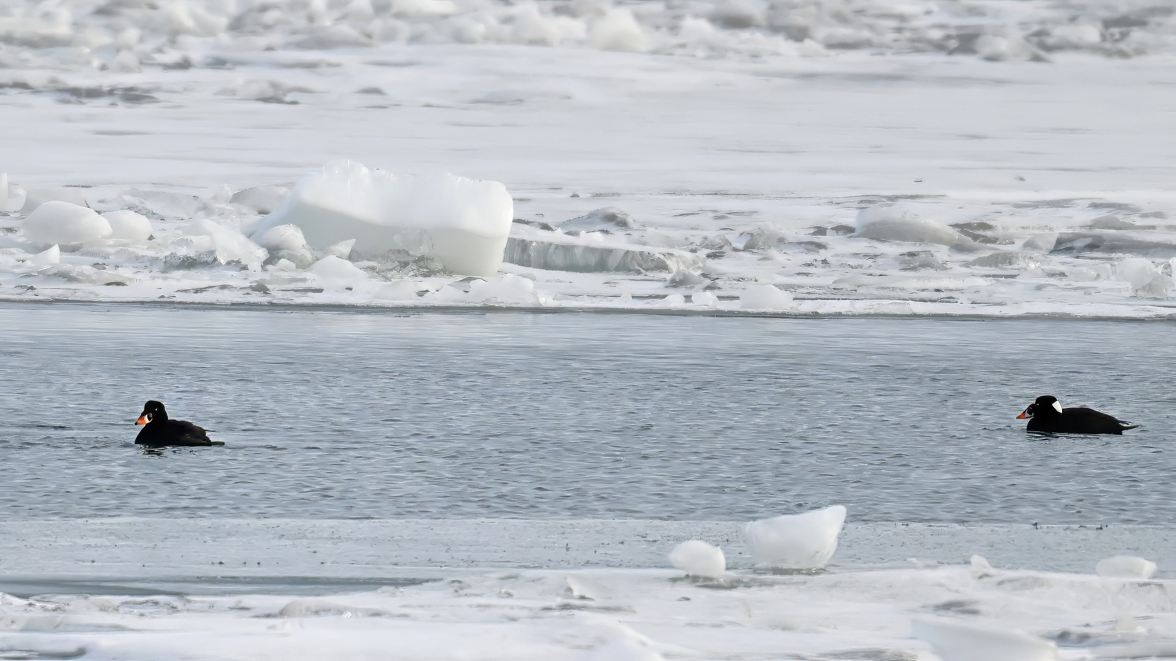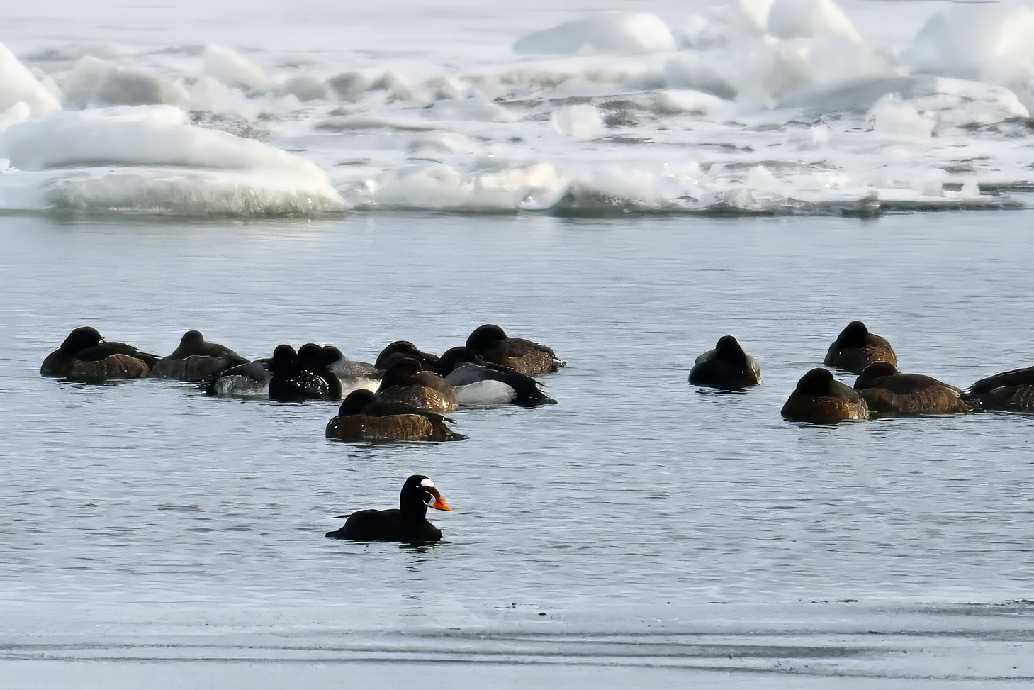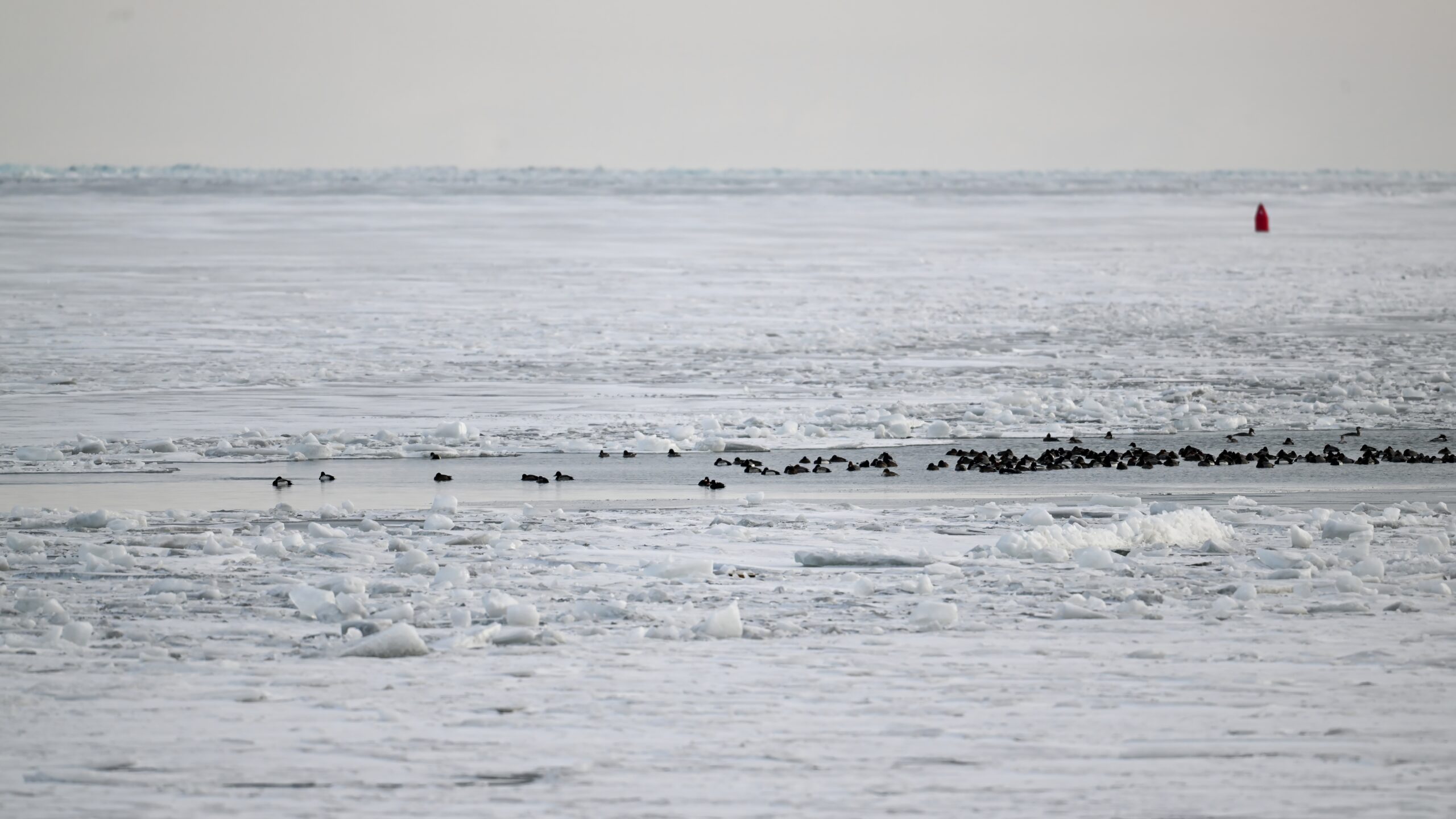 Today’s digital photographs are from South Pier the other early, cold morning, mostly looking east towards outer Lake Erie/Thompson Bay, featuring Surf Scoter and a great, if poorly lit, pair of Common Ravens: