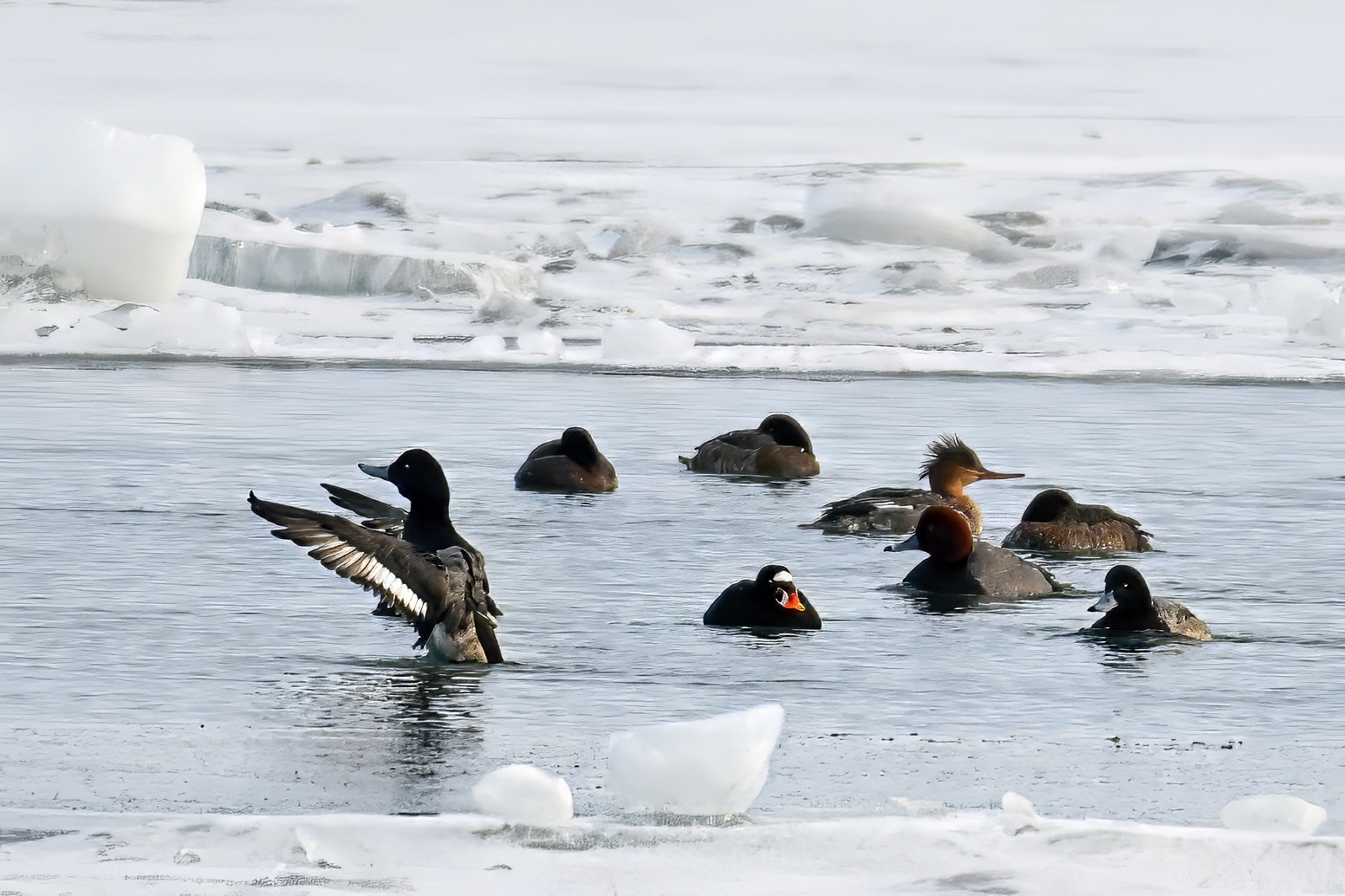 In Erie County, PA “birding news of interest,” pockets of open water appeared once again around the North Pier/South Pier area this week, after a recent “near 100%” freeze-over due to cold temps. Open water = greatly increased seasonal waterfowl activity, including reported sightings yesterday/today of Surf Scoter and, early this morning, this rather unusual what’s probably a Hooded Merganser x Common Goldeneye hybrid:
