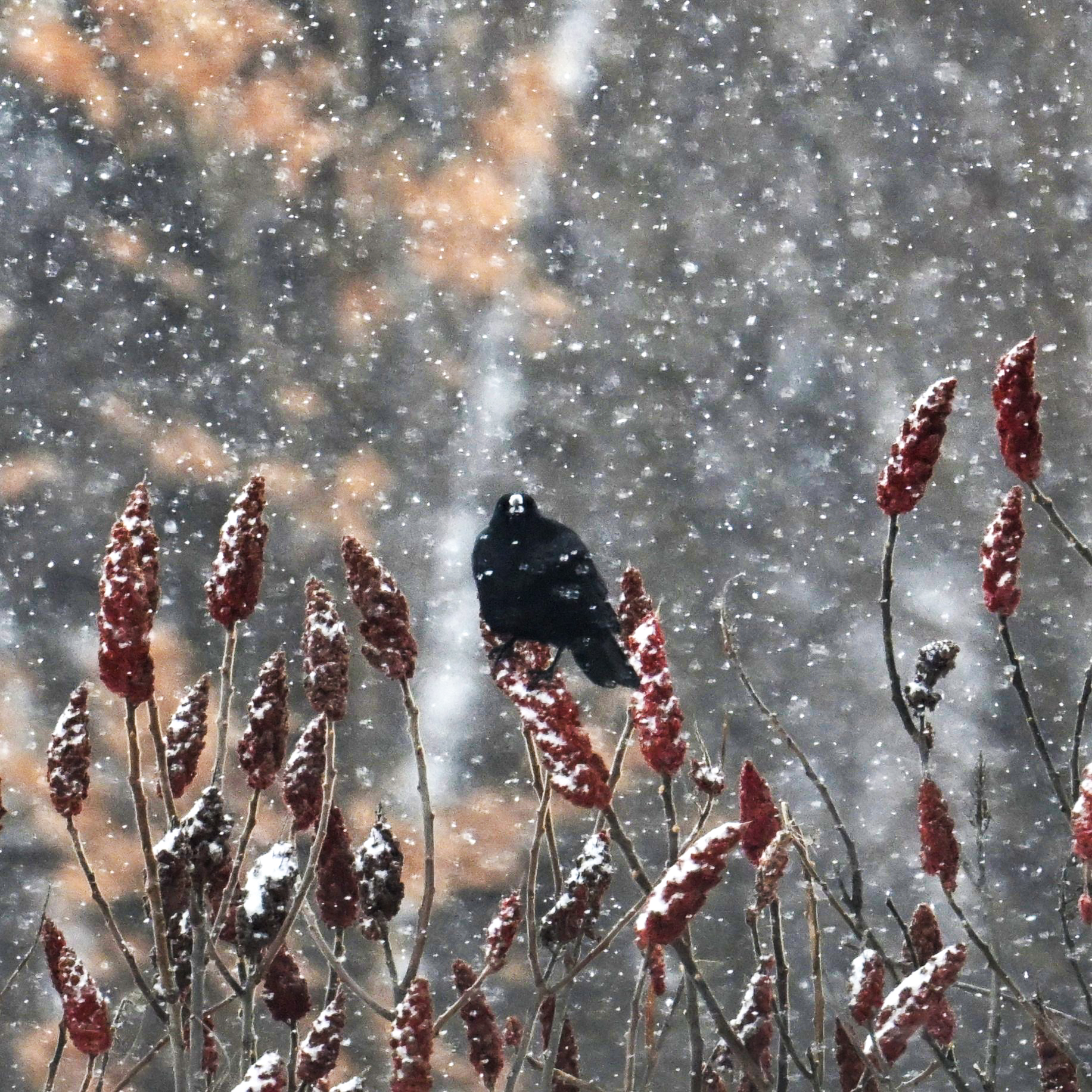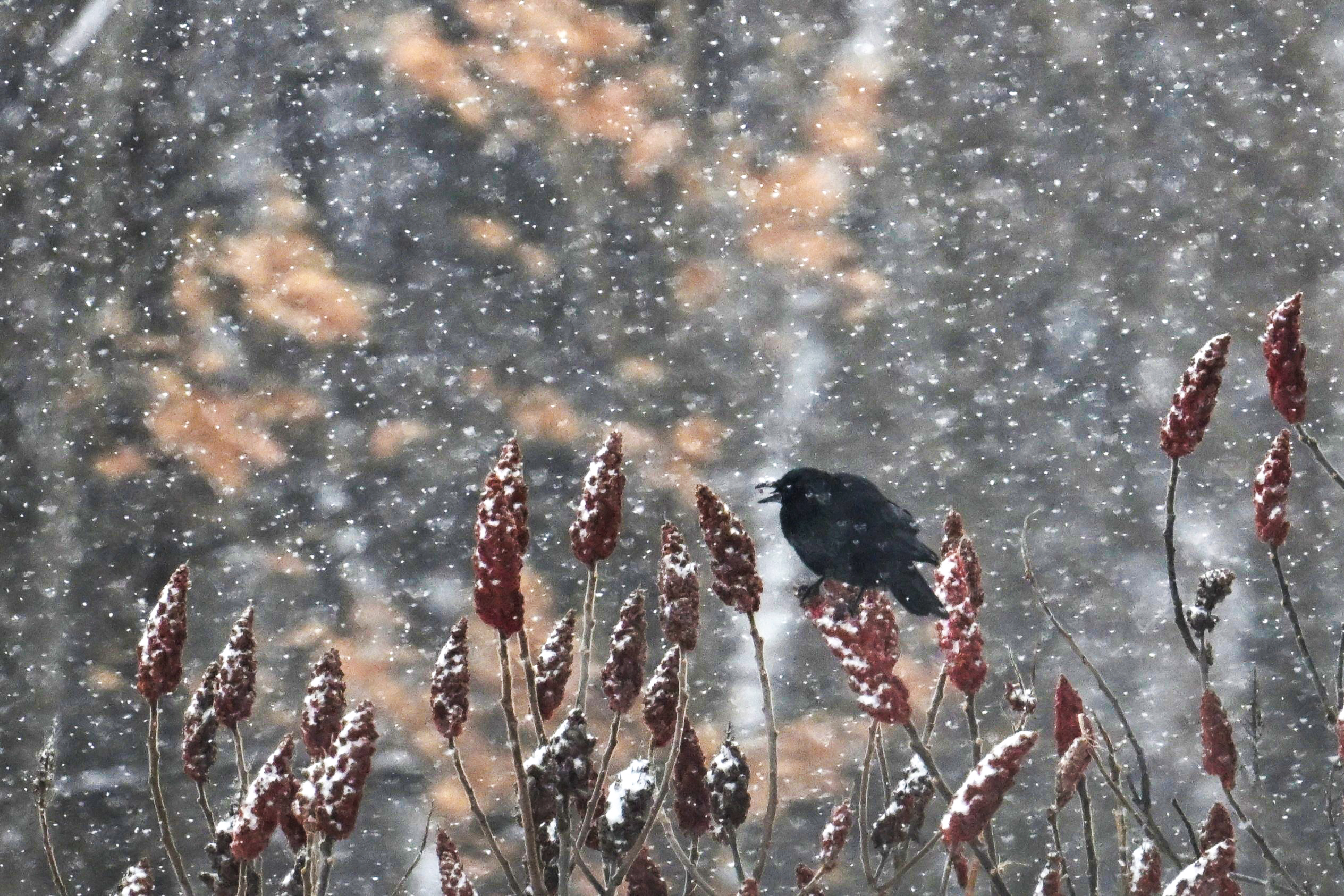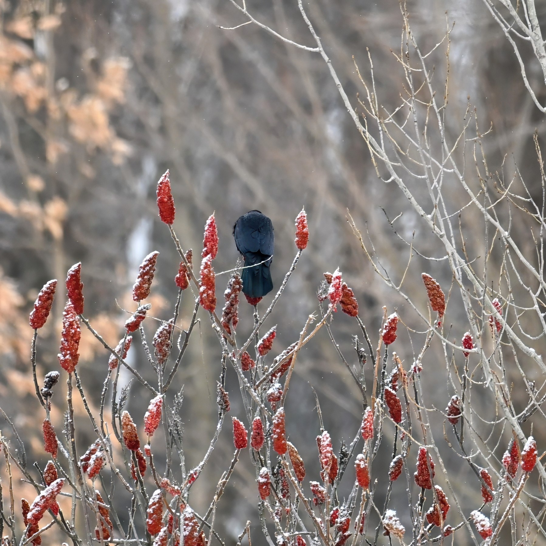[BirdingPI.com ornithology specialist note: interesting to see American Crow foraging on Staghorn Sumac (Rhus typhina). Usually associate such behavior with American Robin, Black-capped Chickadee, Eastern Bluebird, etc. It must happen regularly, but never noticed this behavior in American Crow before. Perhaps the long spell of cold weather has made other food sources scarcer?]