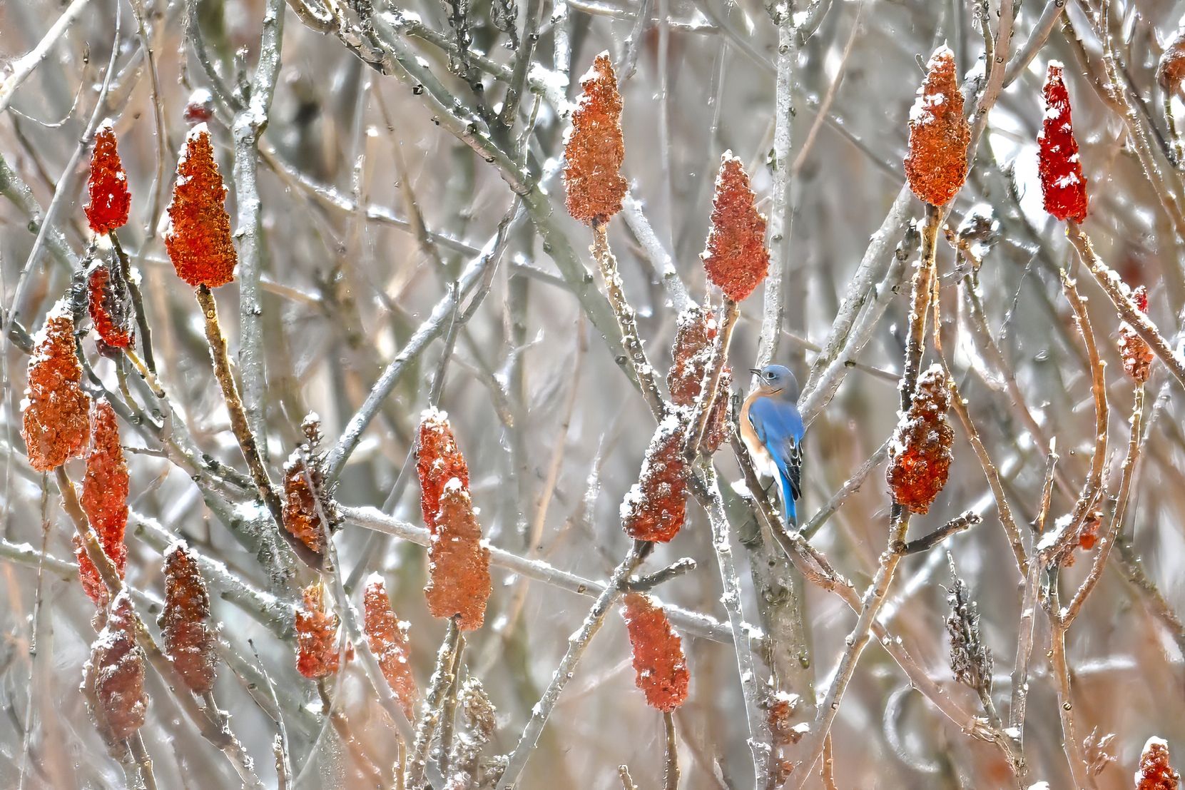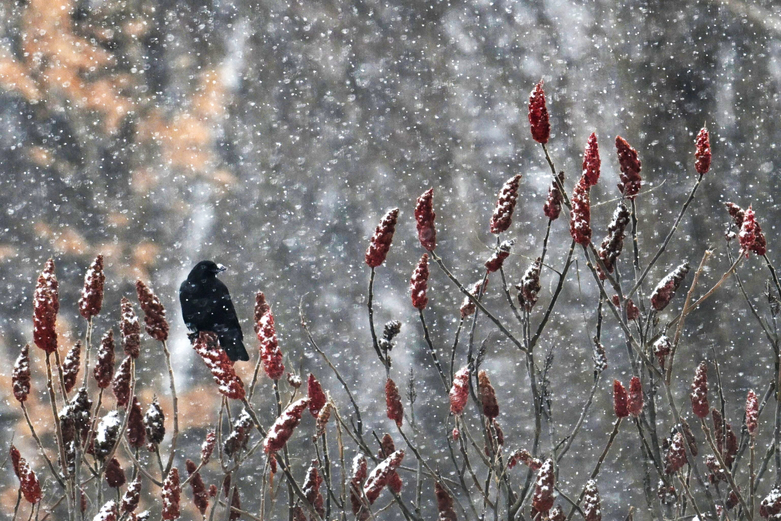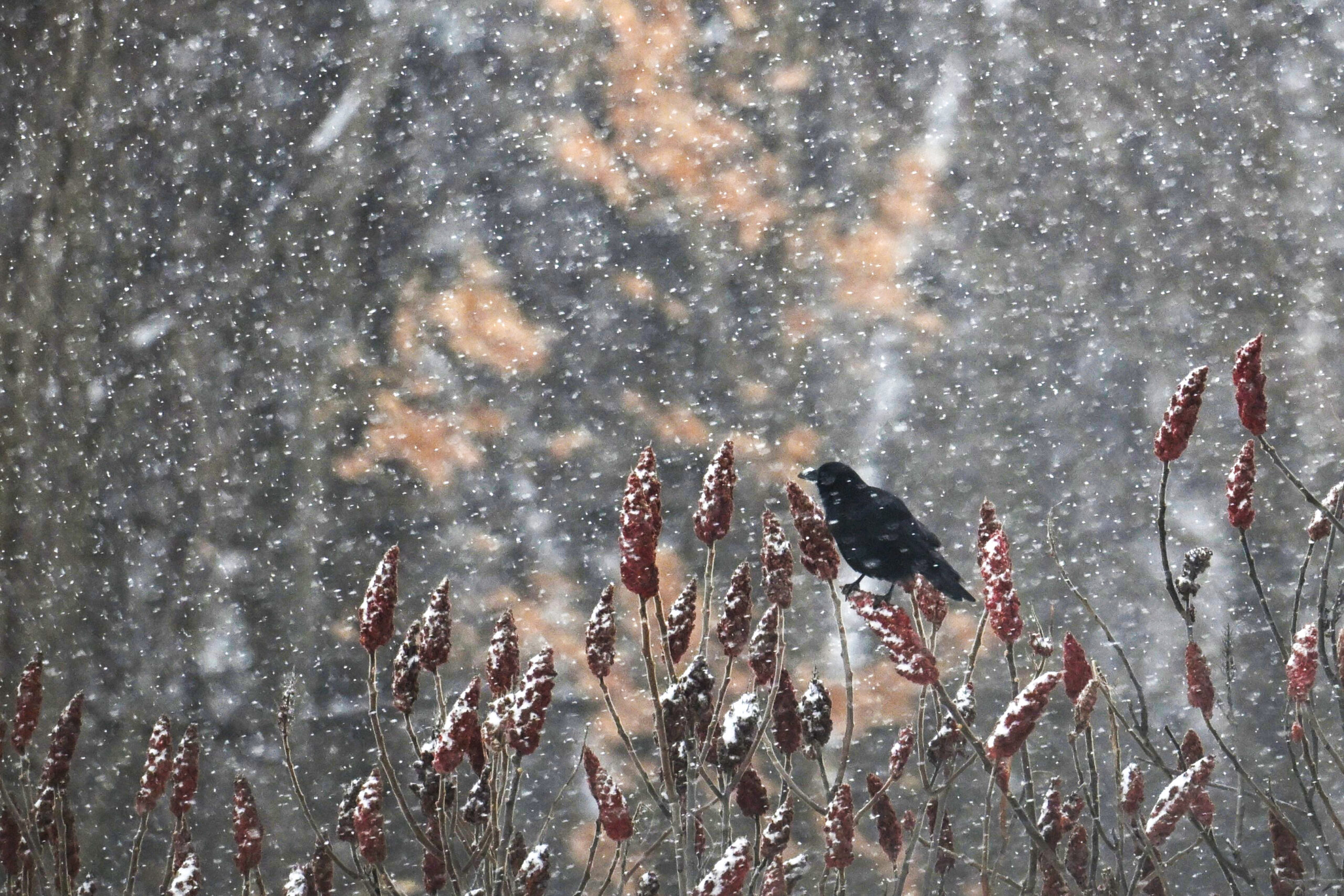 [BirdingPI.com ornithology specialist note: interesting to see American Crow foraging on Staghorn Sumac (Rhus typhina). Usually associate such behavior with American Robin, Black-capped Chickadee, Eastern Bluebird, etc. It must happen regularly, but never noticed this behavior in American Crow before. Perhaps the long spell of cold weather has made other food sources scarcer?]