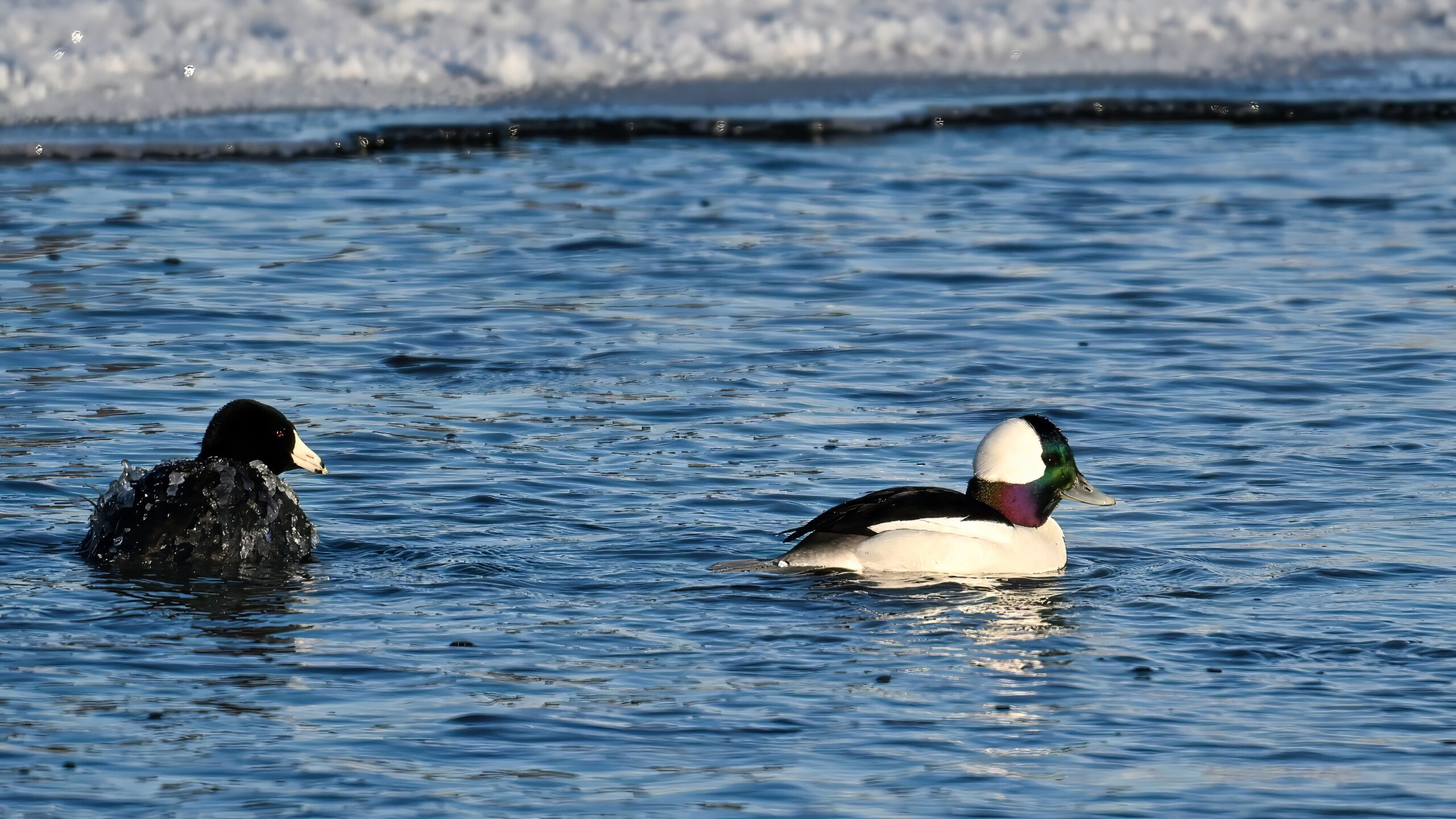Looks like more extremely cold weather coming this weekend to Erie County, Pennsylvania. These shots from last Sunday morning at dawn at Presque Isle Marina, where the air temp was maybe around 4 deg F. On the other hand, little wind, and the sunshine made for good exposure on beautiful birds like this male Bufflehead (right):