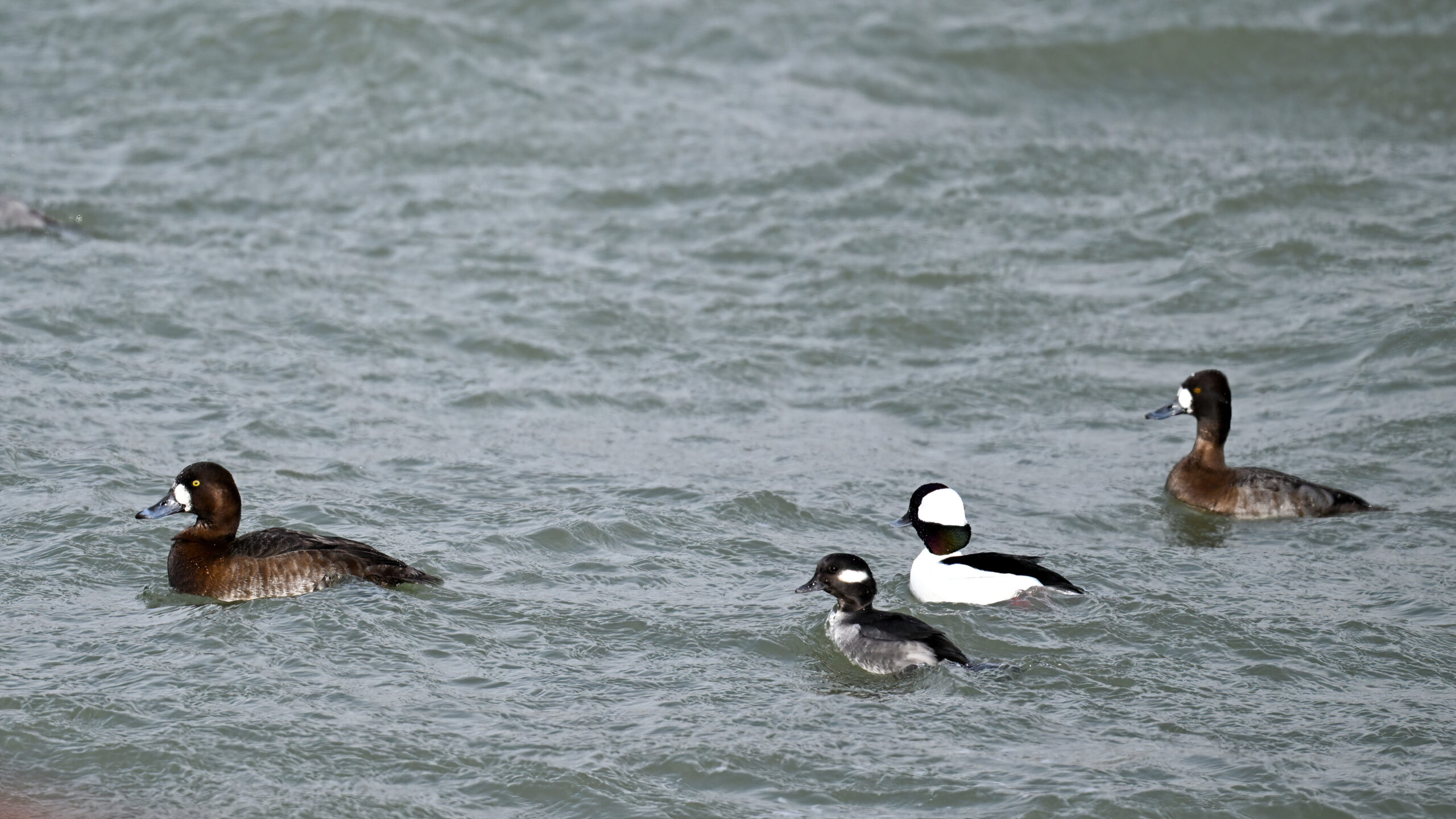 Current transients at the marina include Bufflehead (left/middle), Red-breasted Merganser (right of middle), and Lesser Scaup (right, bottom middle), plus Canada Geese, Common Merganser, Ring-necked Duck, etc. (shown below):