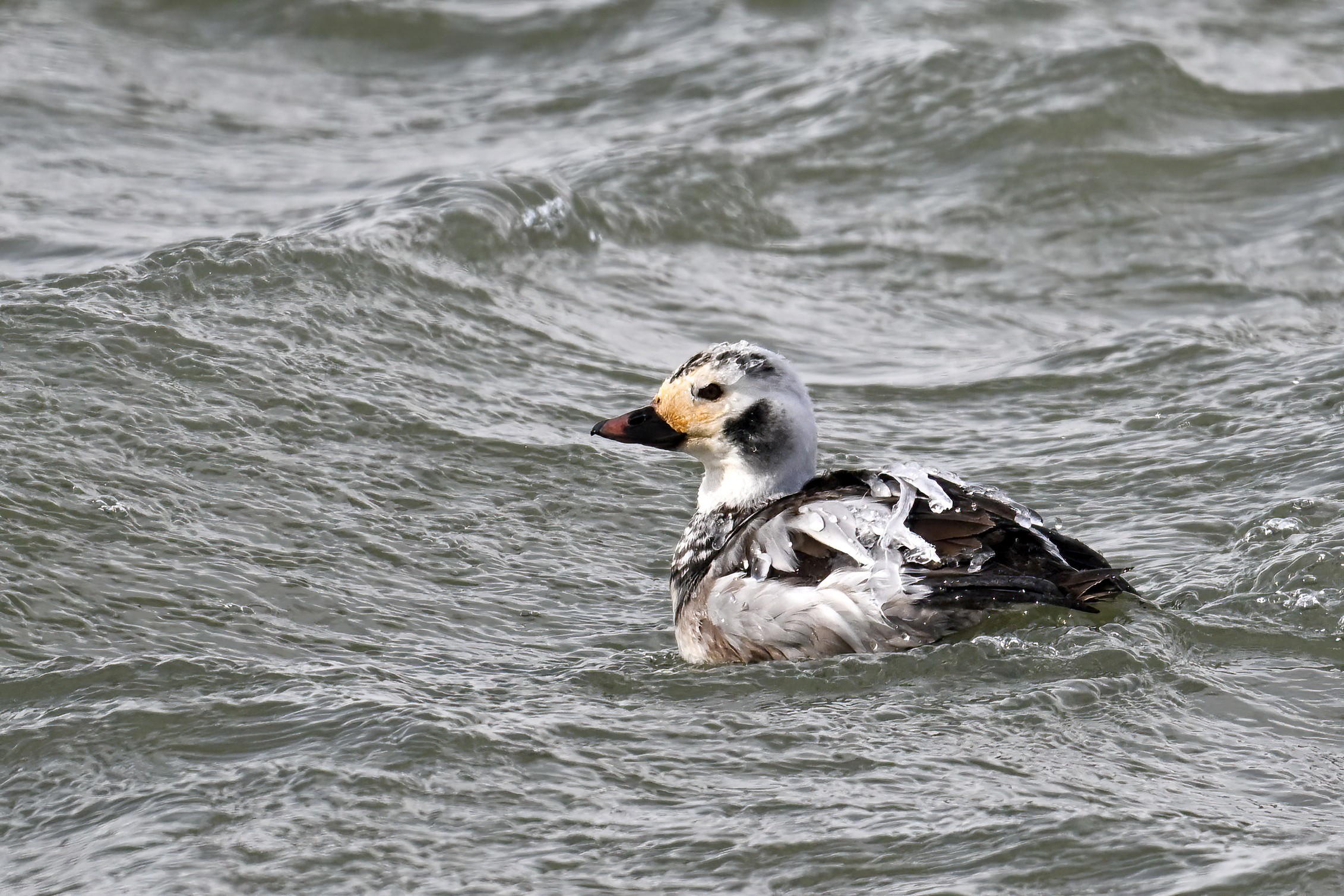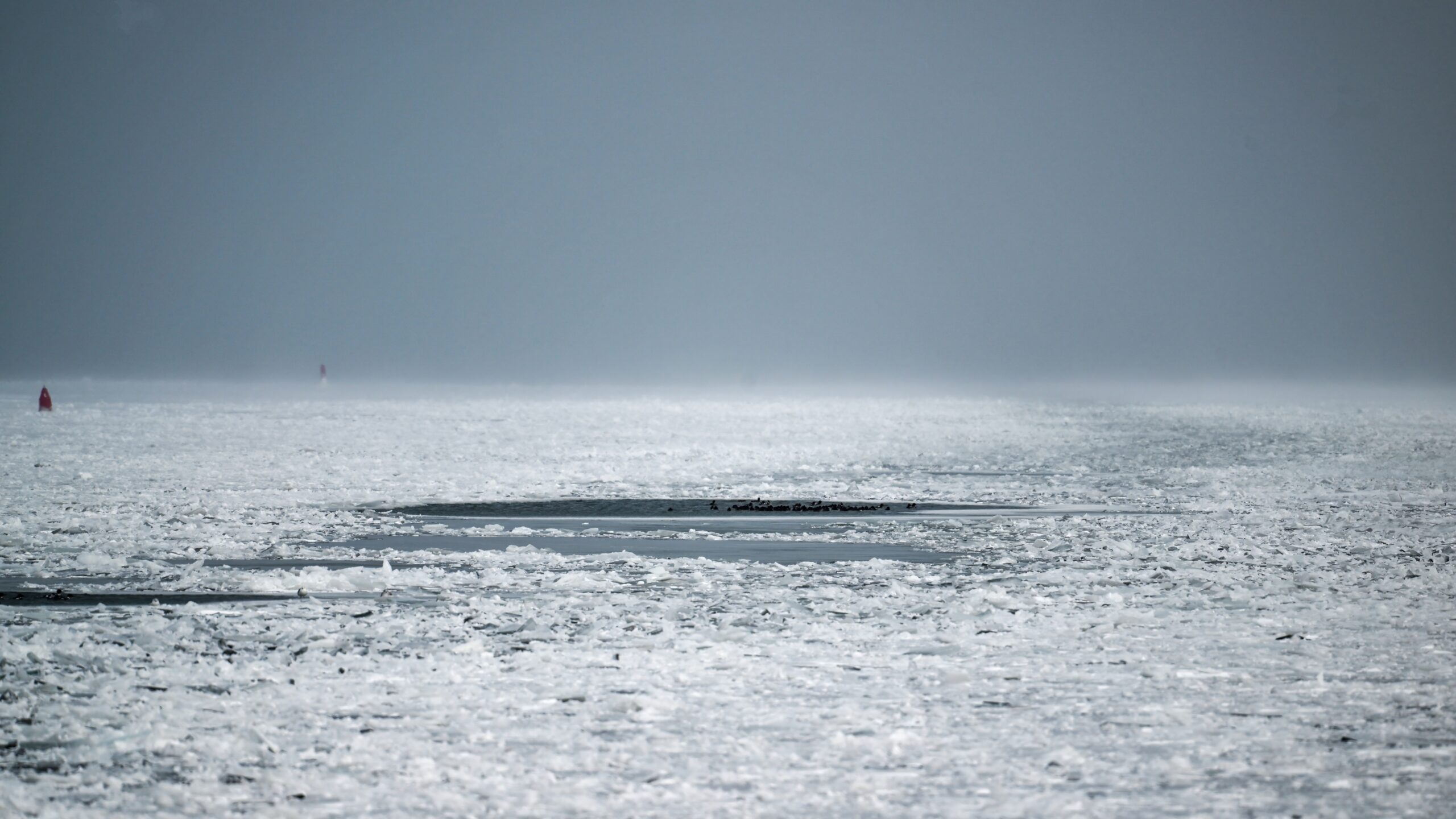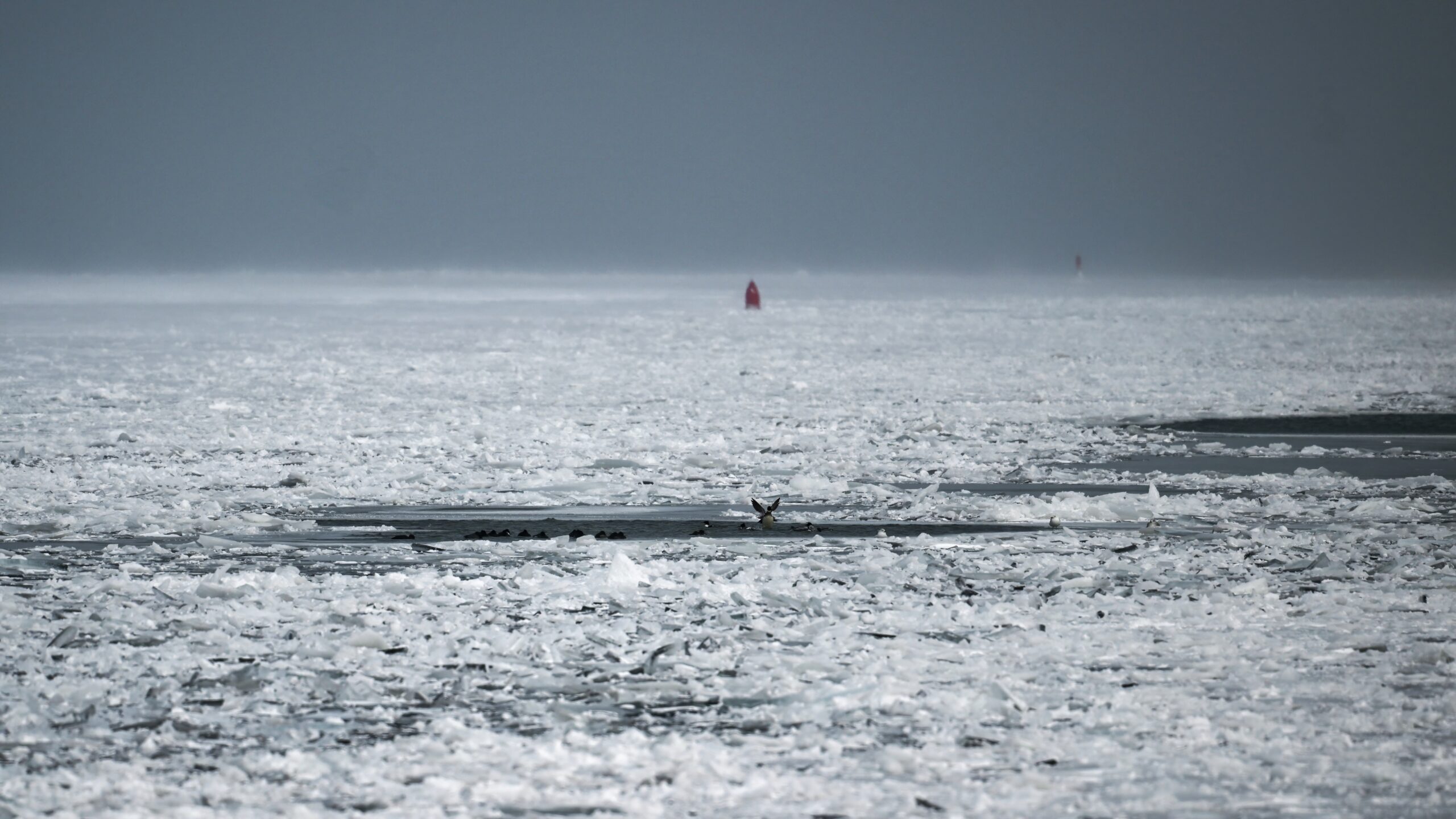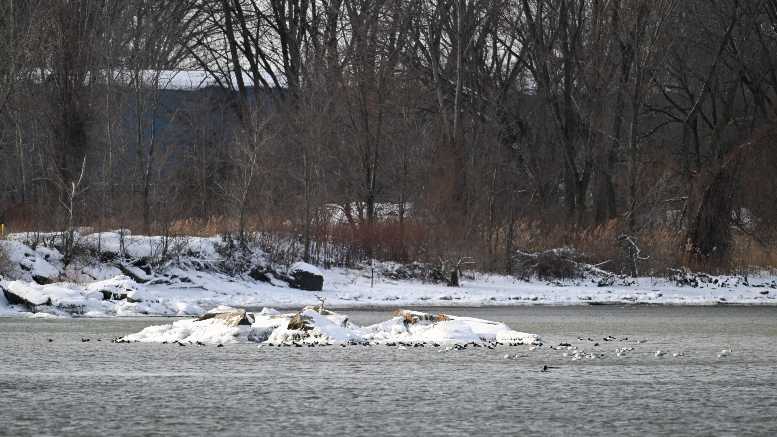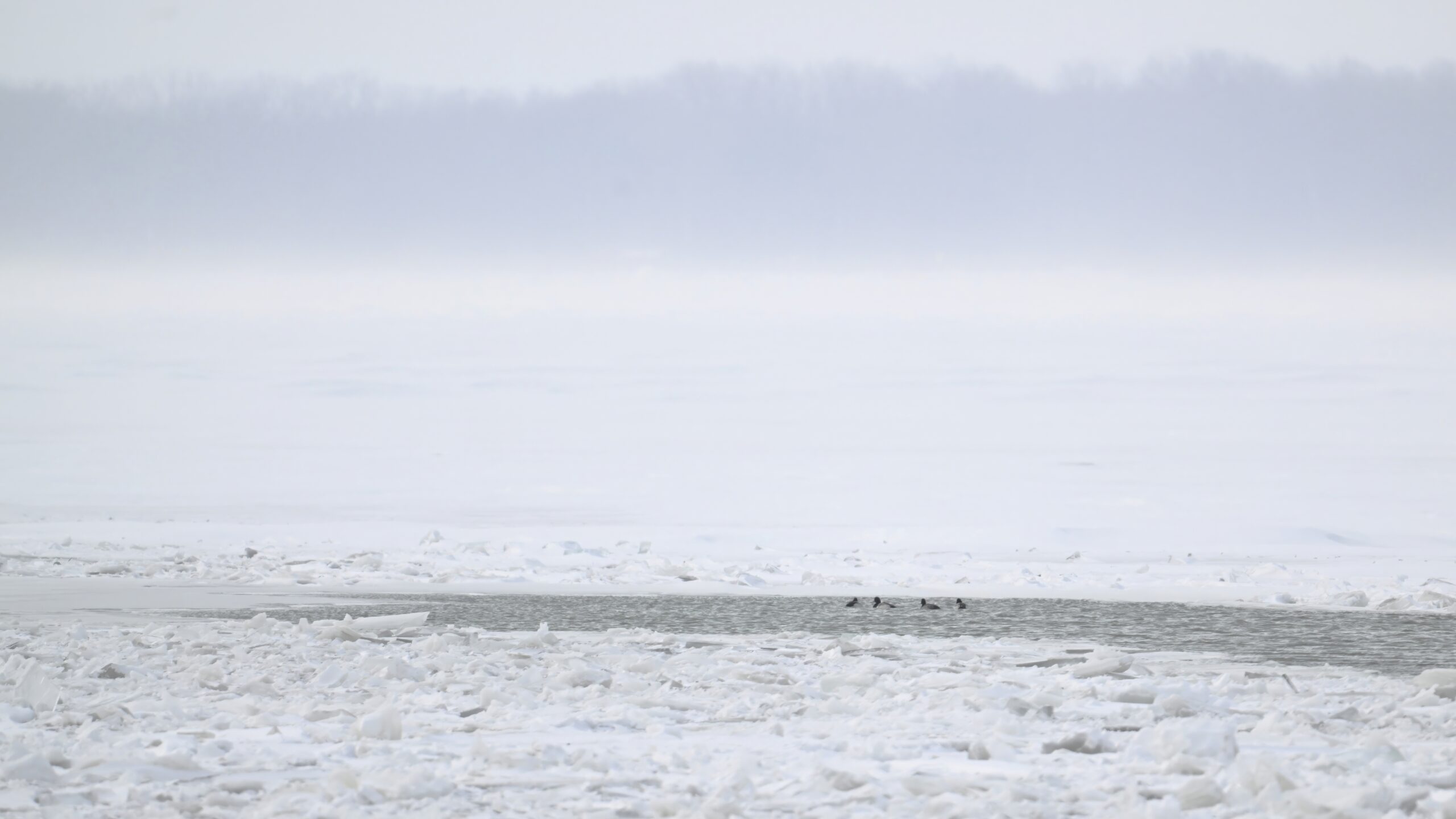 Telephoto view of Presque Isle Bay w/ unfrozen pool of water with several Scaup ducks: