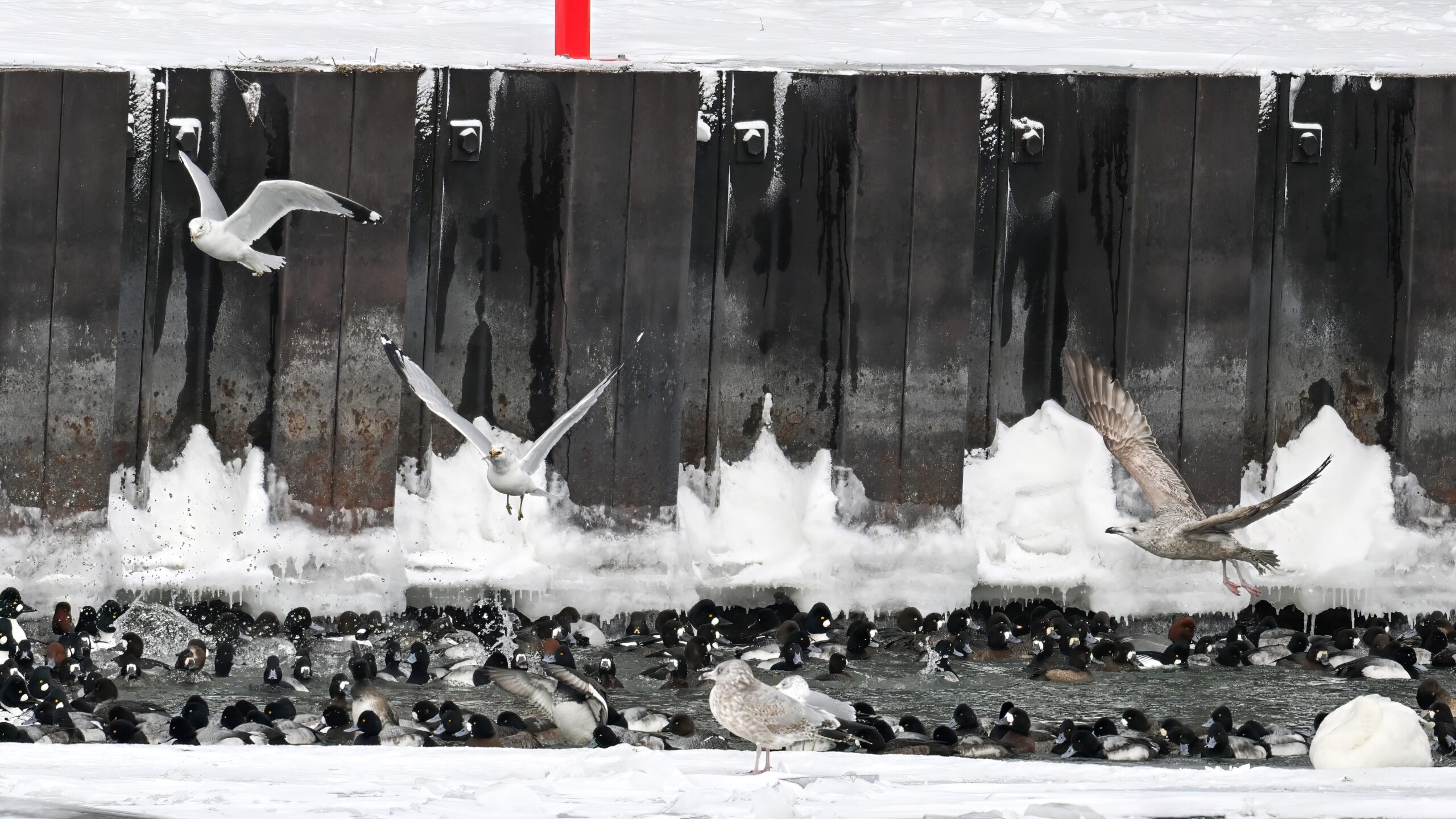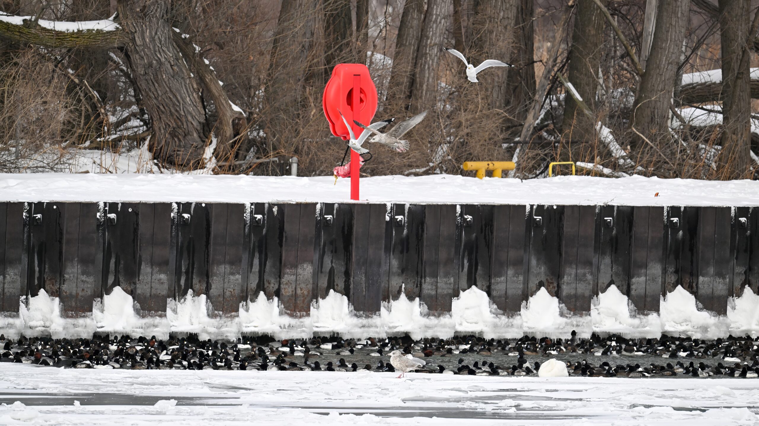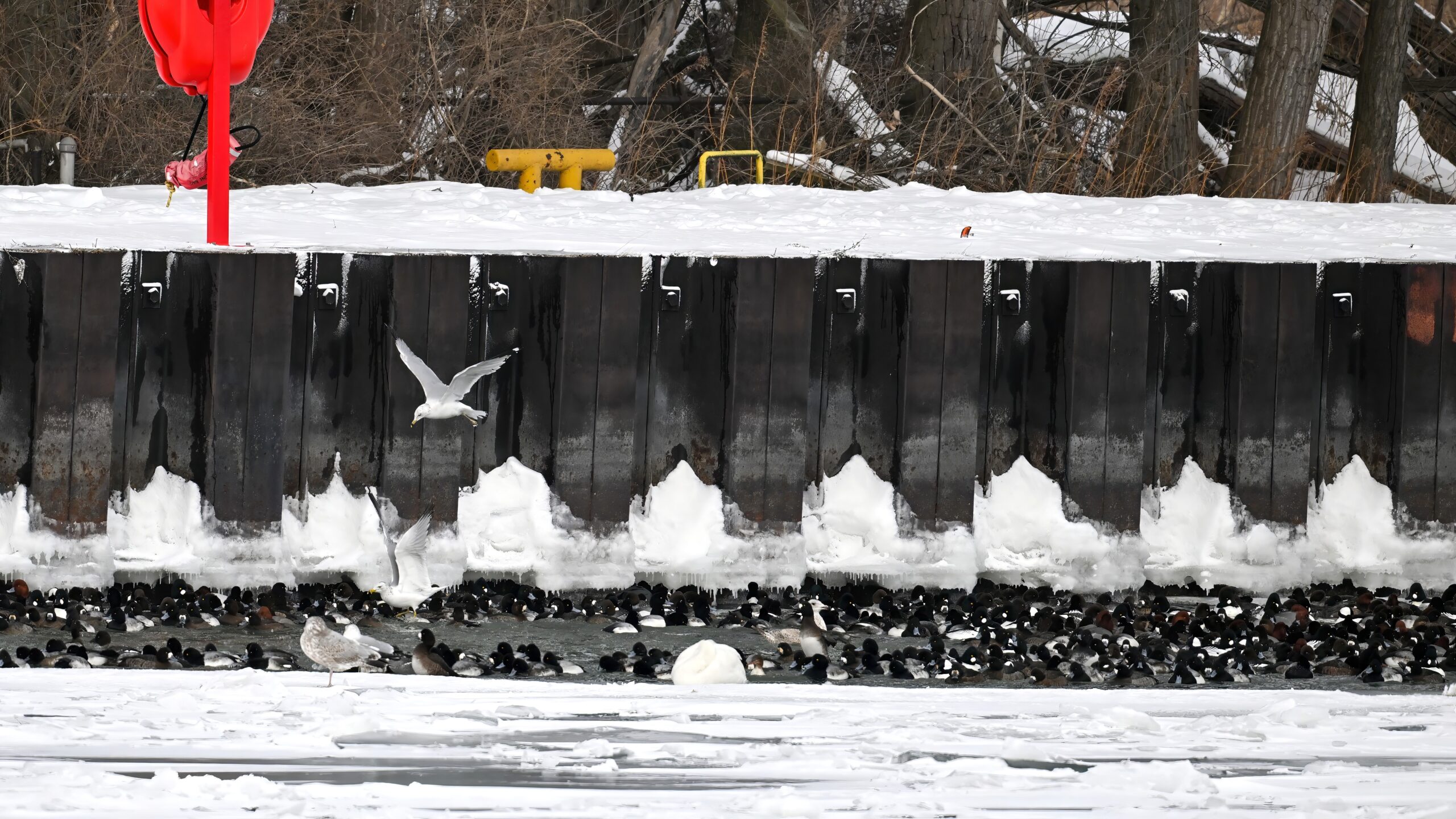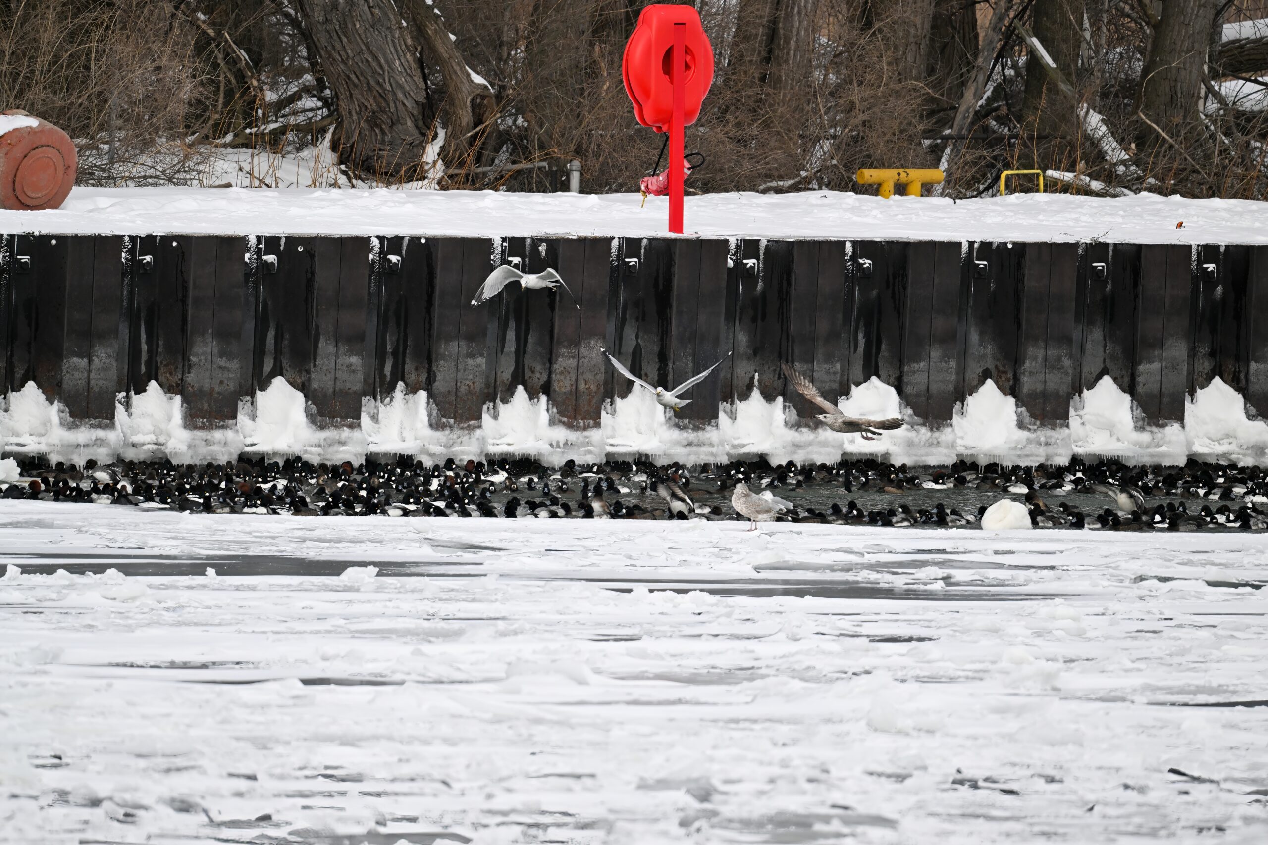 With Presque Isle Bay, outer Lake Erie, and the interior ponds at Presque Isle State Park all frozen over, migrating waterfowl look to wherever there’s open water, the best spot being Presque Isle Marina where underground pumps keep the water recirculating in Marina Lake to avoid ice damage to dock infrastructure.