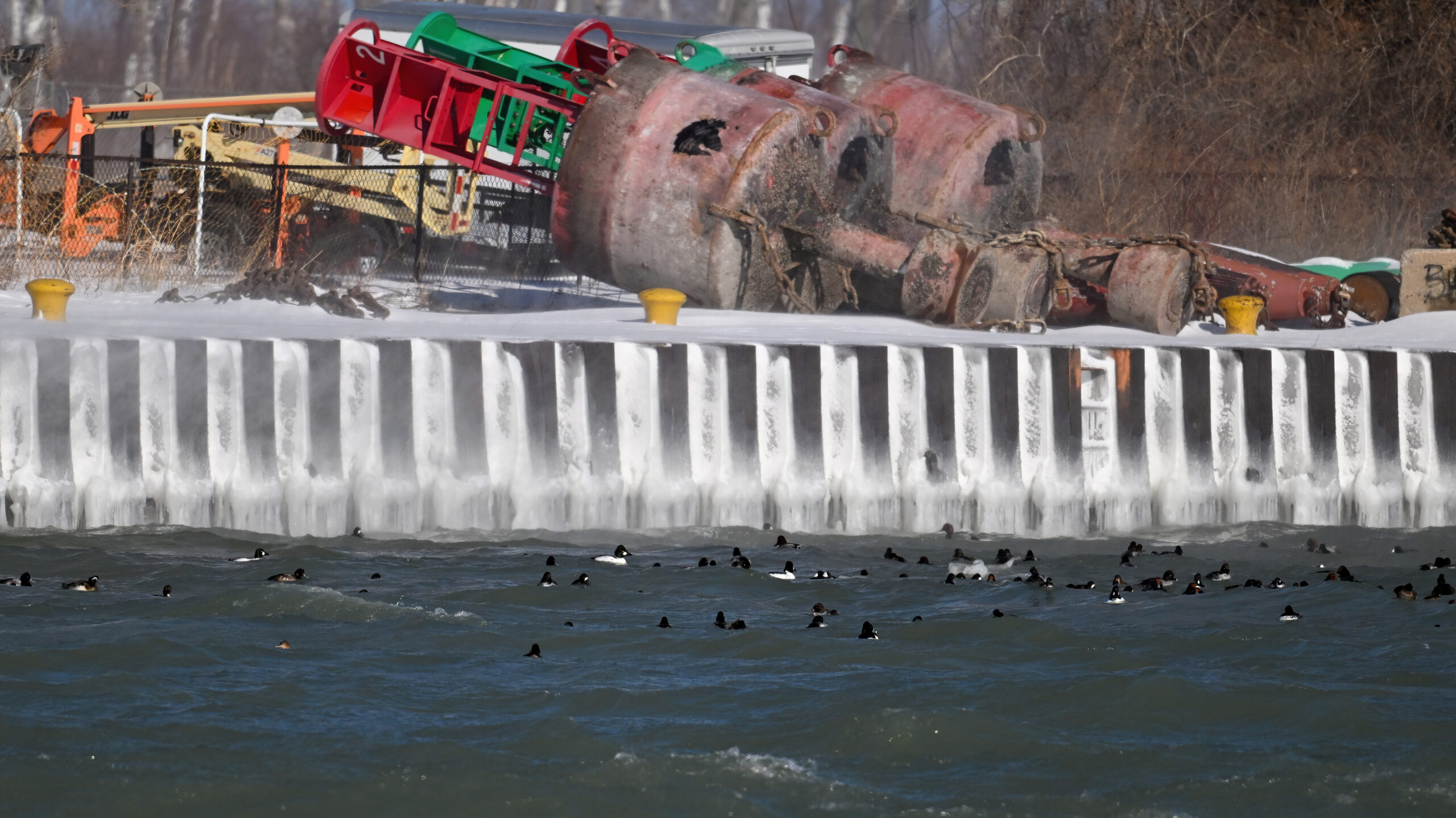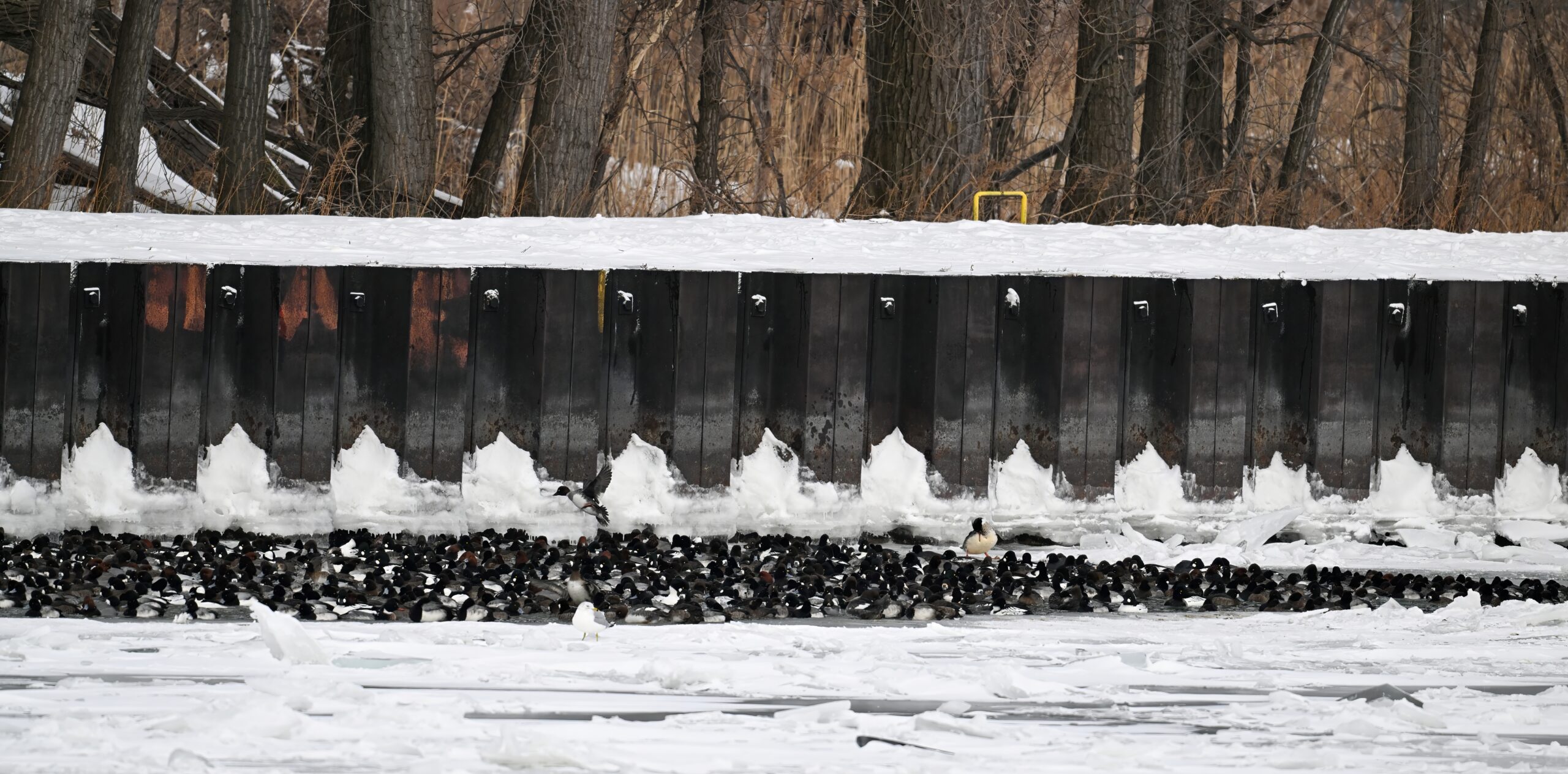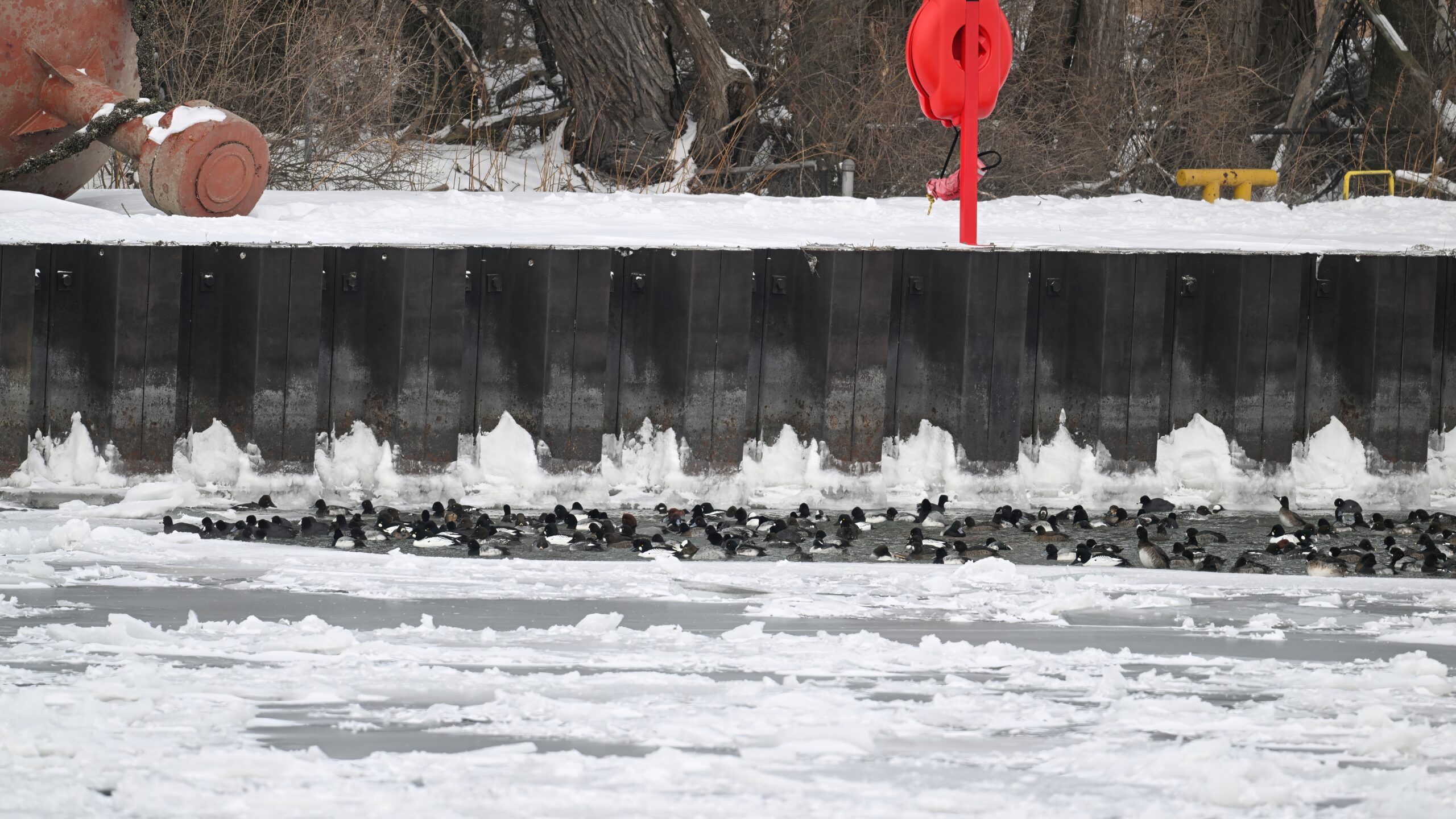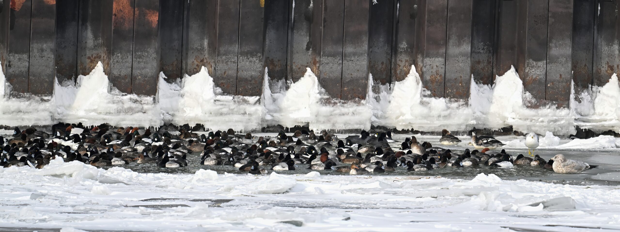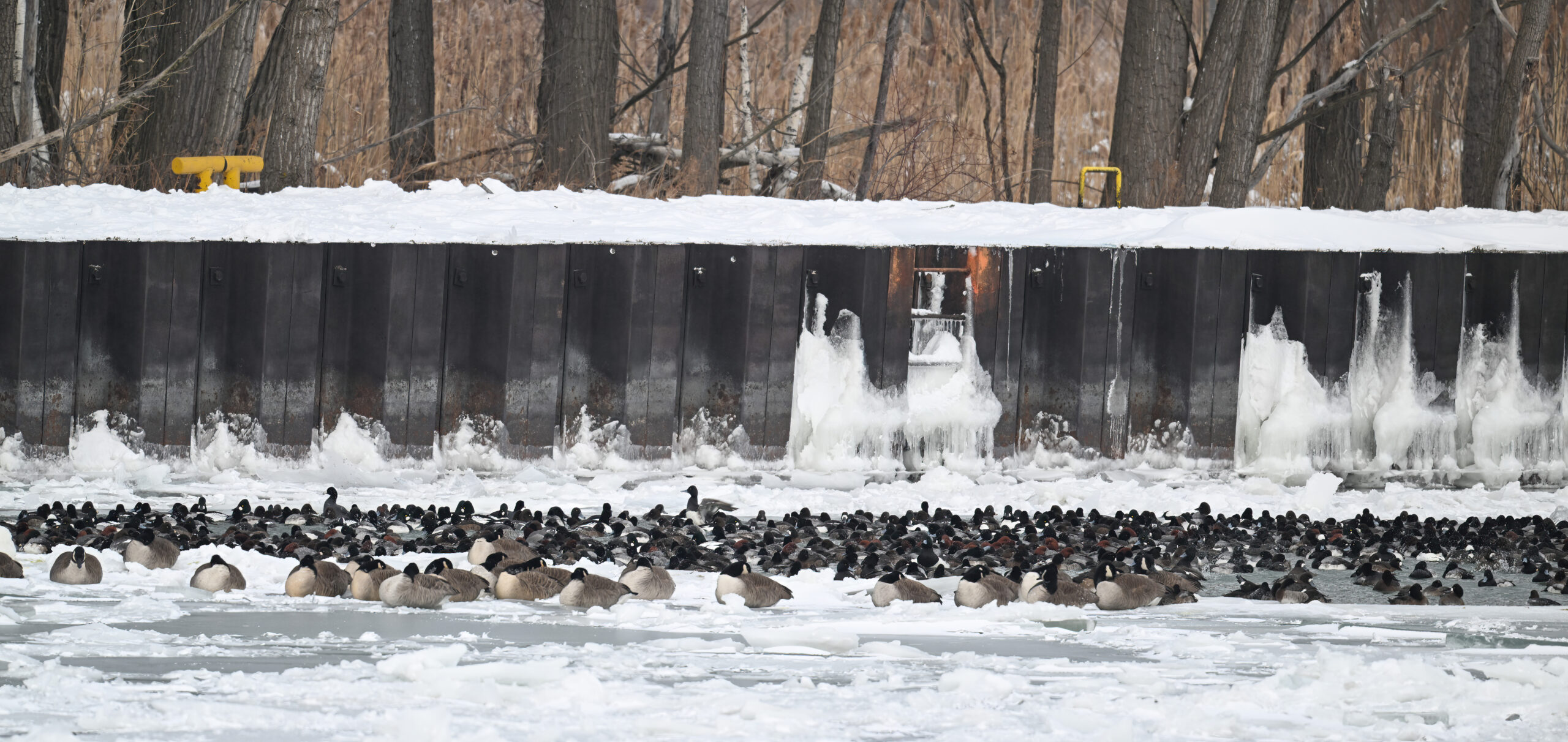 With Presque Isle Bay, outer Lake Erie, and the interior ponds at Presque Isle State Park all frozen over, migrating waterfowl look to wherever there’s open water, the best spot being Presque Isle Marina where underground pumps keep the water recirculating in Marina Lake to avoid ice damage to dock infrastructure.