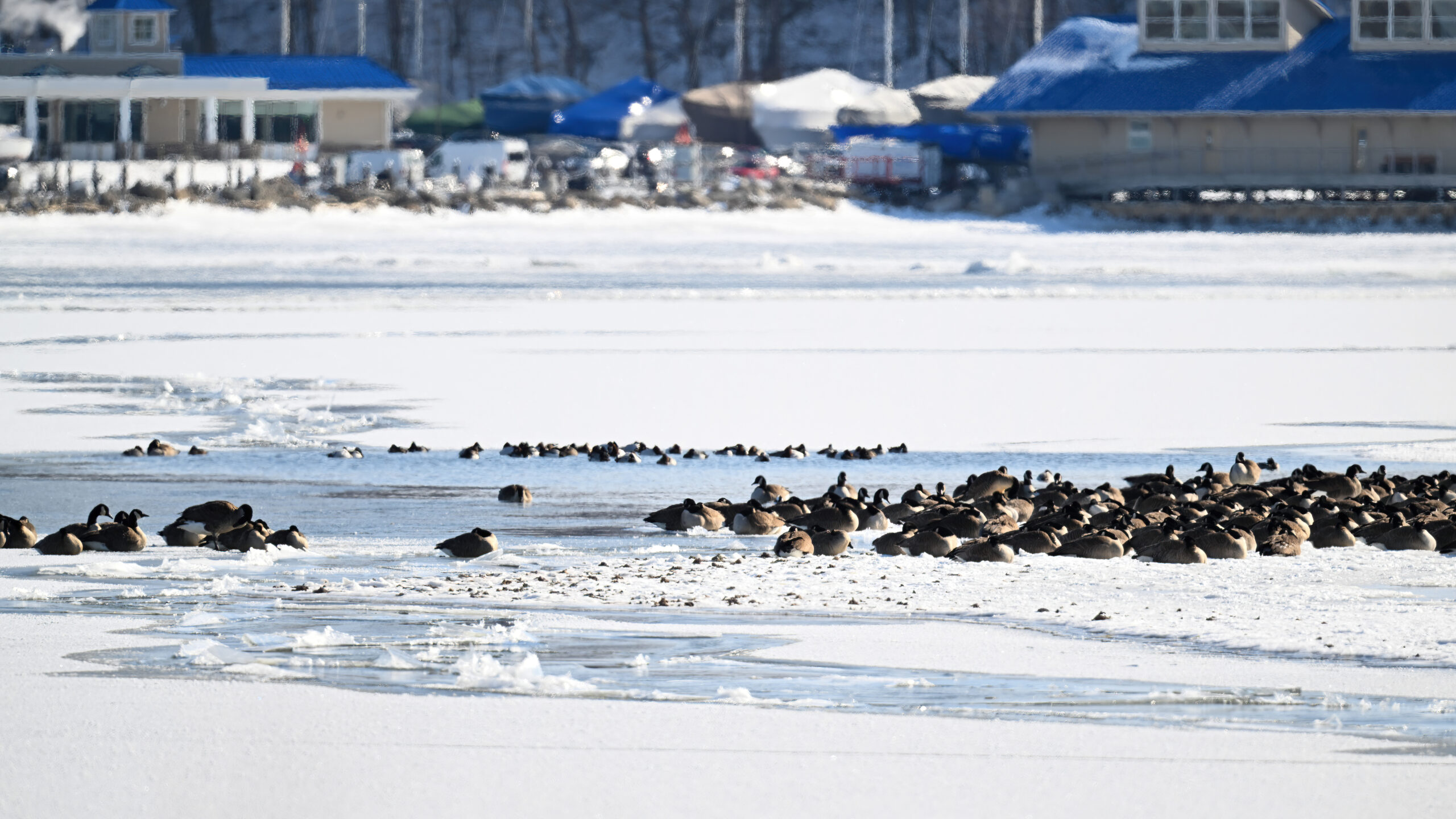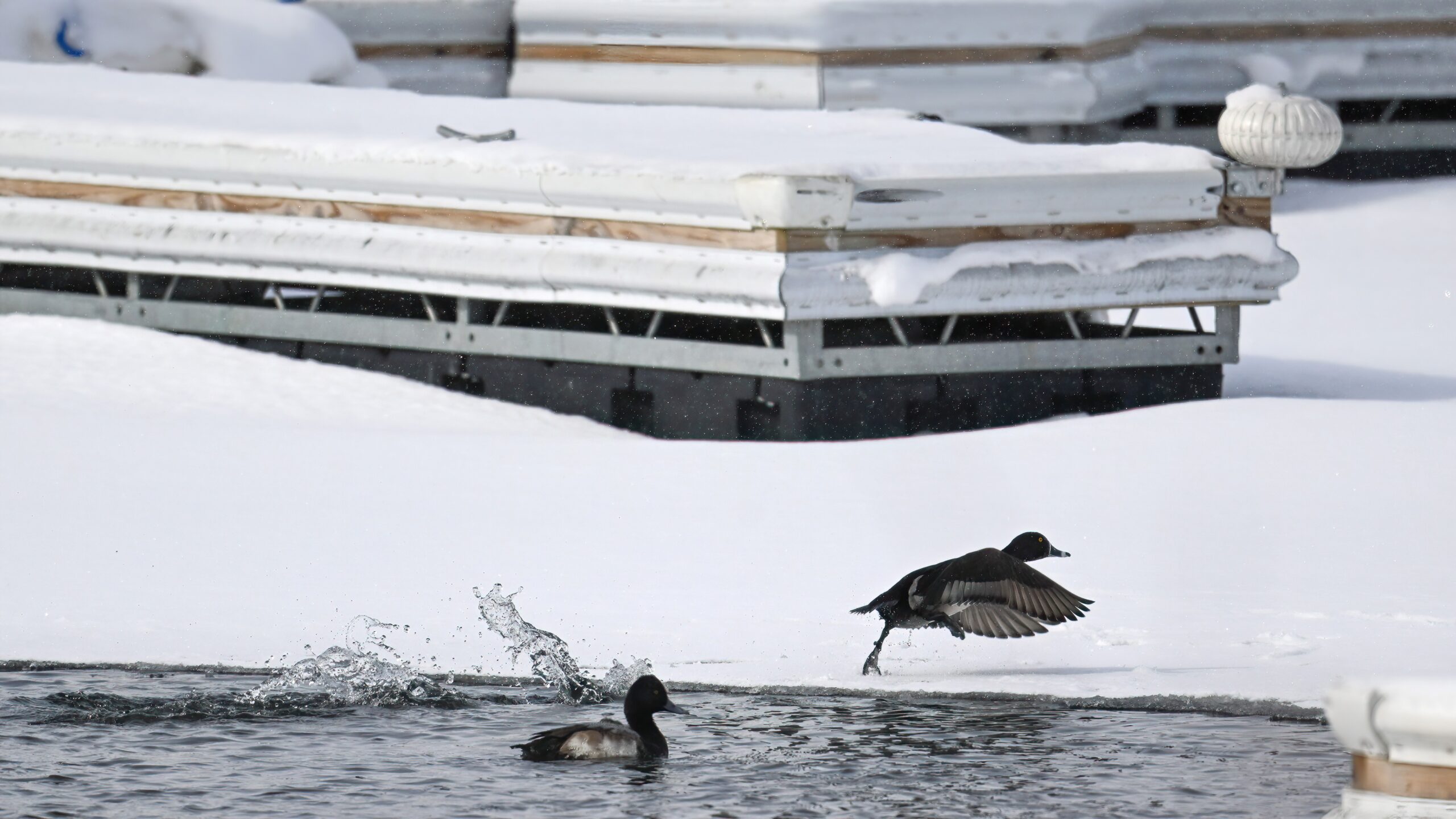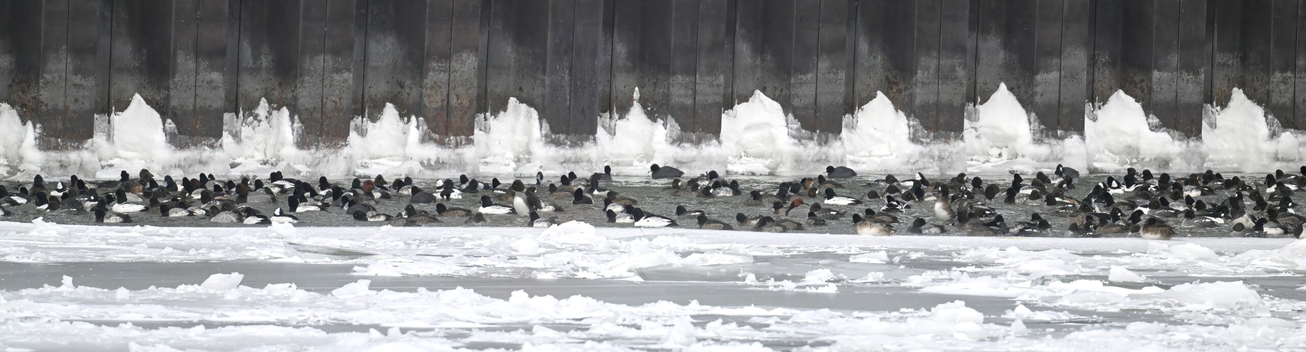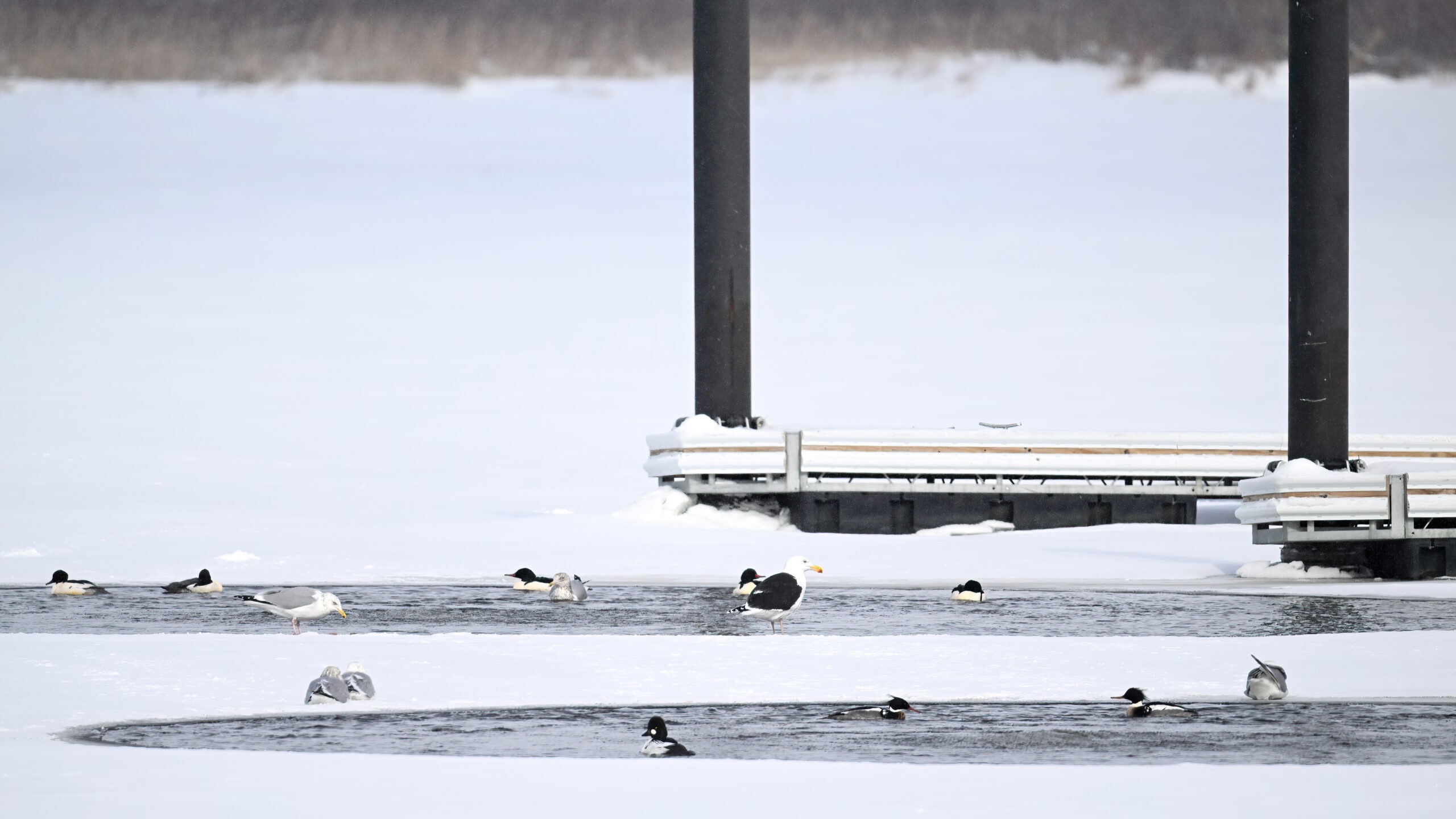 With Presque Isle Bay, outer Lake Erie, and the interior ponds at Presque Isle State Park all frozen over, migrating waterfowl look to wherever there’s open water, the best spot being Presque Isle Marina where underground pumps keep the water recirculating in Marina Lake to avoid ice damage to dock infrastructure.