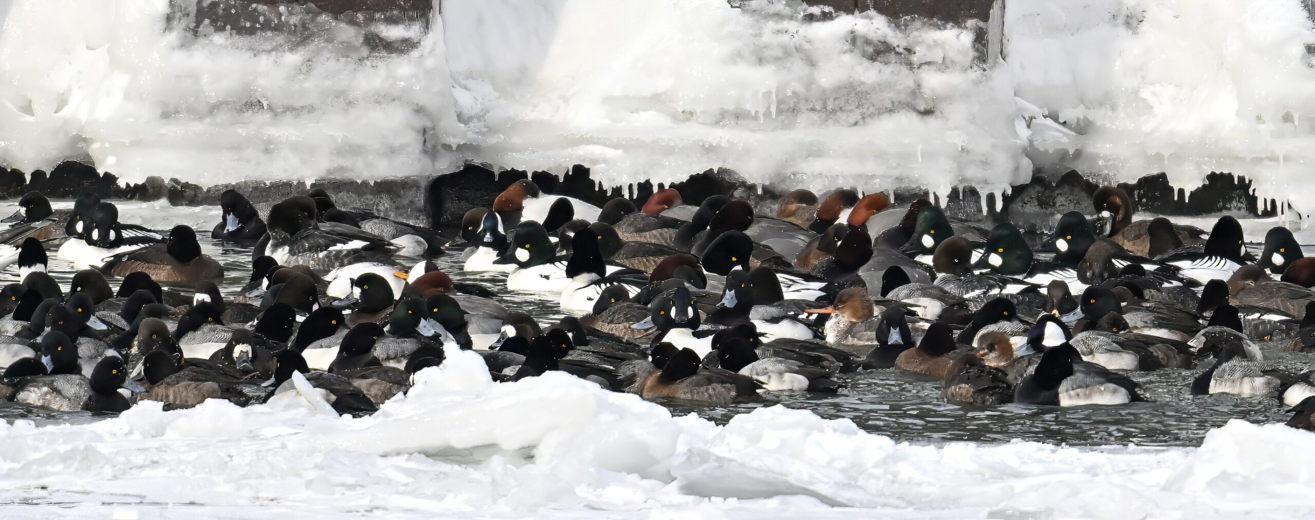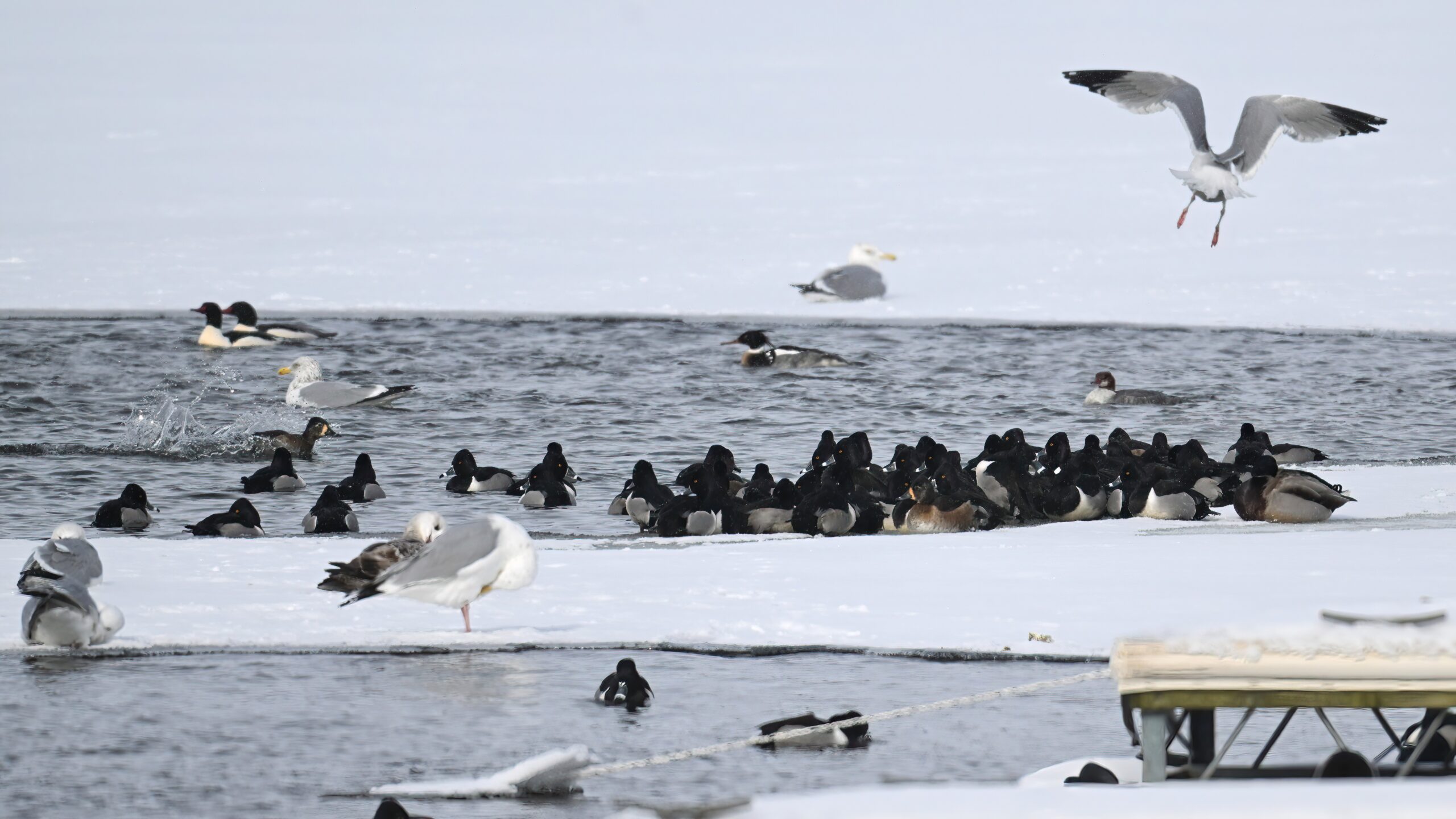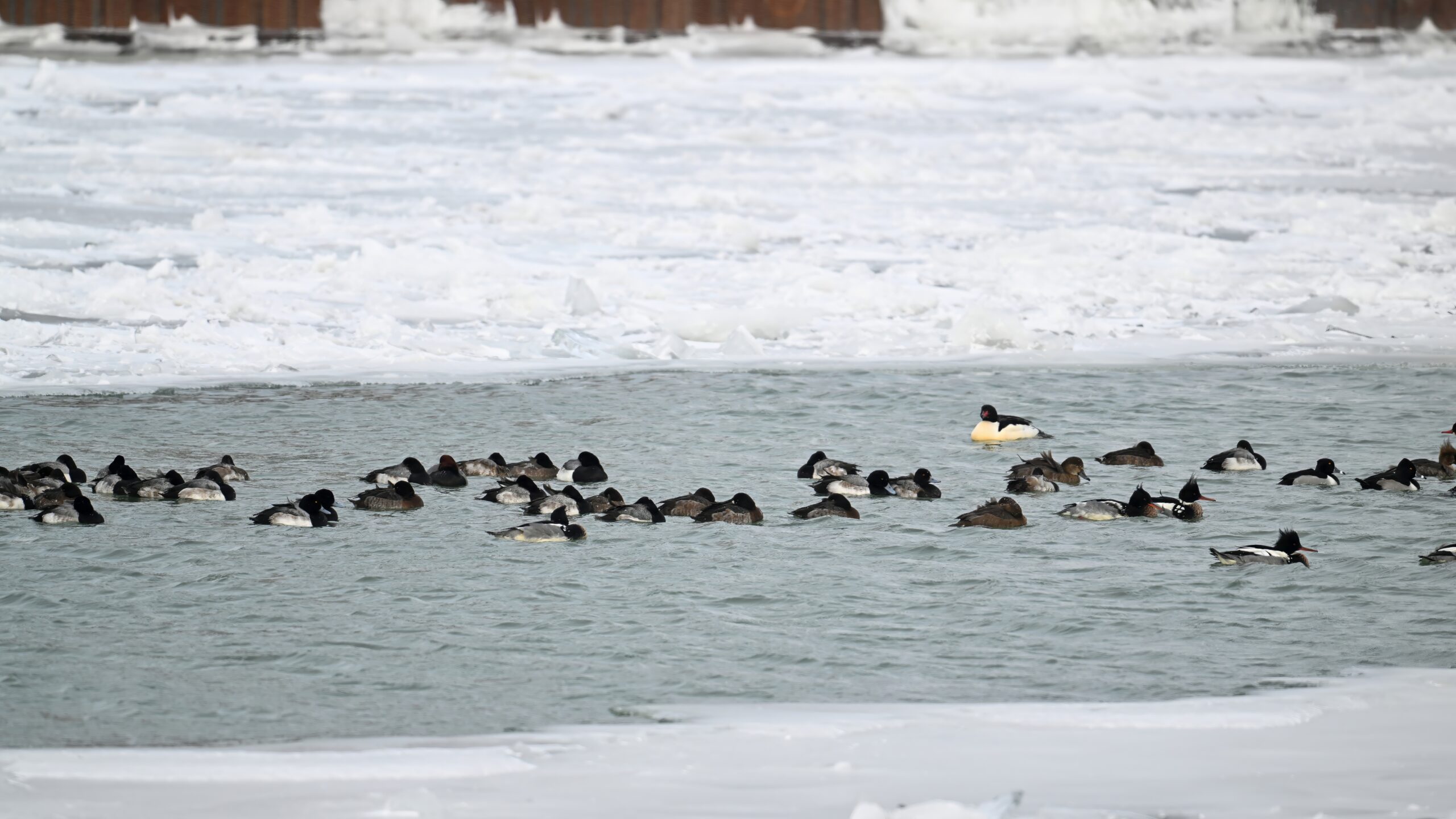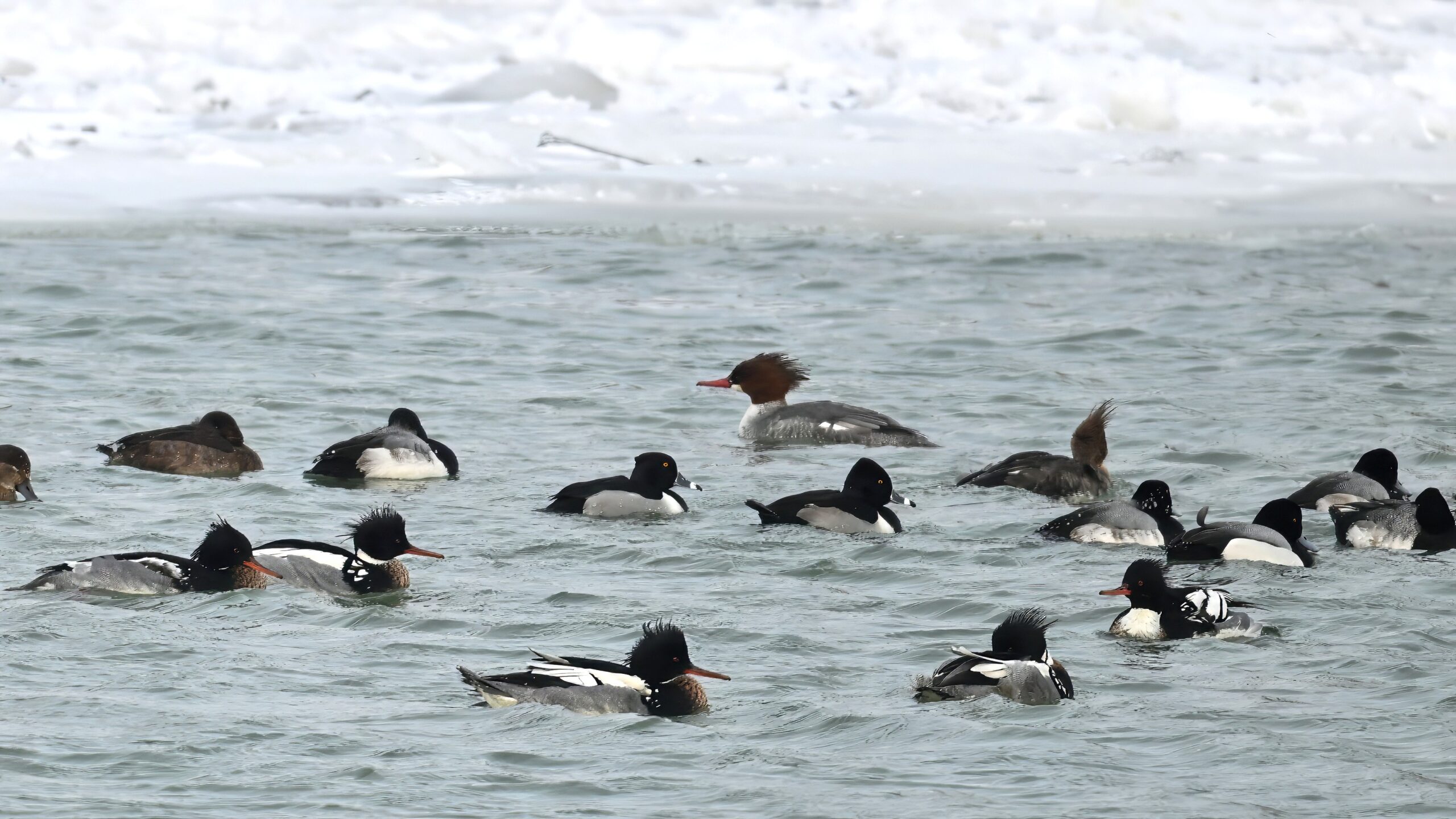 Lesser Scaups, Ring-necked Ducks, Common Merganser, & Red-breasted MerganserMale Ring-necked Ducks @ centerCommon Goldeneye (right, middle), Common Merganser (middle right), & Red-breasted Merganser (left)Ring-necked Ducks (top row)Red-breasted Merganser & ScaupBald Eagle on iceAnother pool with Canada Geese and lots of ducks