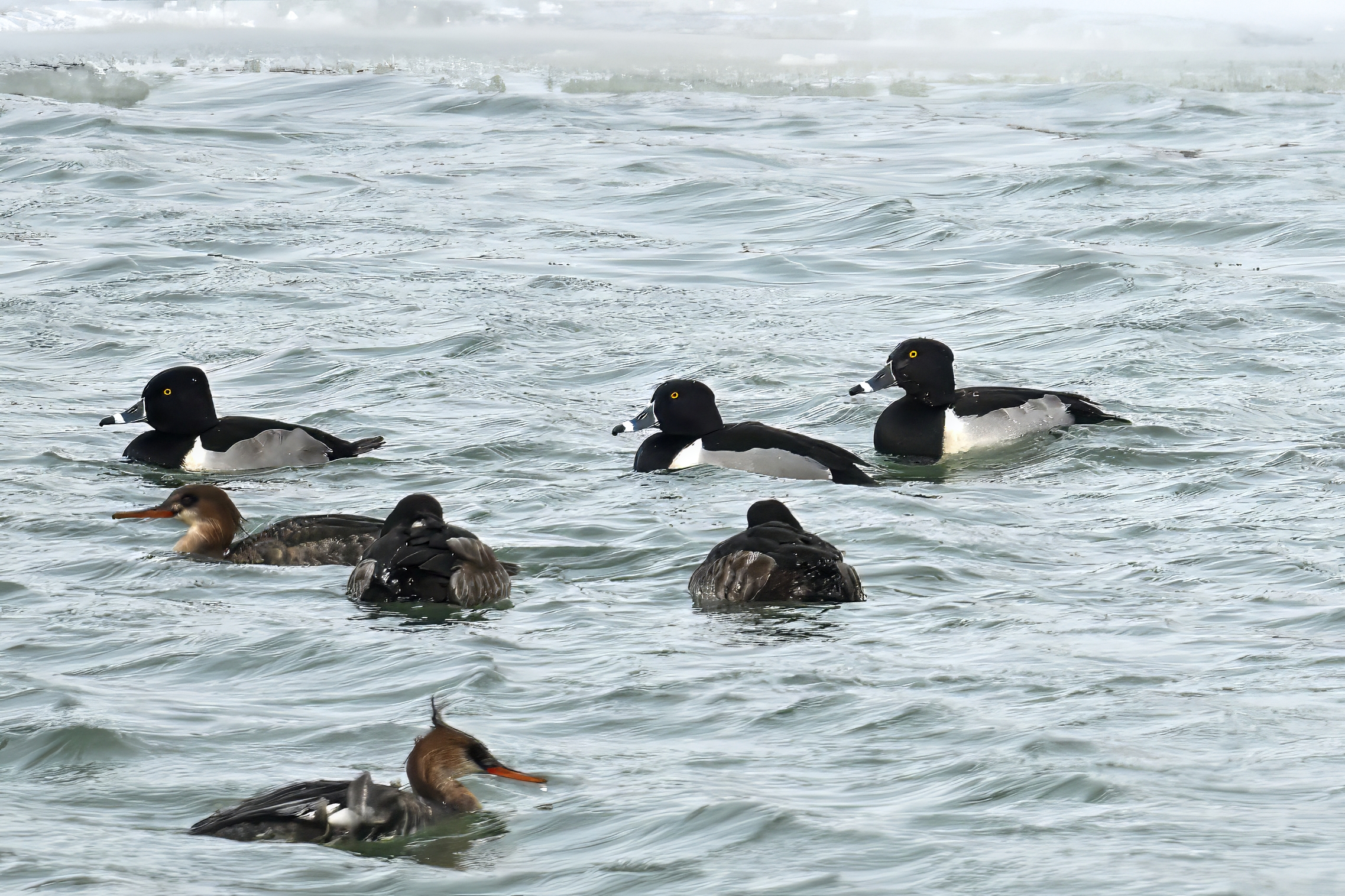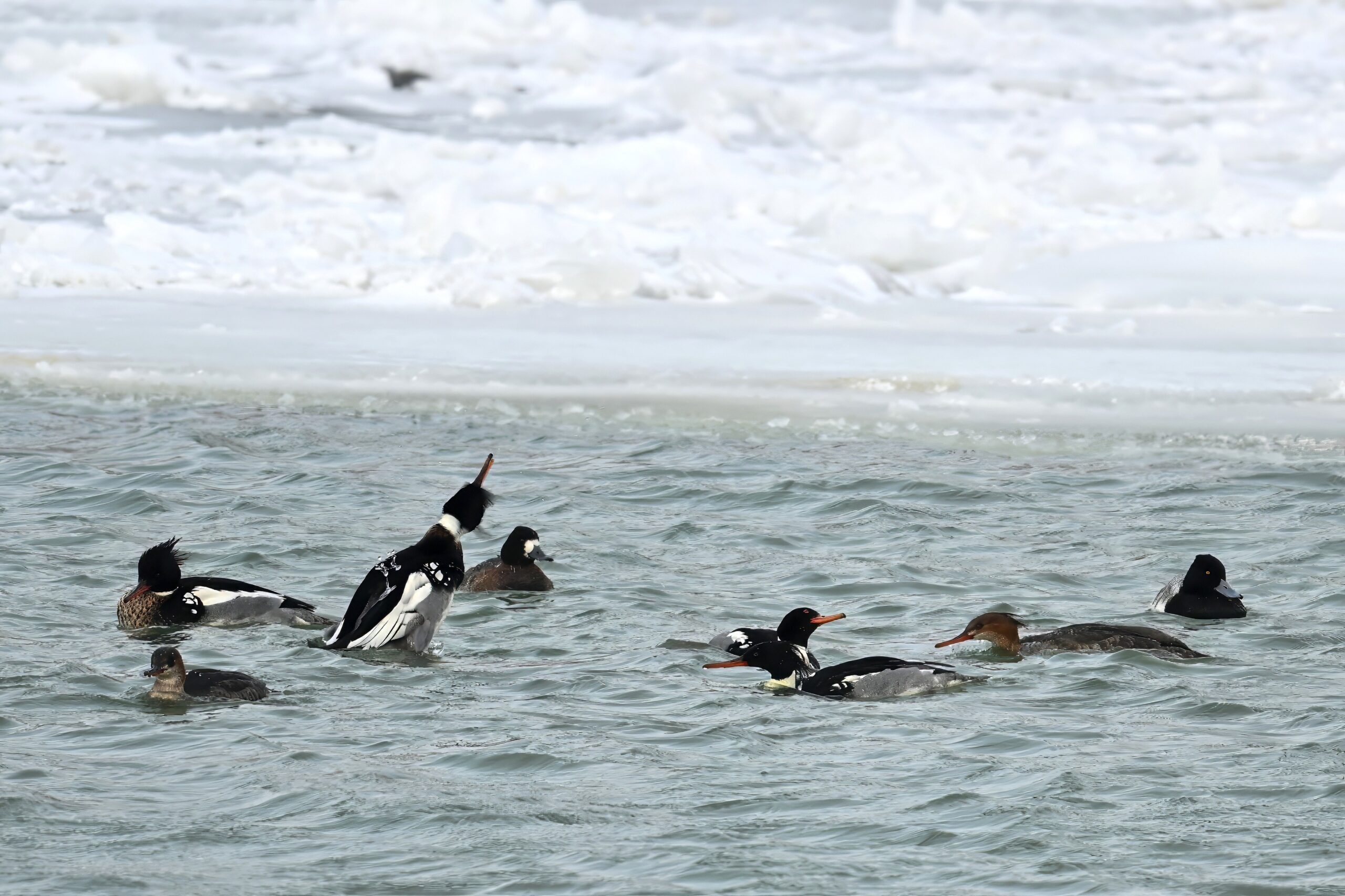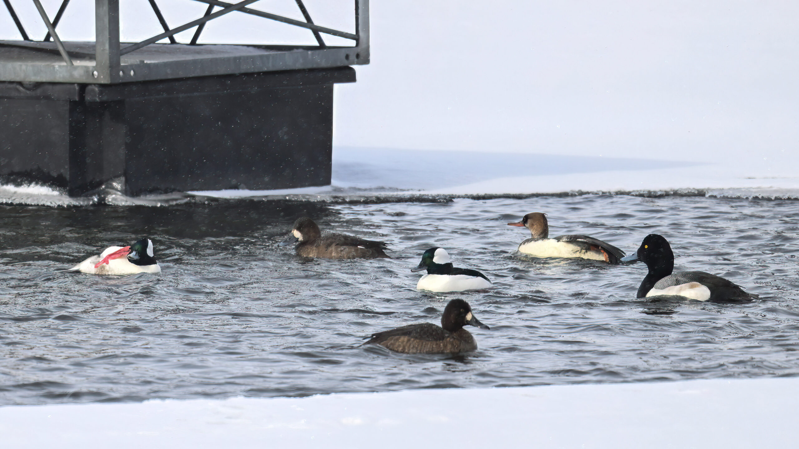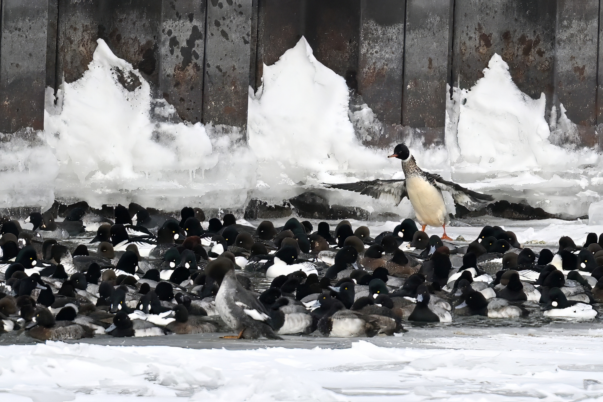 Lesser Scaups, Ring-necked Ducks, Common Merganser, & Red-breasted MerganserMale Ring-necked Ducks @ centerCommon Goldeneye (right, middle), Common Merganser (middle right), & Red-breasted Merganser (left)Ring-necked Ducks (top row)Red-breasted Merganser & ScaupBald Eagle on iceAnother pool with Canada Geese and lots of ducks