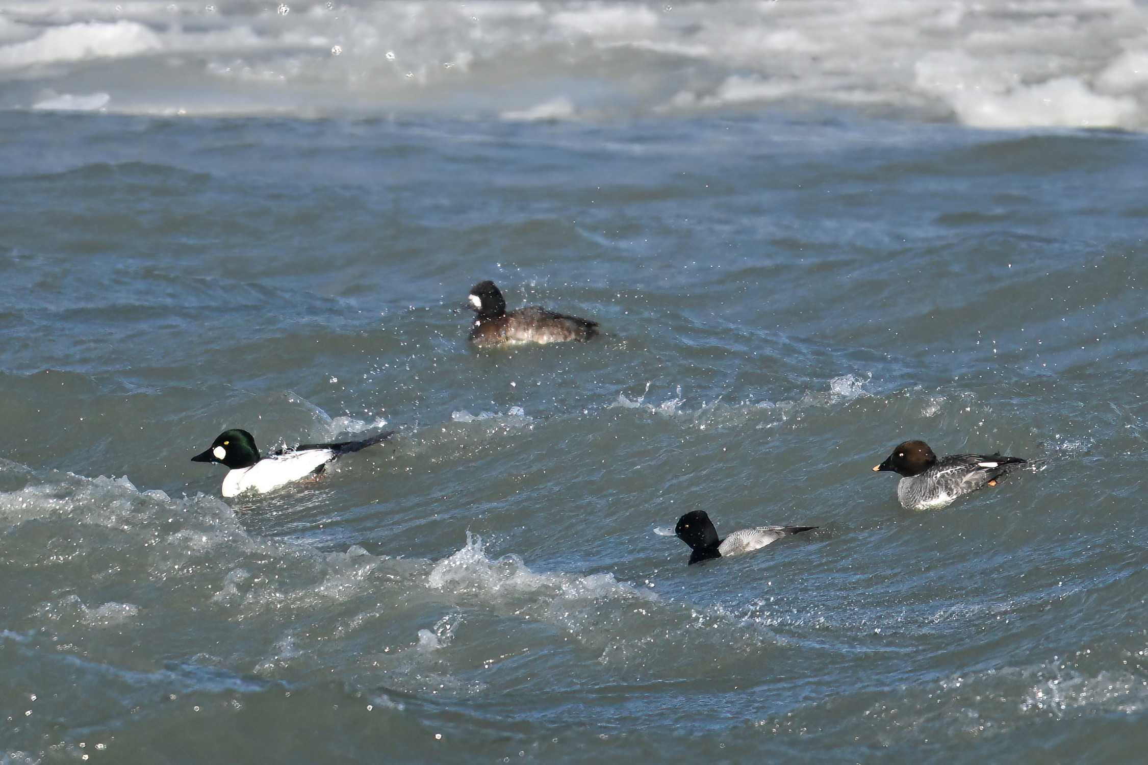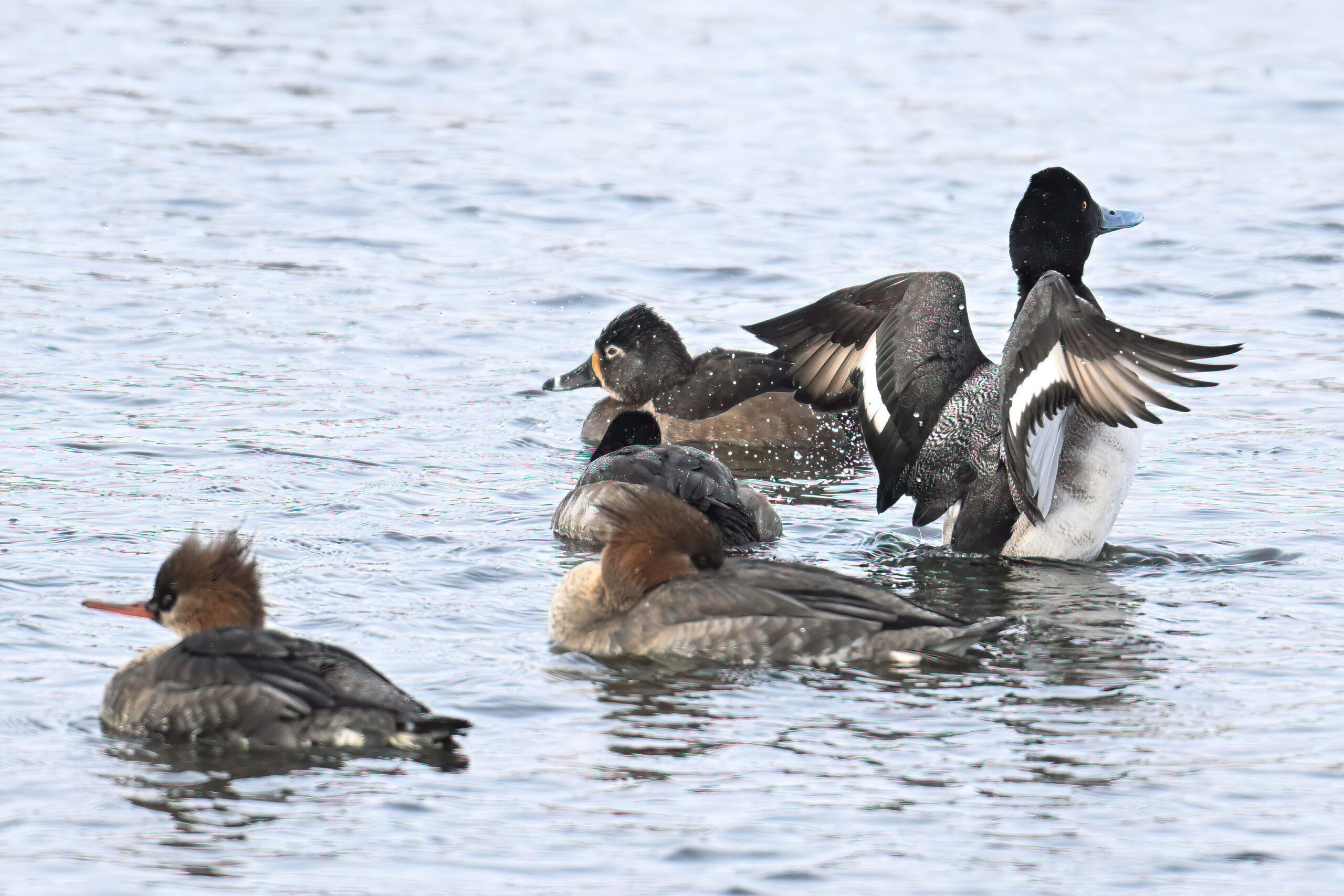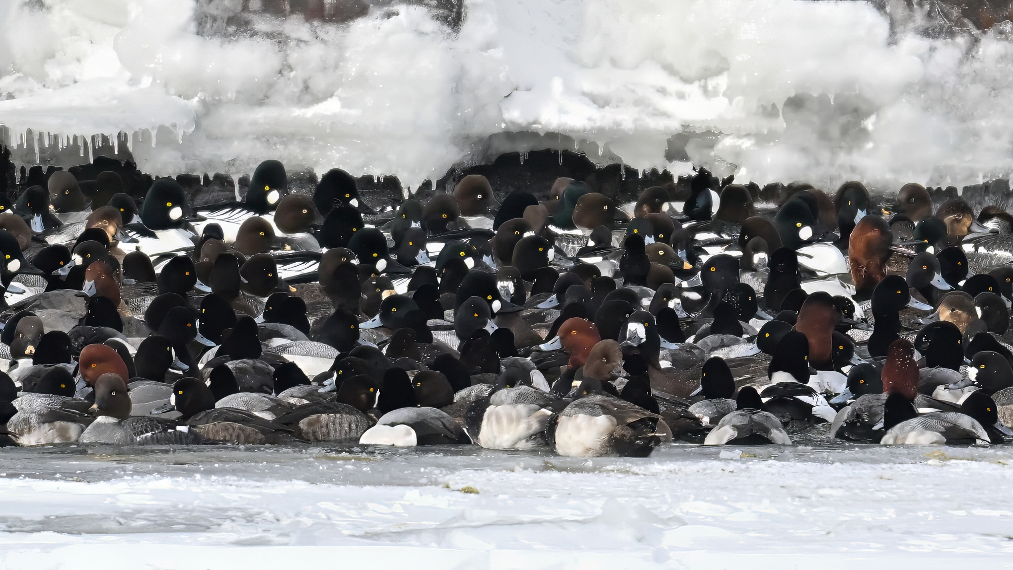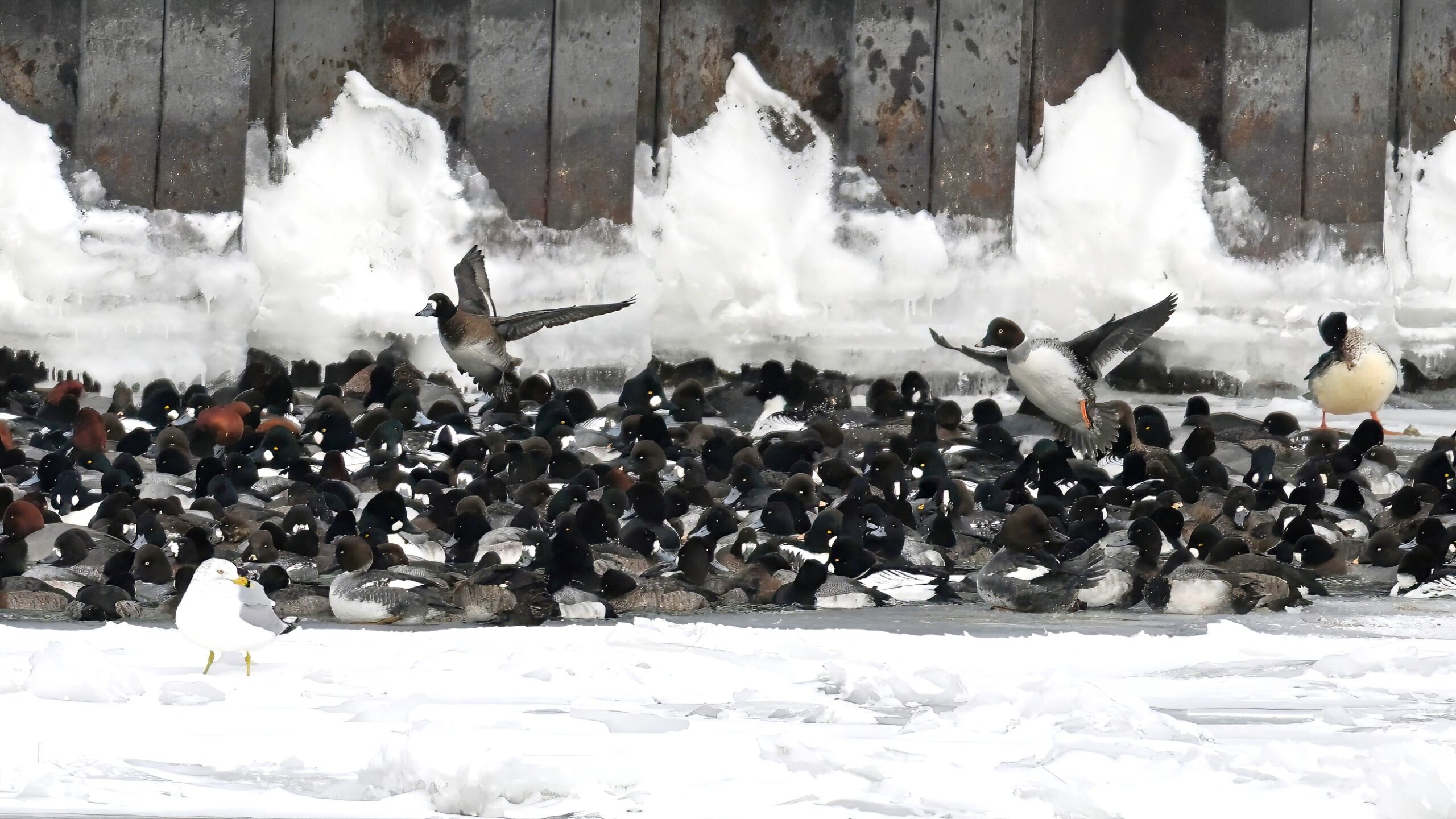 Lesser Scaups, Ring-necked Ducks, Common Merganser, & Red-breasted MerganserMale Ring-necked Ducks @ centerCommon Goldeneye (right, middle), Common Merganser (middle right), & Red-breasted Merganser (left)Ring-necked Ducks (top row)Red-breasted Merganser & ScaupBald Eagle on iceAnother pool with Canada Geese and lots of ducks