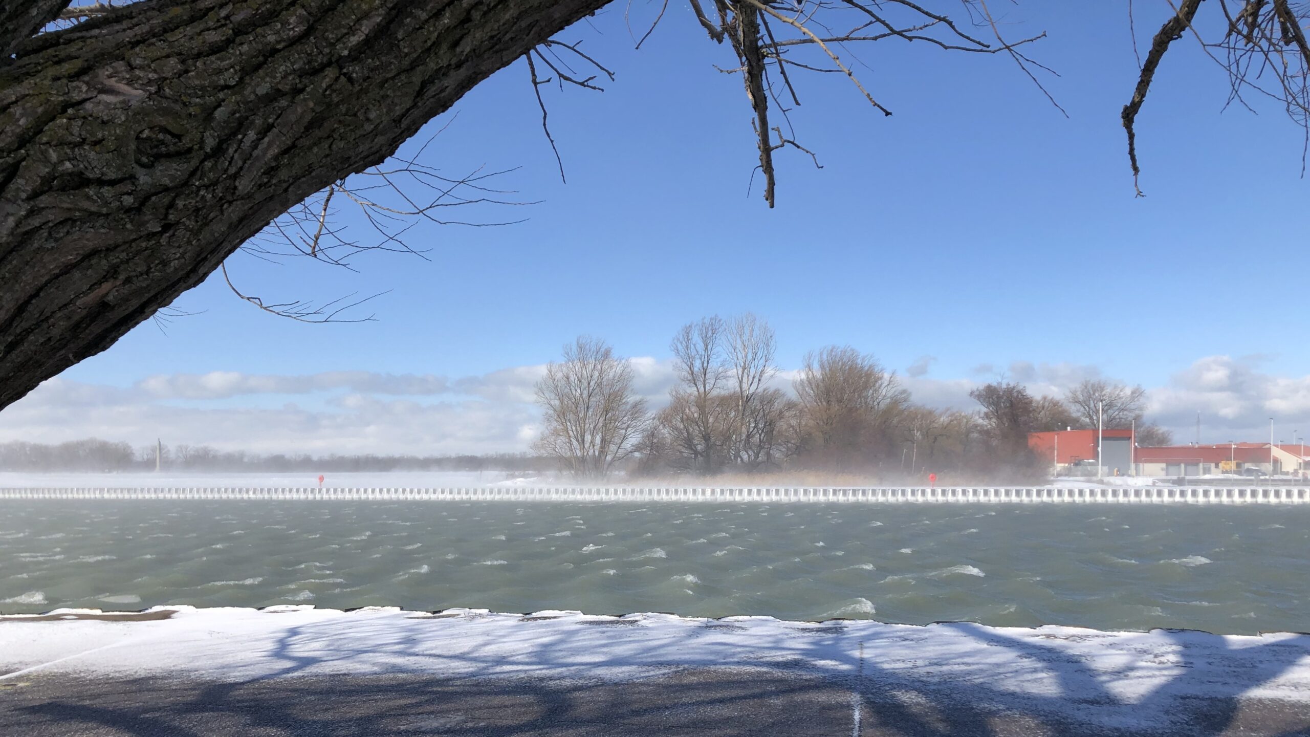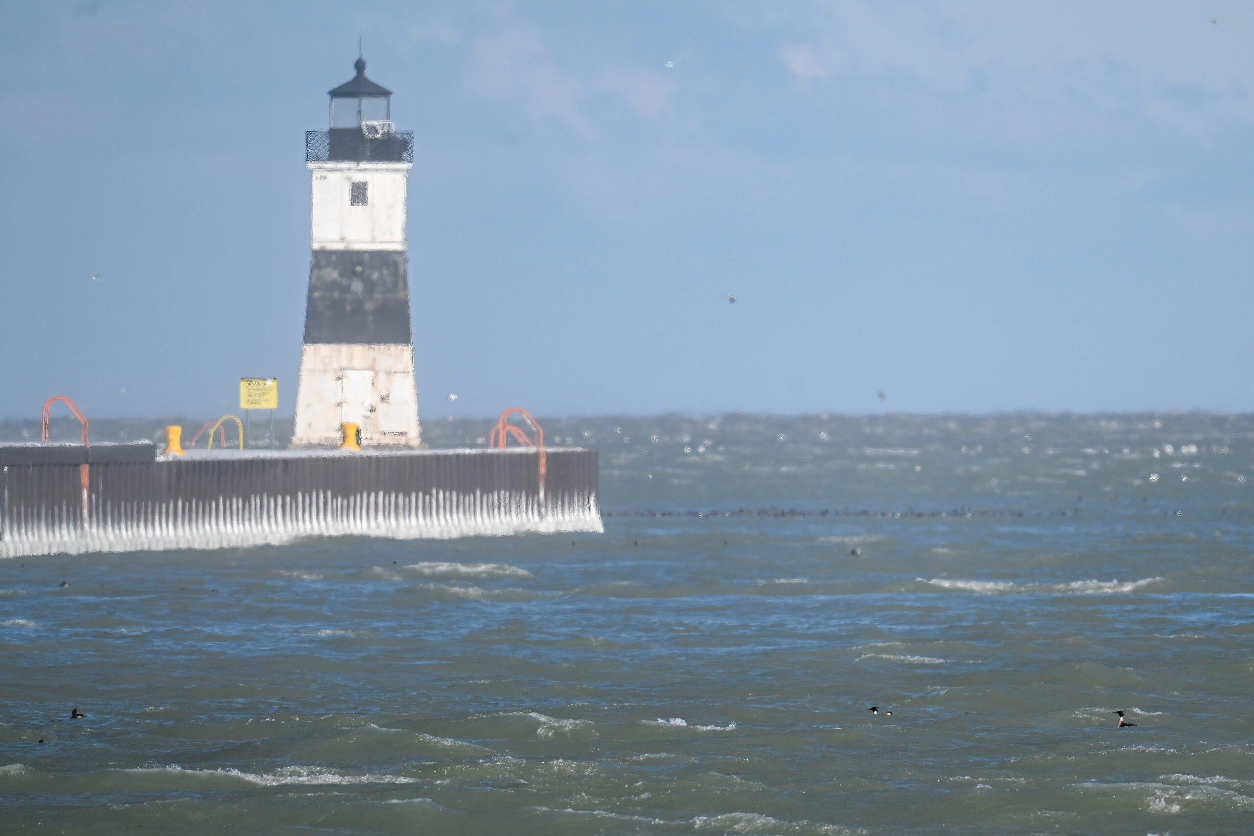 In today’s post, back to South Pier, Erie, Pennsylvania, about a week ago, on a different, even windier day. (Gusts 80 kph+.) At least it was sunny again! All shots from behind the “South Pier tree.”