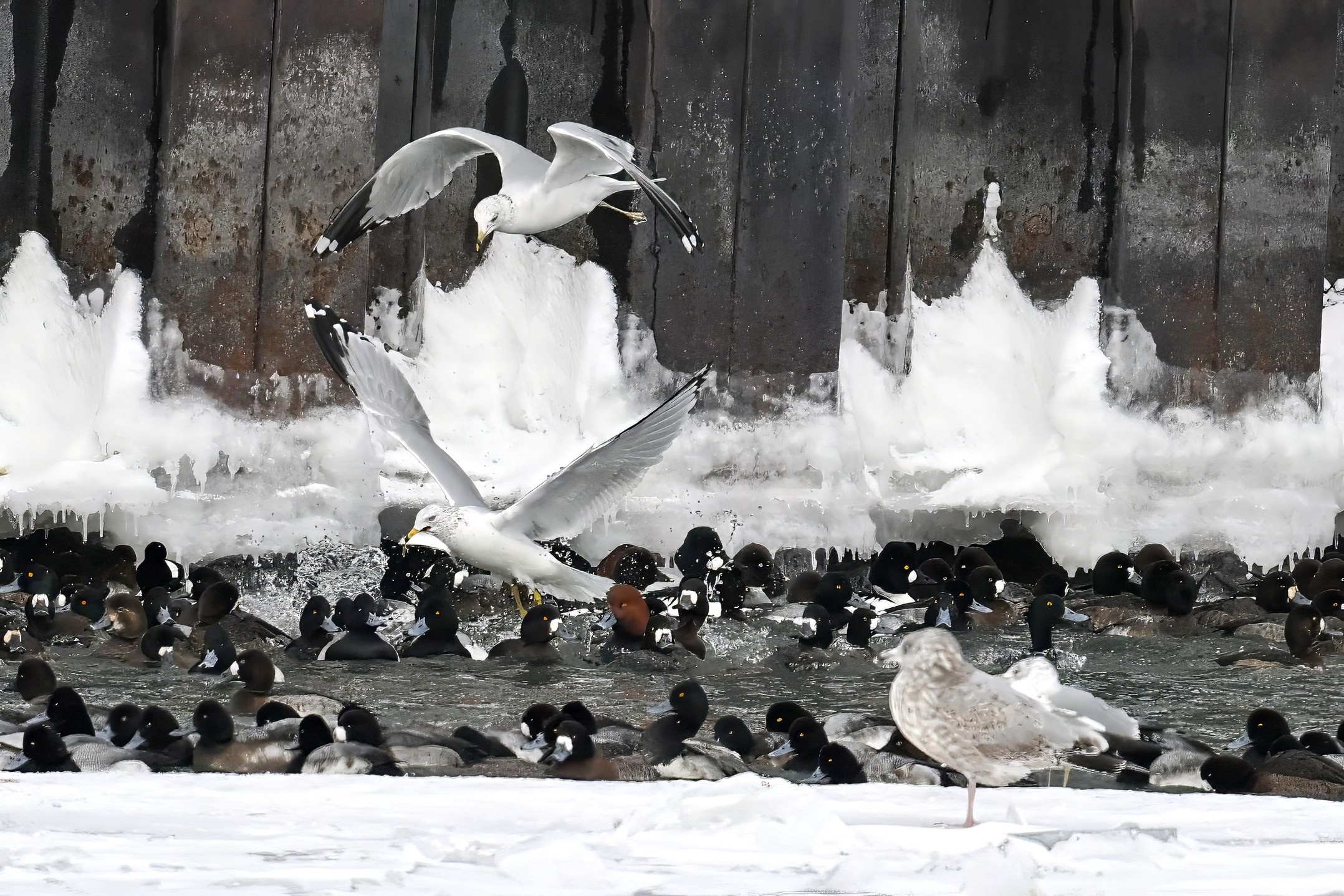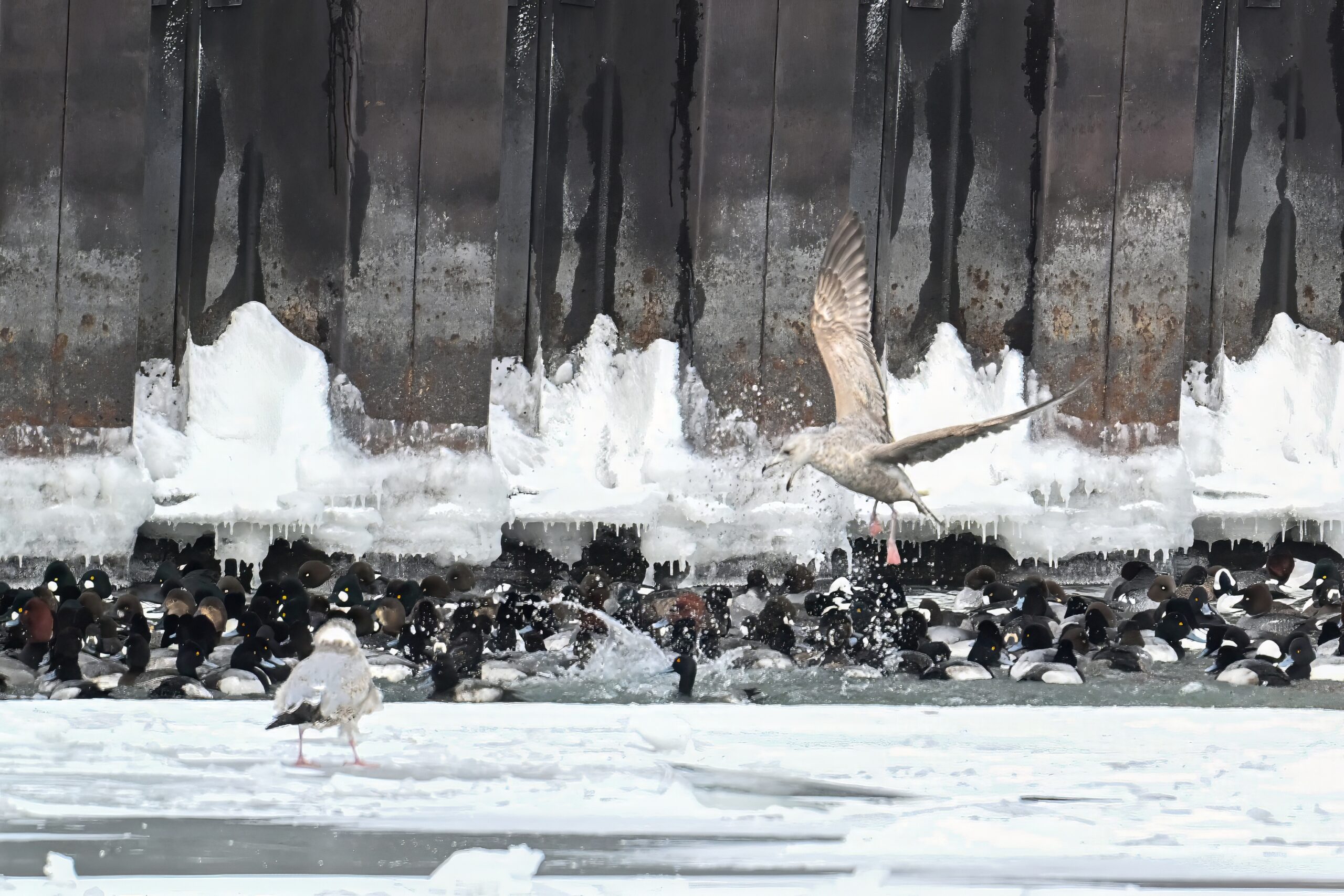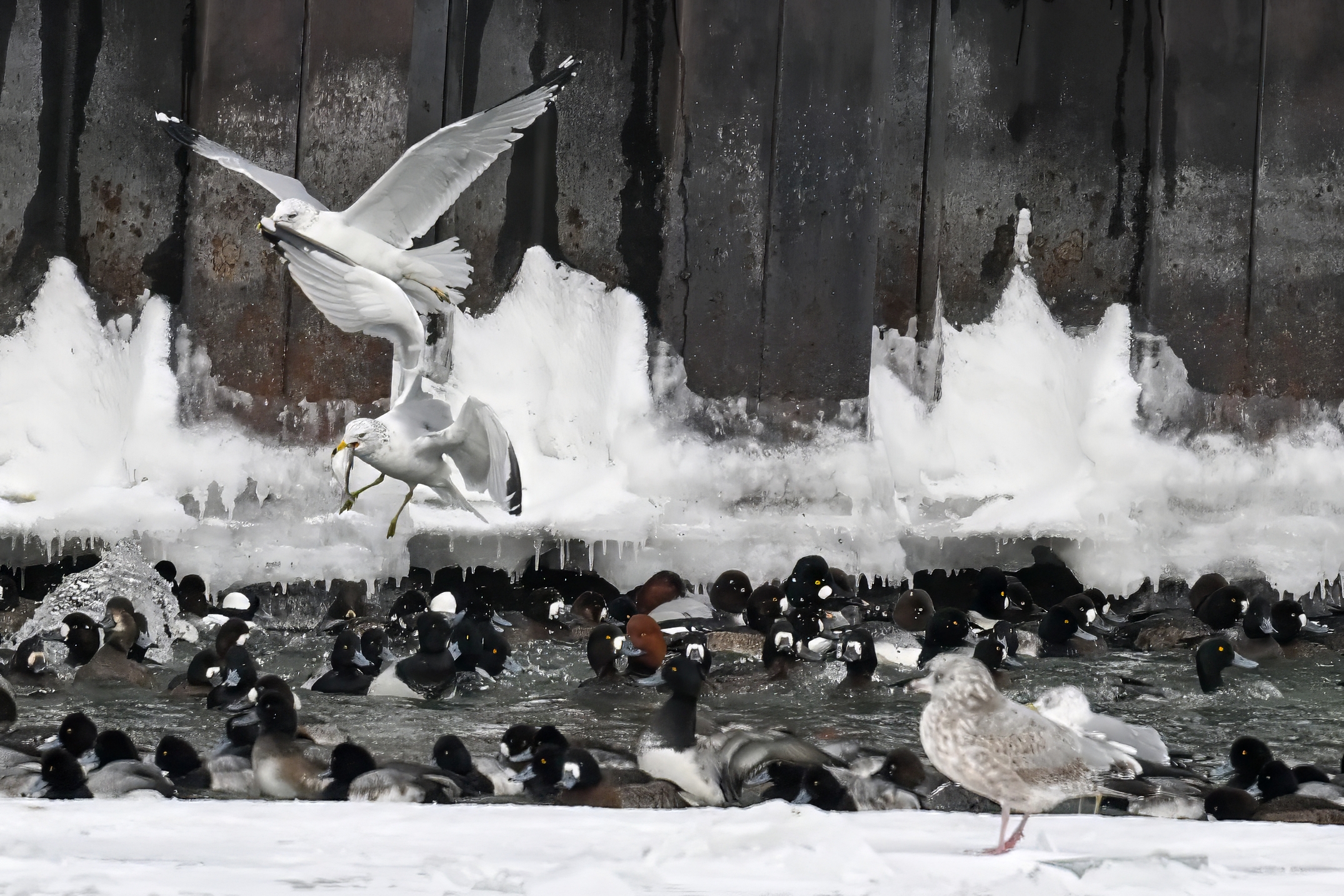 As with the Bald Eagles the day before, today it was gulls successfully ‘ice fishing’ despite the significant duck presence: