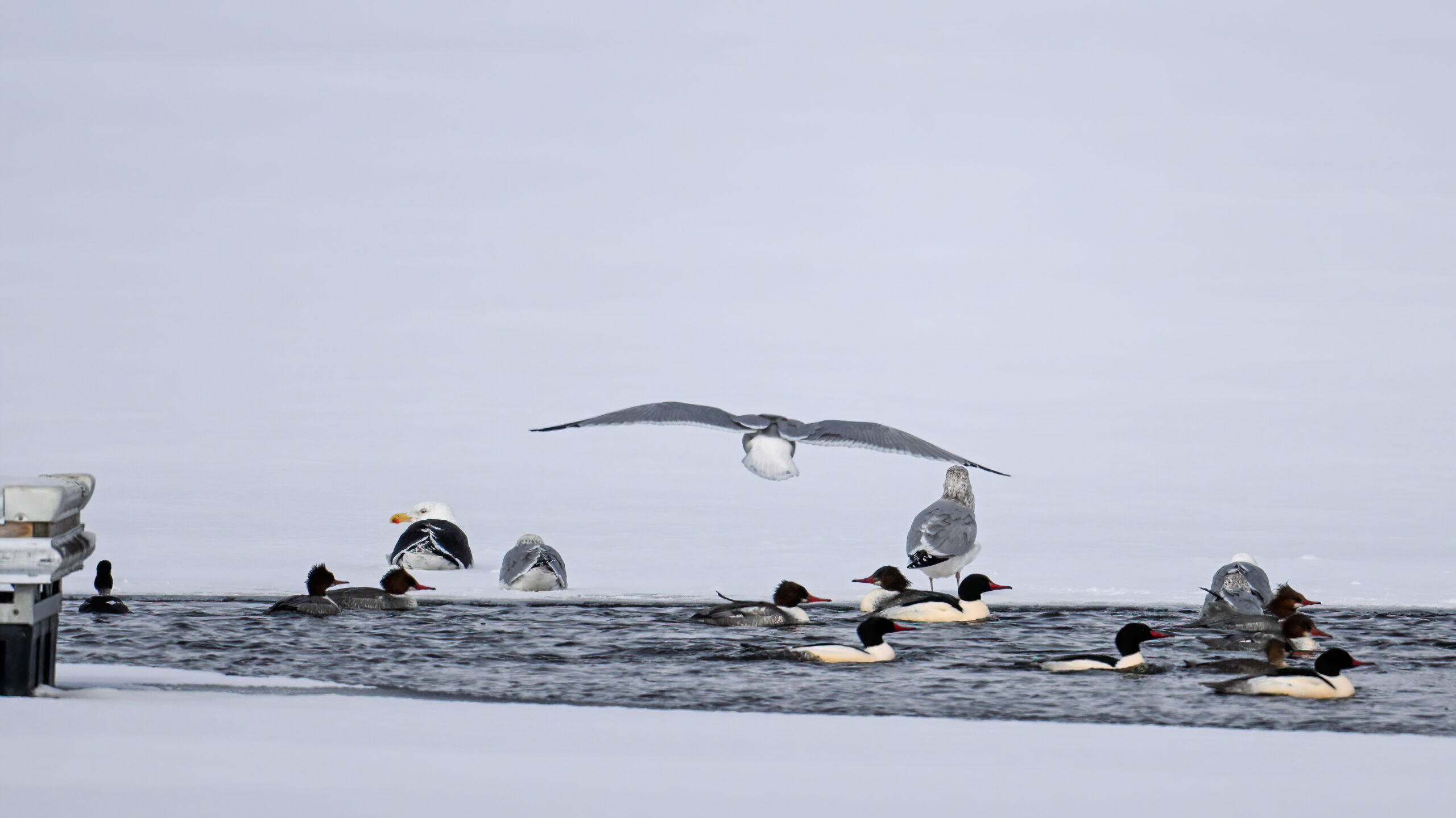 Canada Geese in flightOpen pools at marina w/ Great Black-backed Gull @ centerRing-necked Ducks in flightMale Common Merganser landing by docksMale Lesser ScaupLesser Scaup (l) + Ring-necked Duck (r)Male Common Merganser in flightCommon Merganser, Herring Gulls, & Great Black-backed GullMerganser takes off in snow drizzleMixed ducksAnother shot of female Ring-necked DuckImmature Herring Gull IGull IIRing-necked DucksImmature or female Red-breasted MerganserMale Red-breasted MerganserRed-breasted MergansersOasis pool (note single male Mallard @ far right)