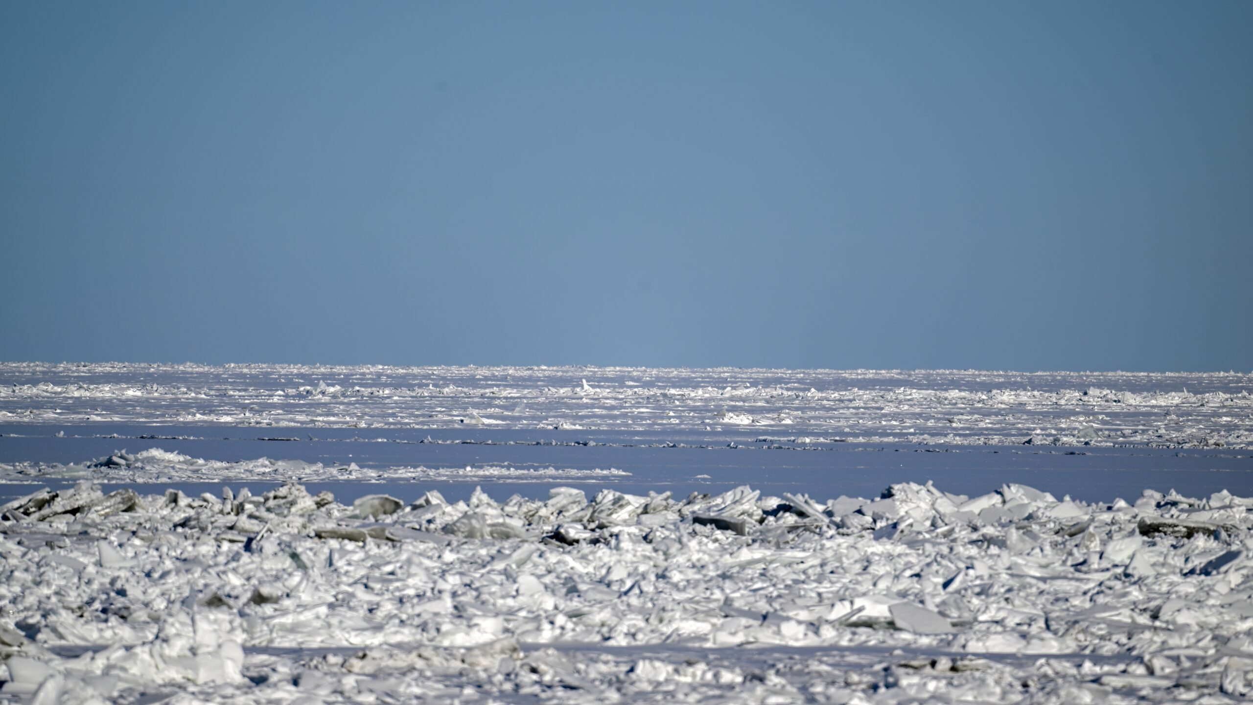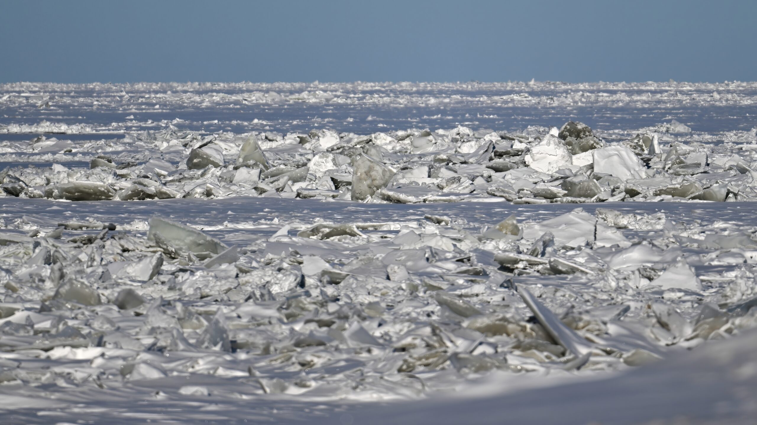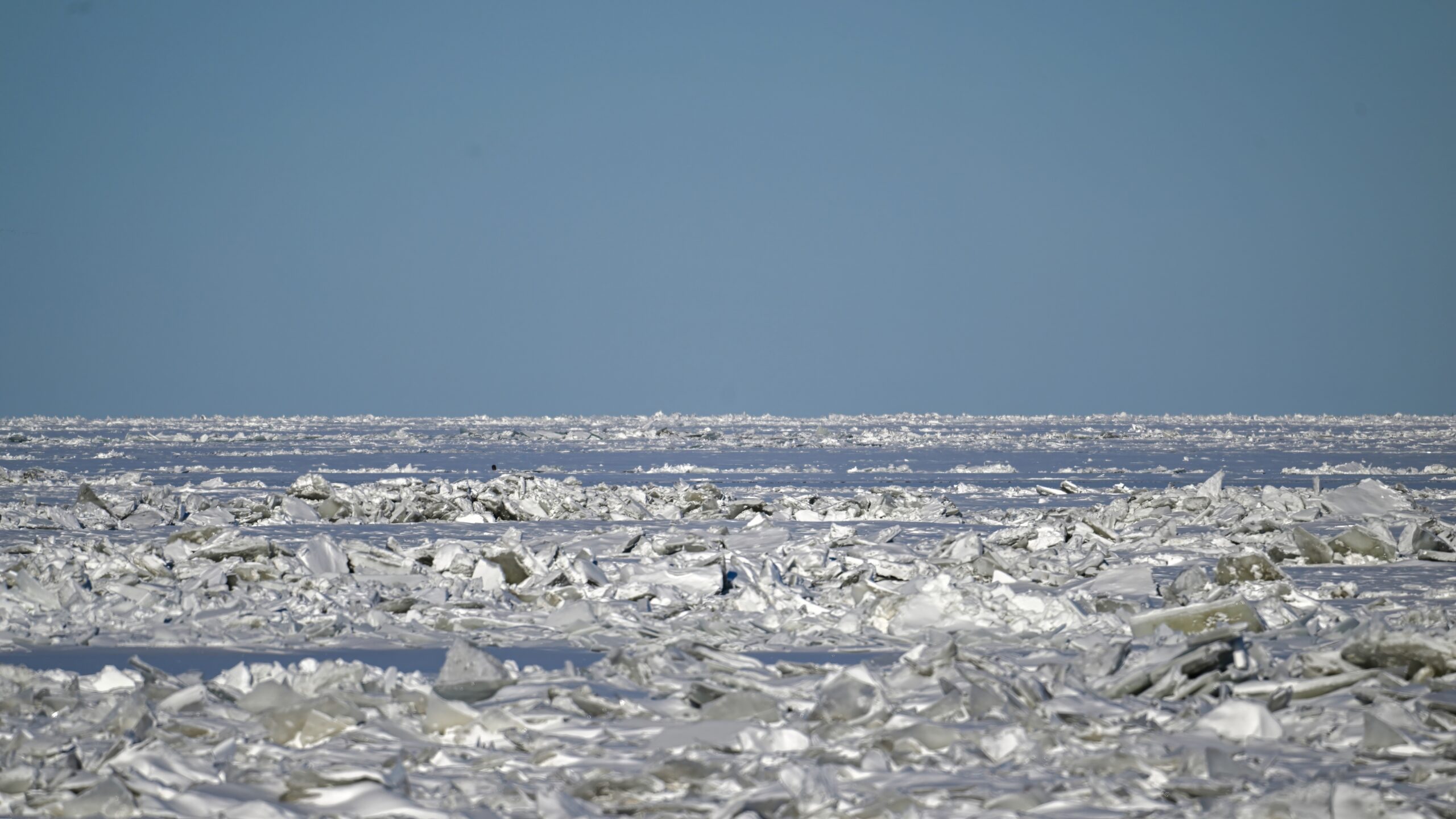 Another day of low high temps yesterday in Erie County, Pennsylvania, e.g., -12 deg C as of 2 PM. Presque Isle State Park very ‘frozen over’ and quiet except for the ice fisherpeople at busy places like Misery Bay. These shots from Thursday at South Pier again, where the remaining open water had finally frozen over: