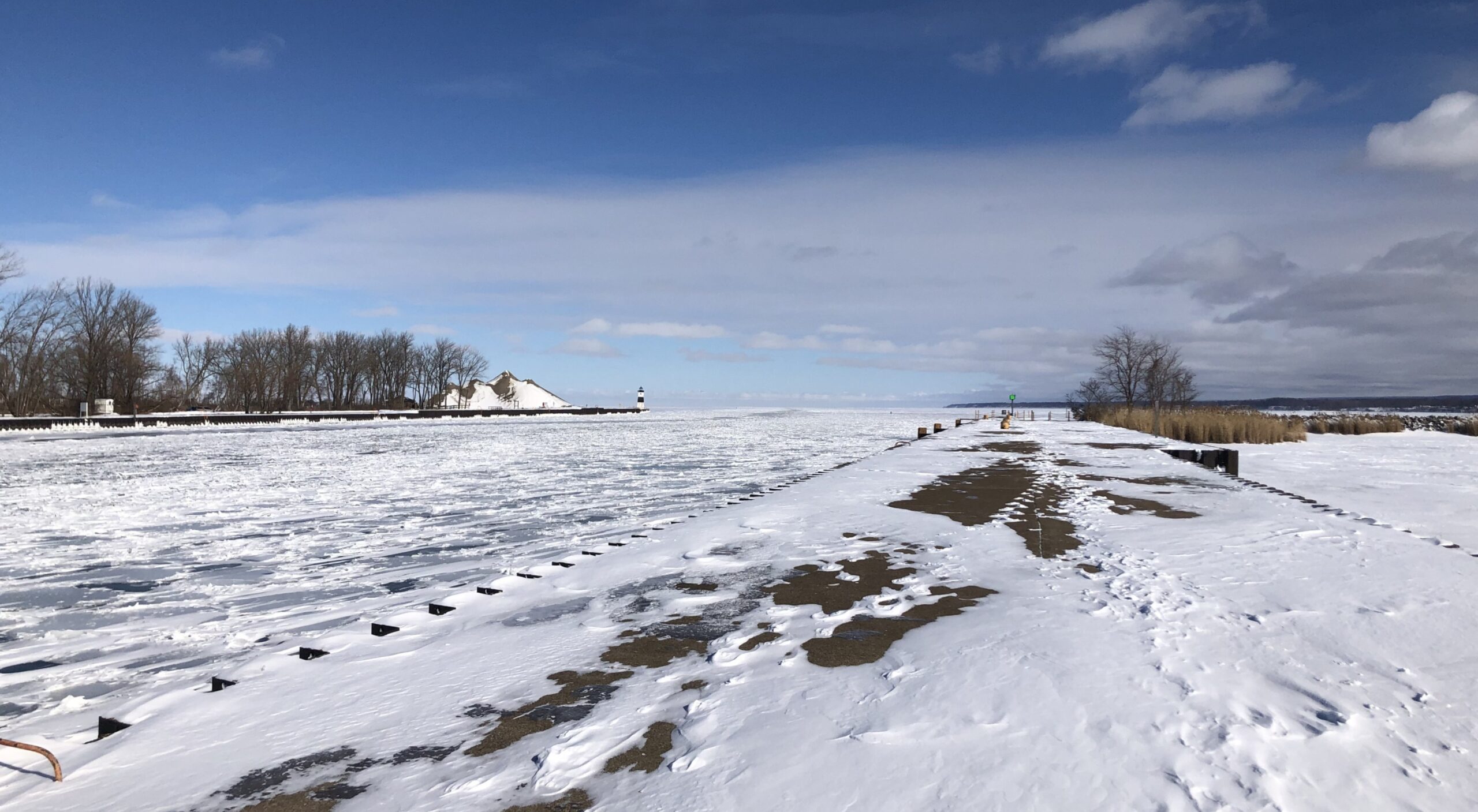 In yesterday’s post, it was a week+ ago with unfrozen, choppy water on the entrance channel to Presque Isle Bay between North Pier and South Pier. As of a couple days ago, with the recent cold snap, current conditions are ‘mostly frozen.’ Here’s the view from South Pier looking towards Presque Isle Bay: