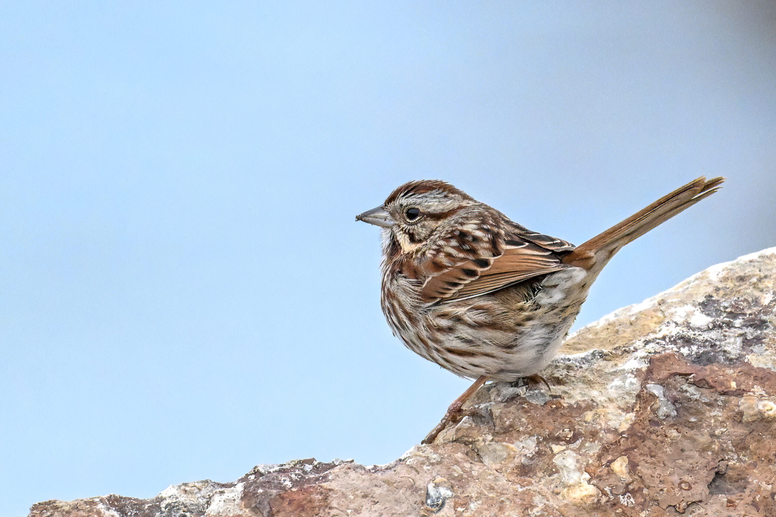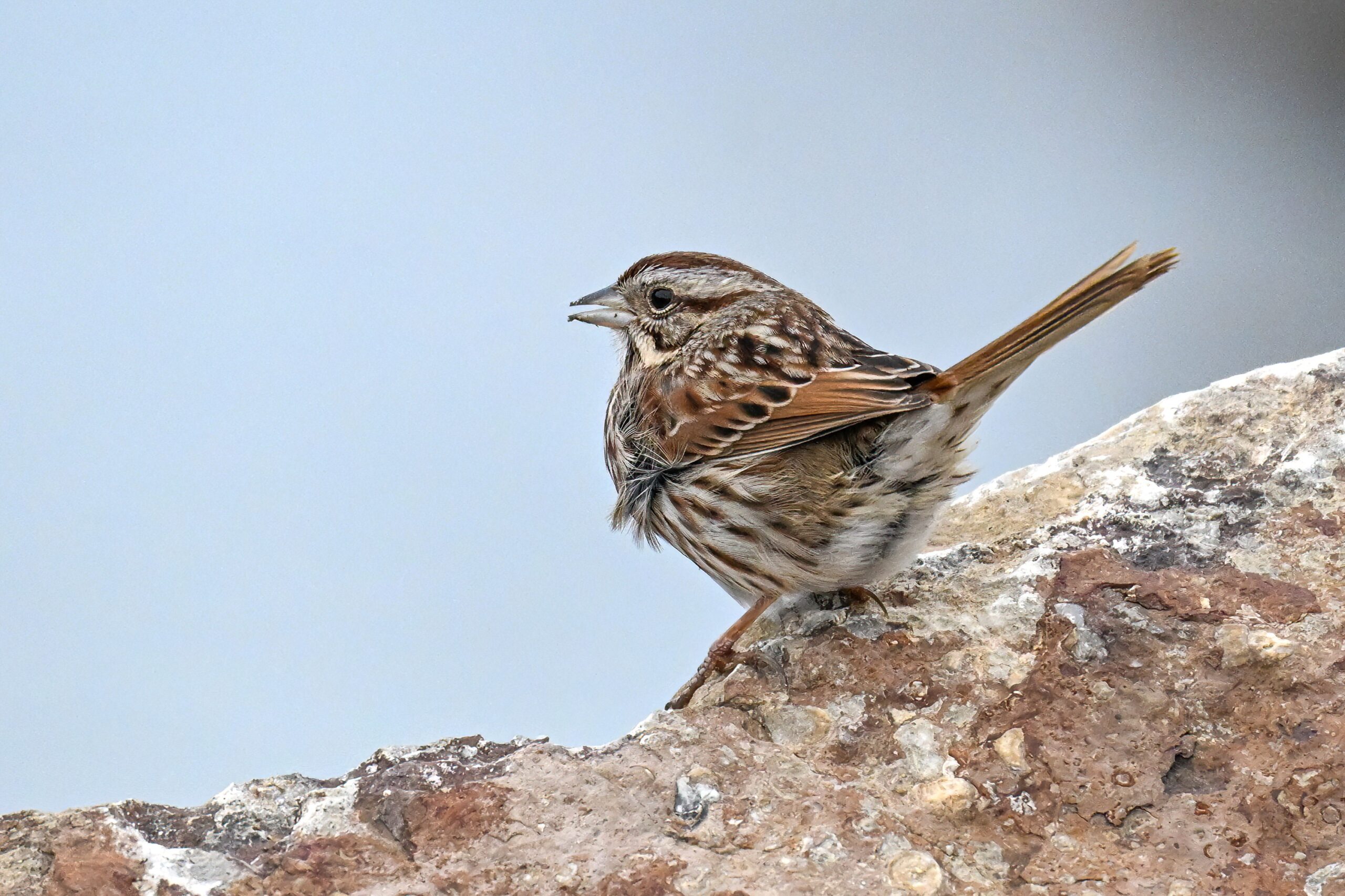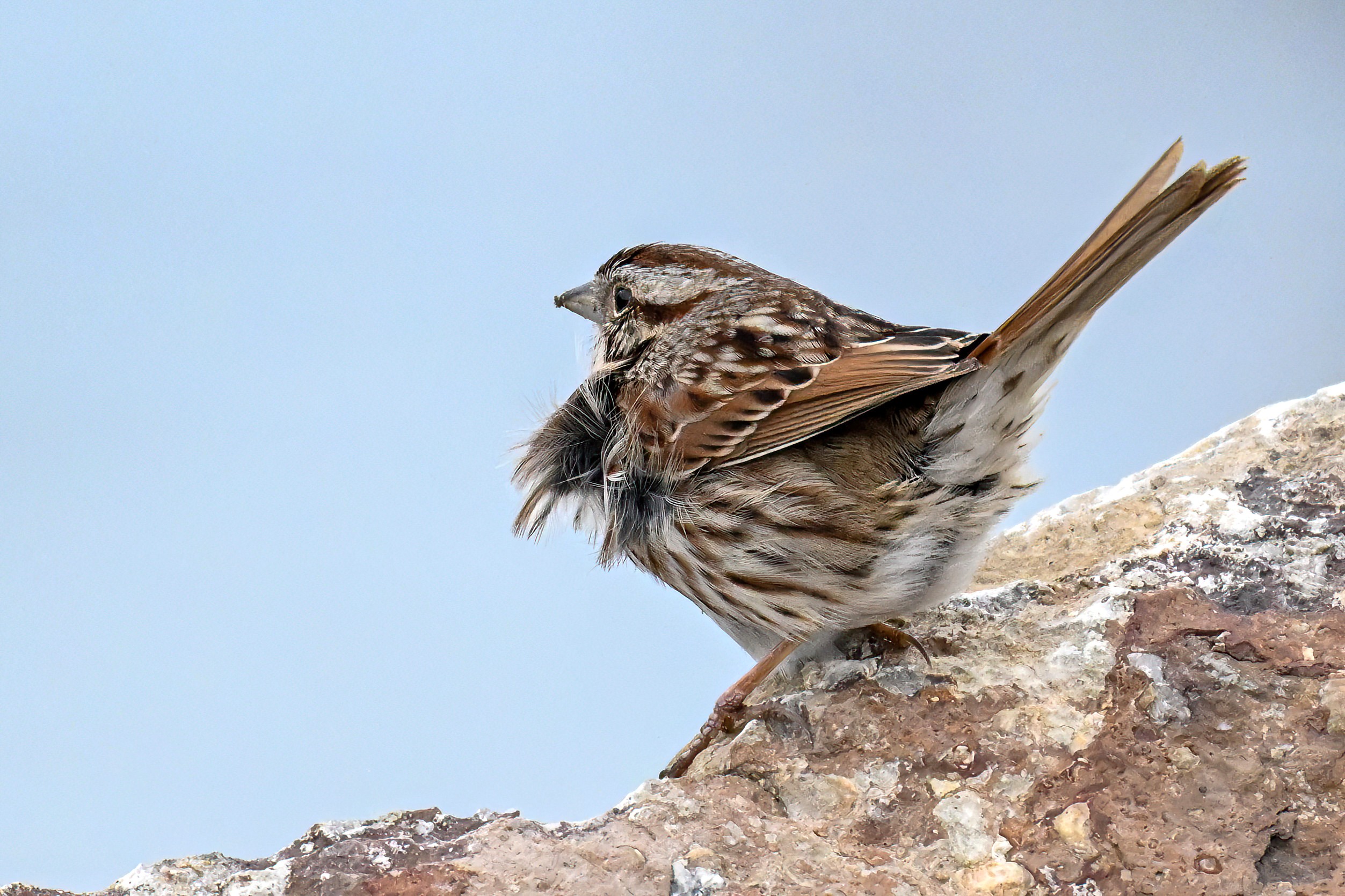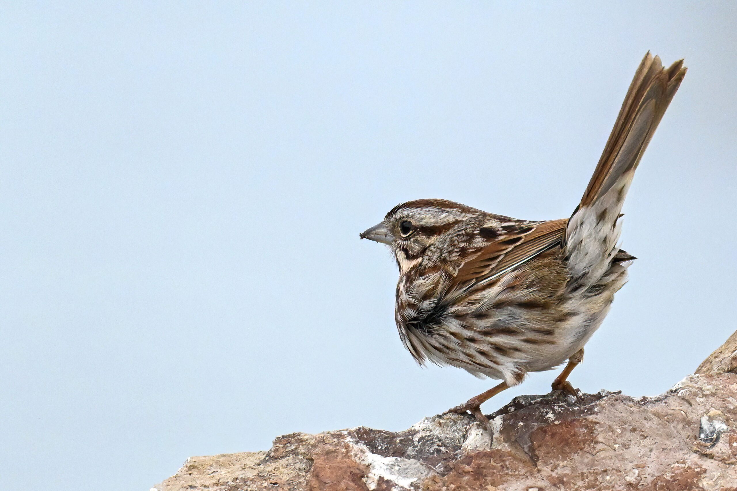 In today’s post, digital photographs from a few days ago at East Ave Boat Launch (Erie, Pennsylvania), featuring the first decent sighting this year of beautiful Song Sparrow on the boat launch breakwater: