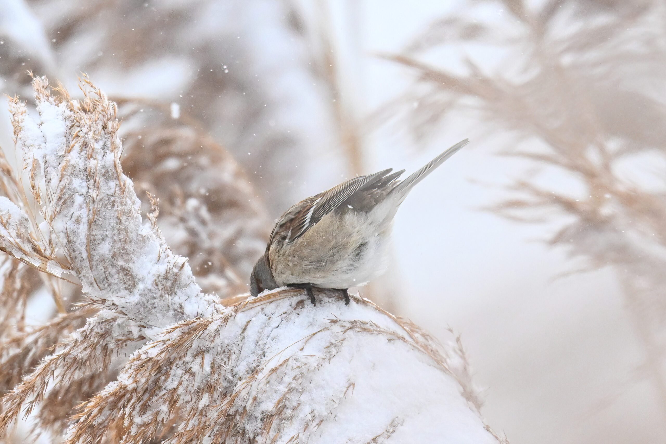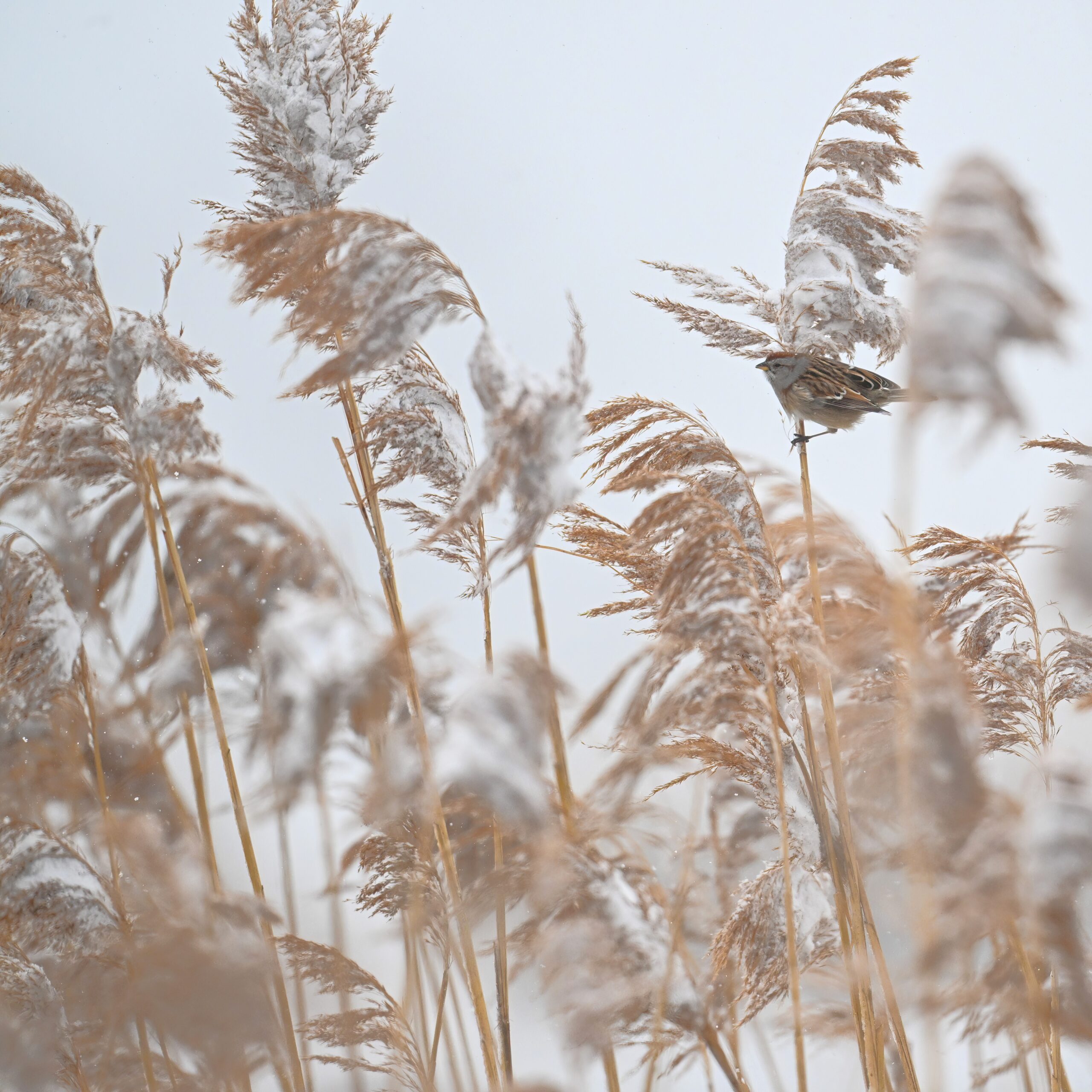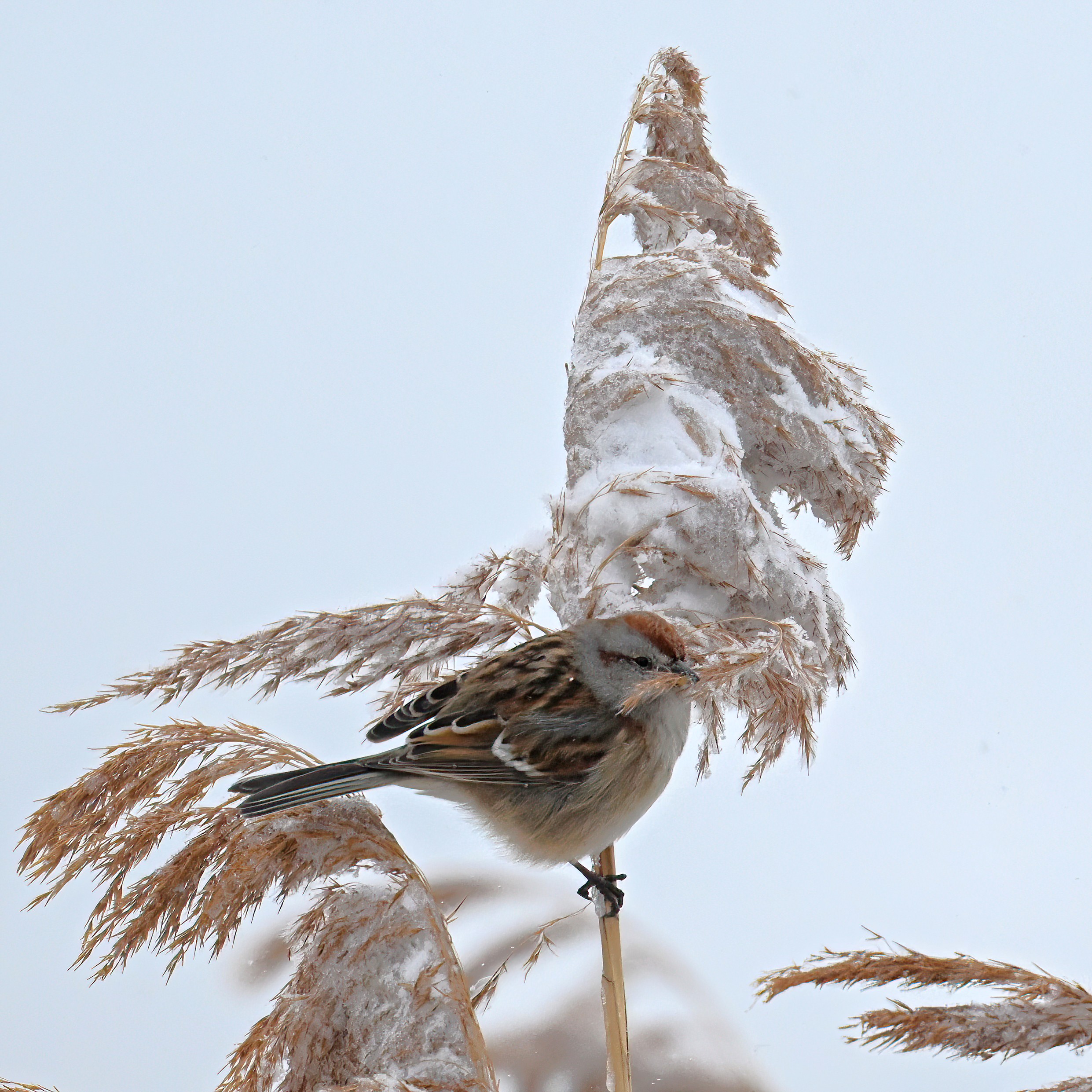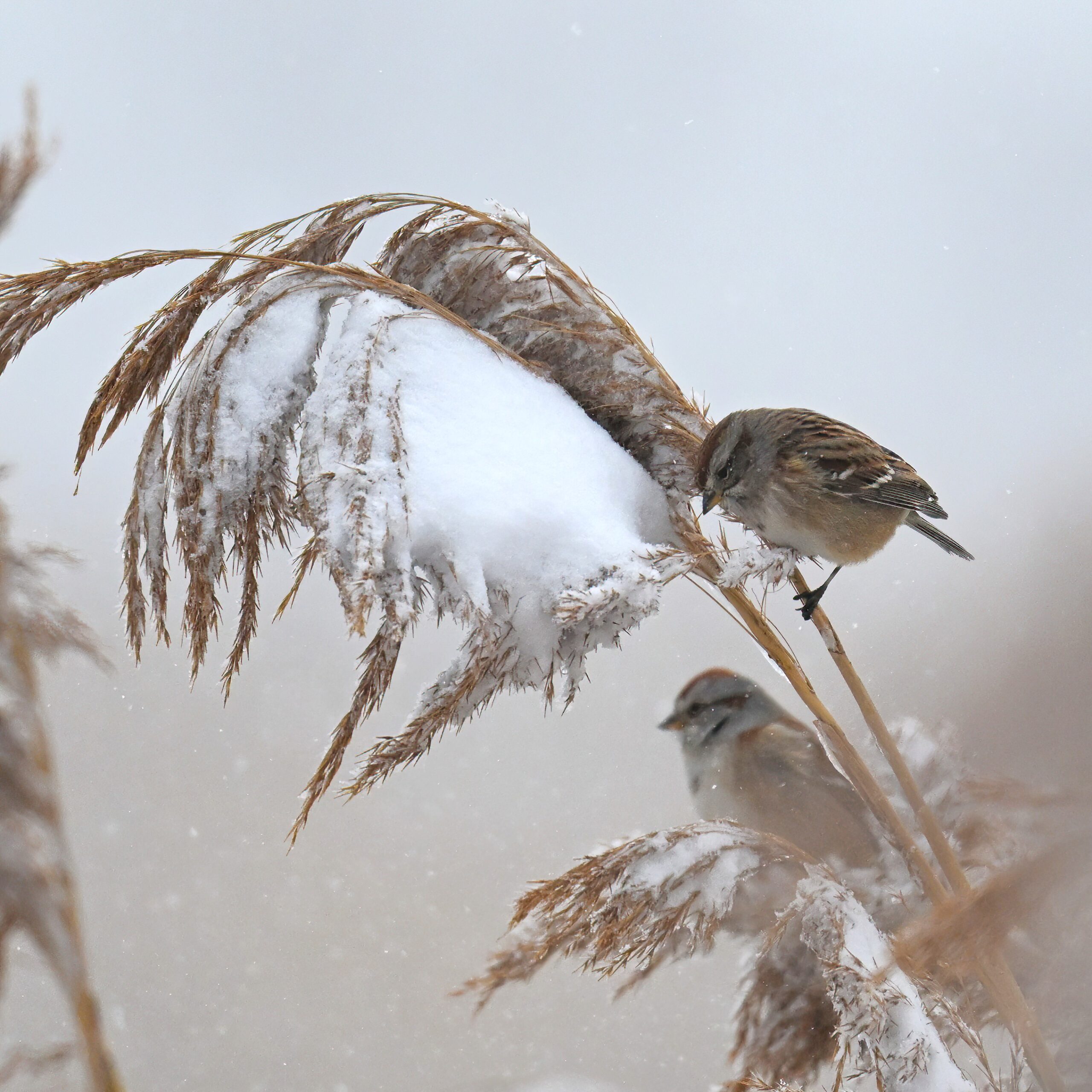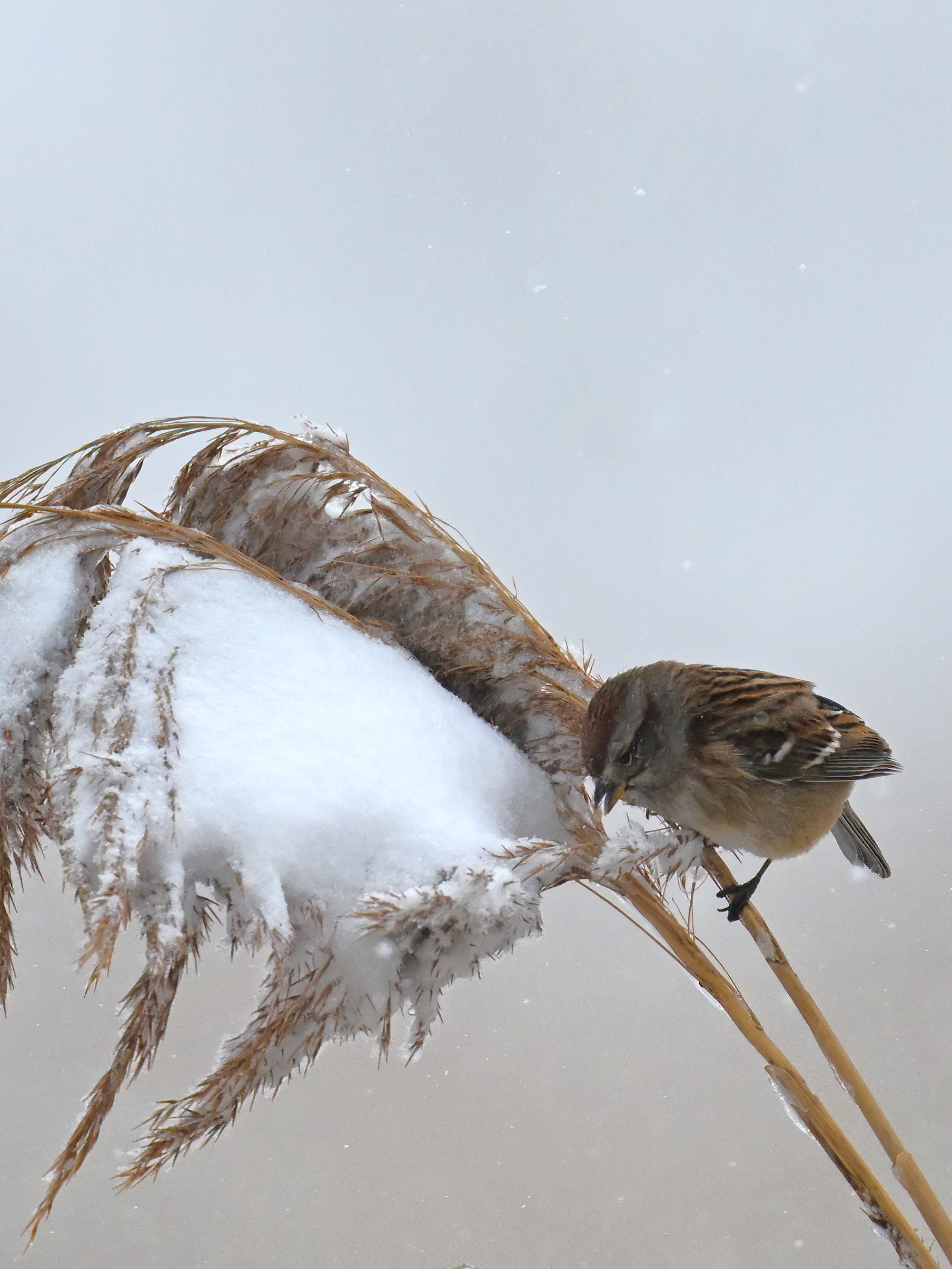 Lots of snow in Erie County, Pennsylvania yesterday. Lots and lot of snow. And cold. Also wind. And cold wind with snow. Maybe 30+ cm (12+ inches) of fresh powder, if not more. These shots of American Tree Sparrows foraging on snow-covered phragmites (common reed) – taken under very dark/overcast conditions – from a very brief and rather ill-advised stop at South Pier: