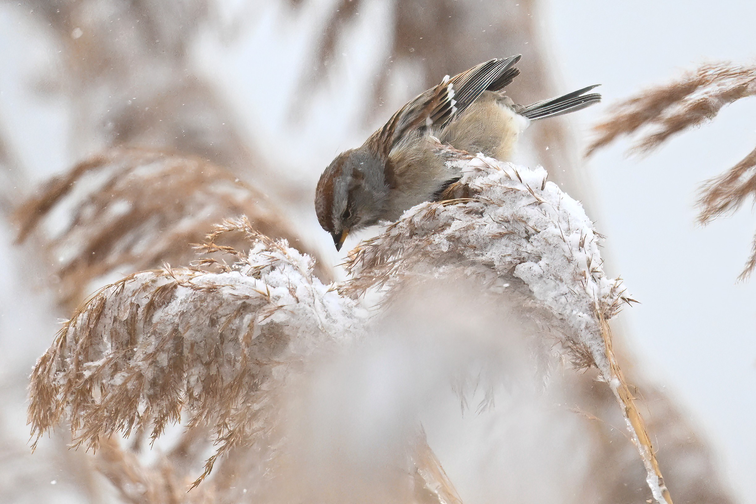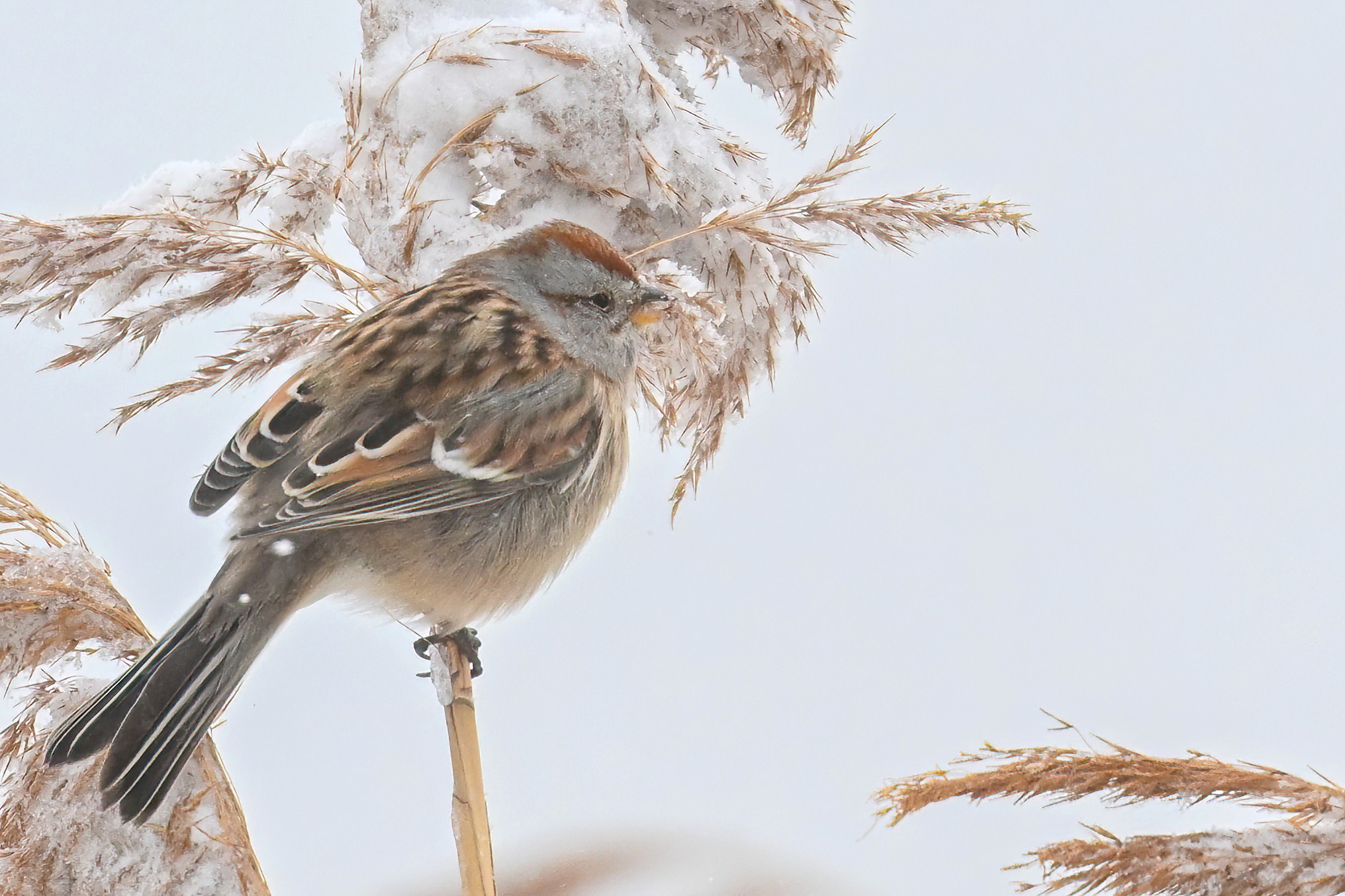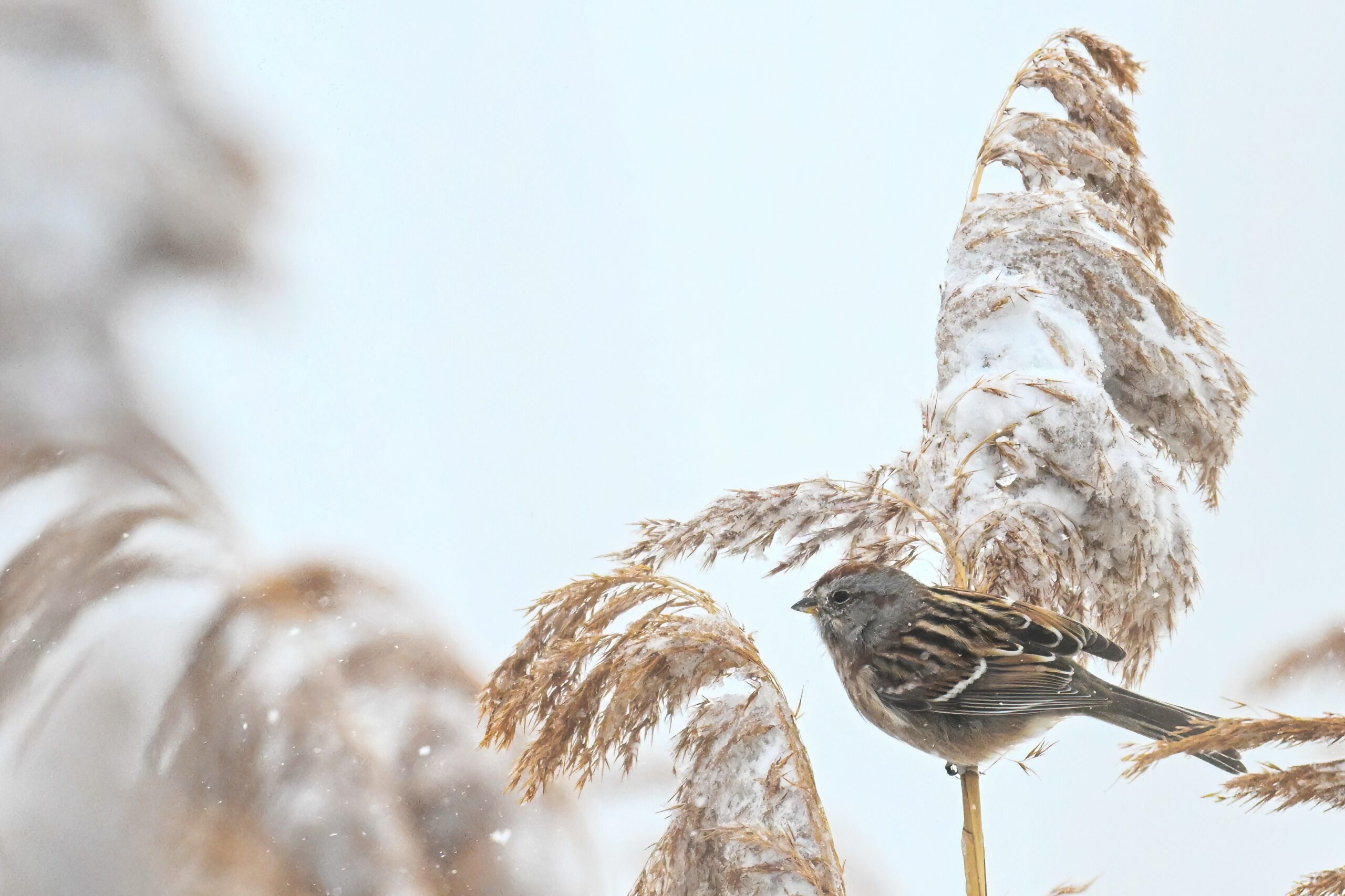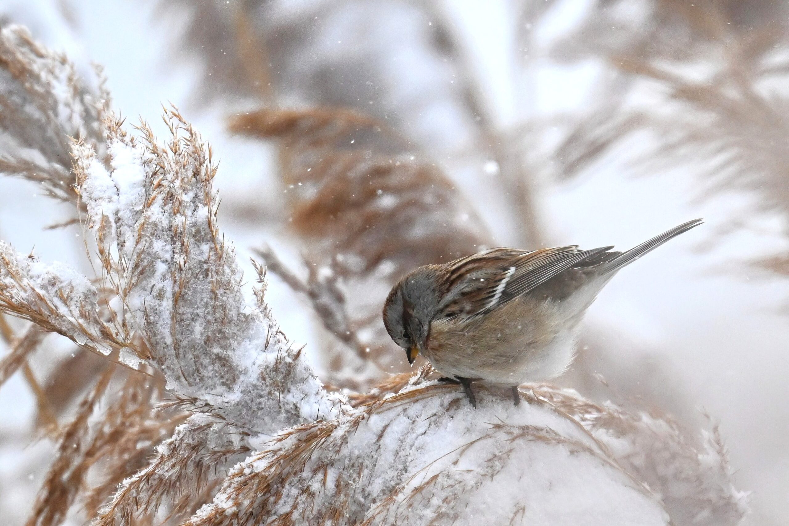 Lots of snow in Erie County, Pennsylvania yesterday. Lots and lot of snow. And cold. Also wind. And cold wind with snow. Maybe 30+ cm (12+ inches) of fresh powder, if not more. These shots of American Tree Sparrows foraging on snow-covered phragmites (common reed) – taken under very dark/overcast conditions – from a very brief and rather ill-advised stop at South Pier: