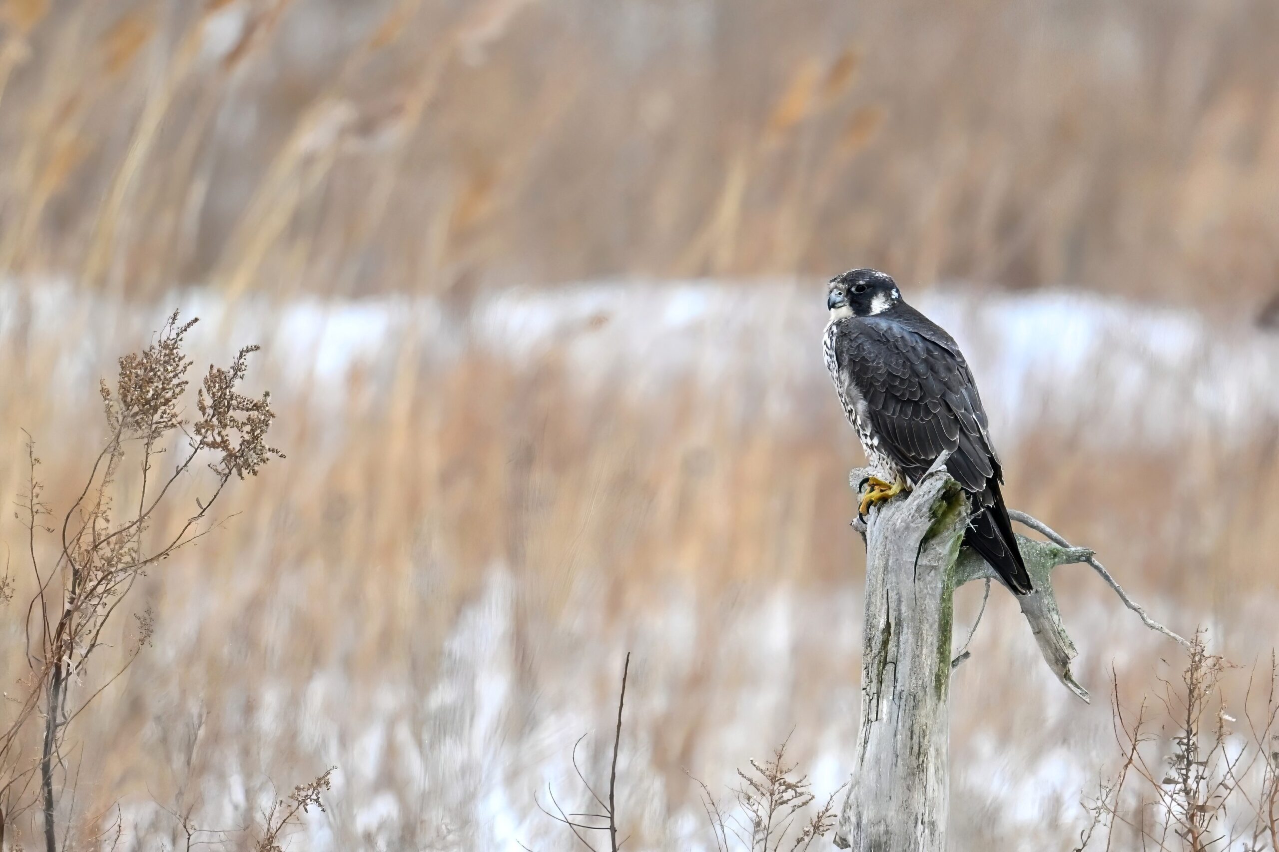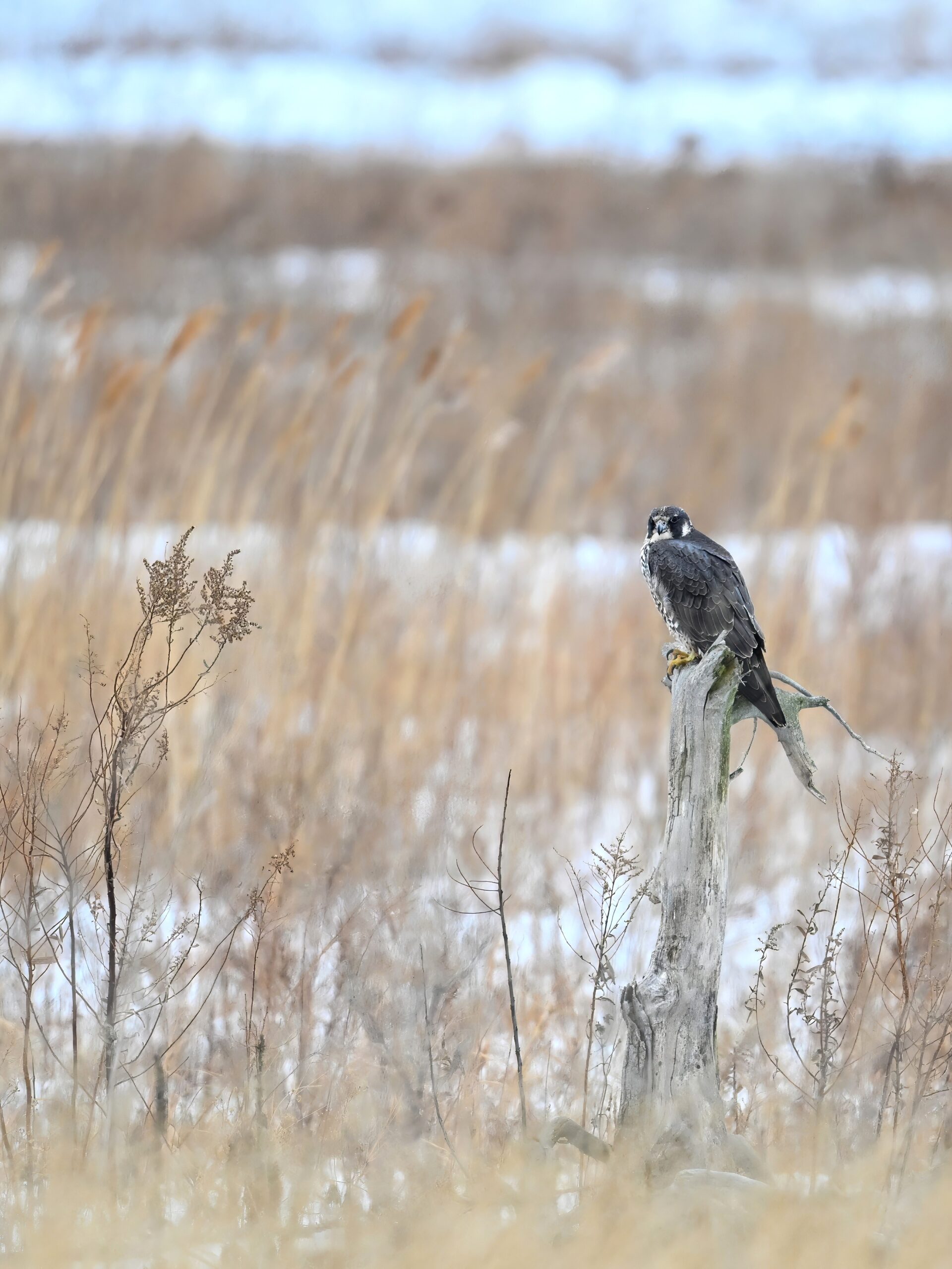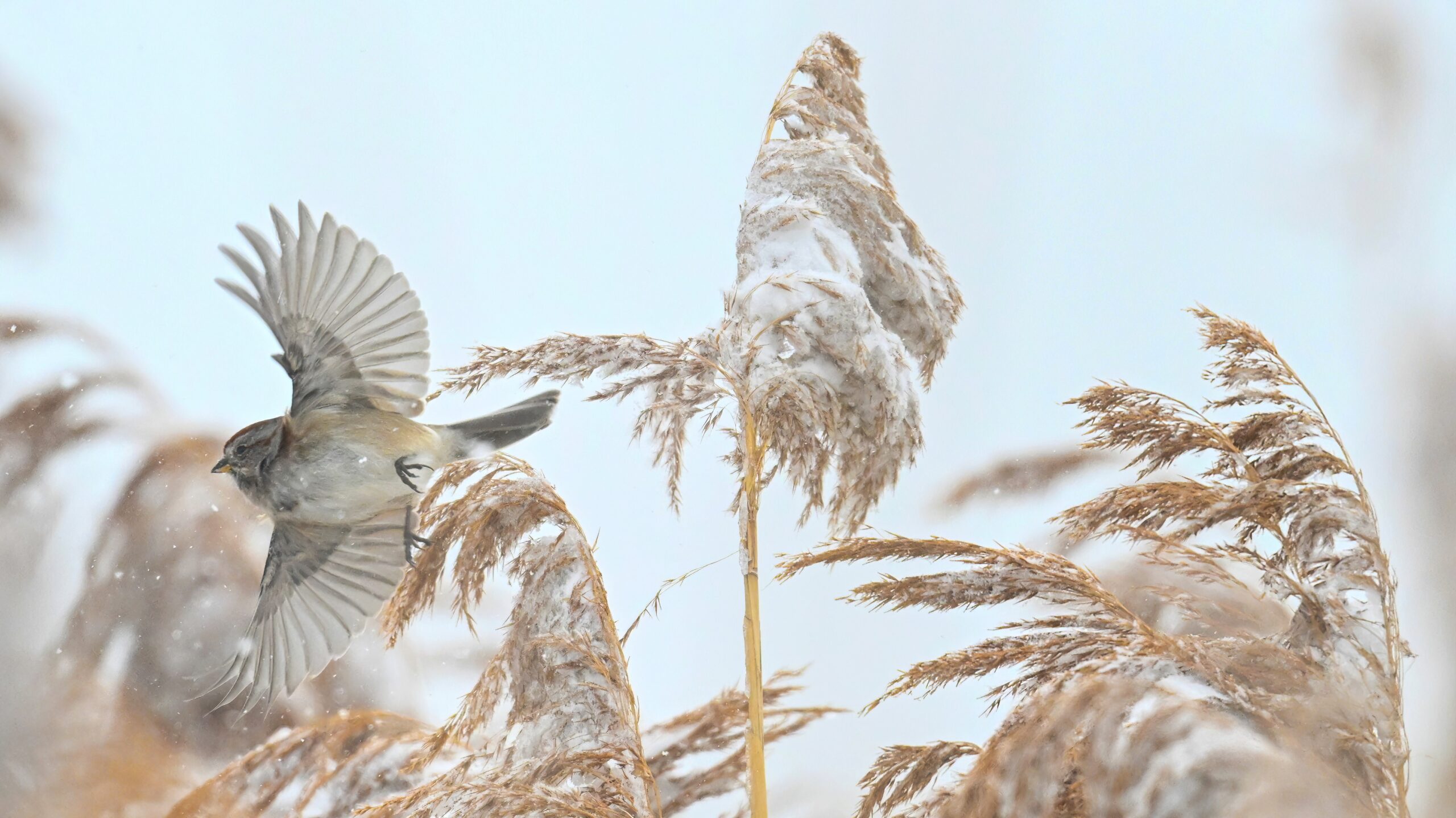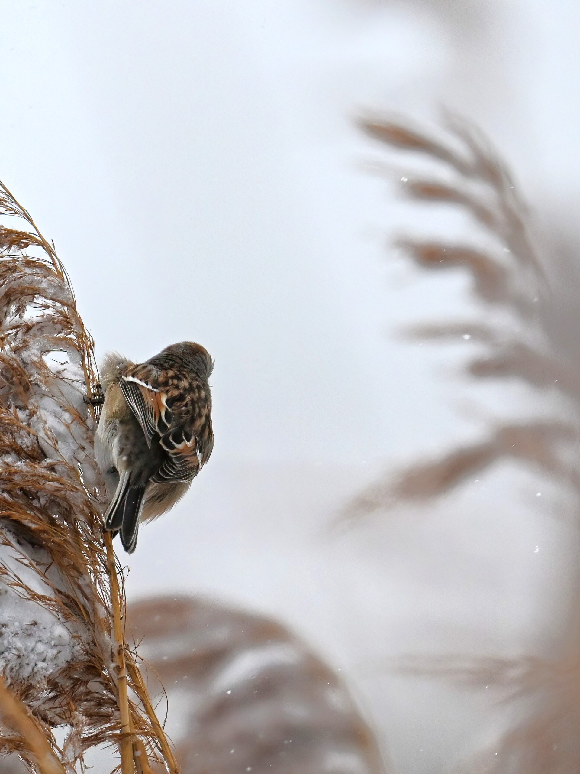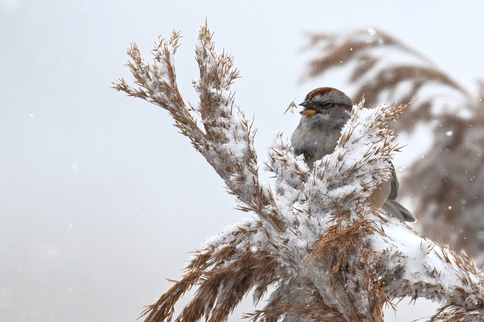 Lots of snow in Erie County, Pennsylvania yesterday. Lots and lot of snow. And cold. Also wind. And cold wind with snow. Maybe 30+ cm (12+ inches) of fresh powder, if not more. These shots of American Tree Sparrows foraging on snow-covered phragmites (common reed) – taken under very dark/overcast conditions – from a very brief and rather ill-advised stop at South Pier: