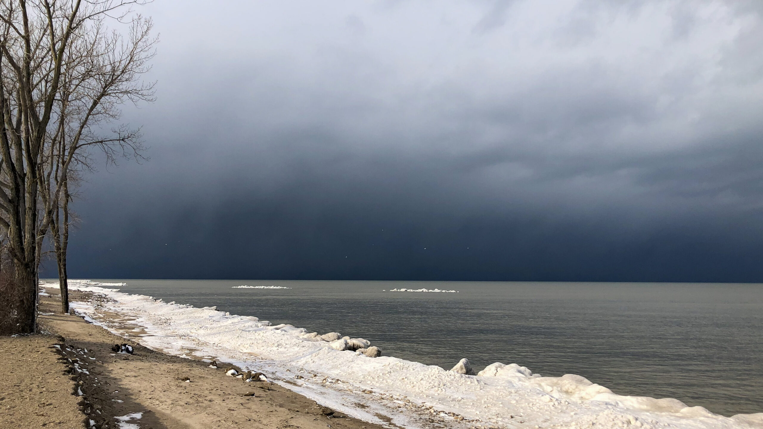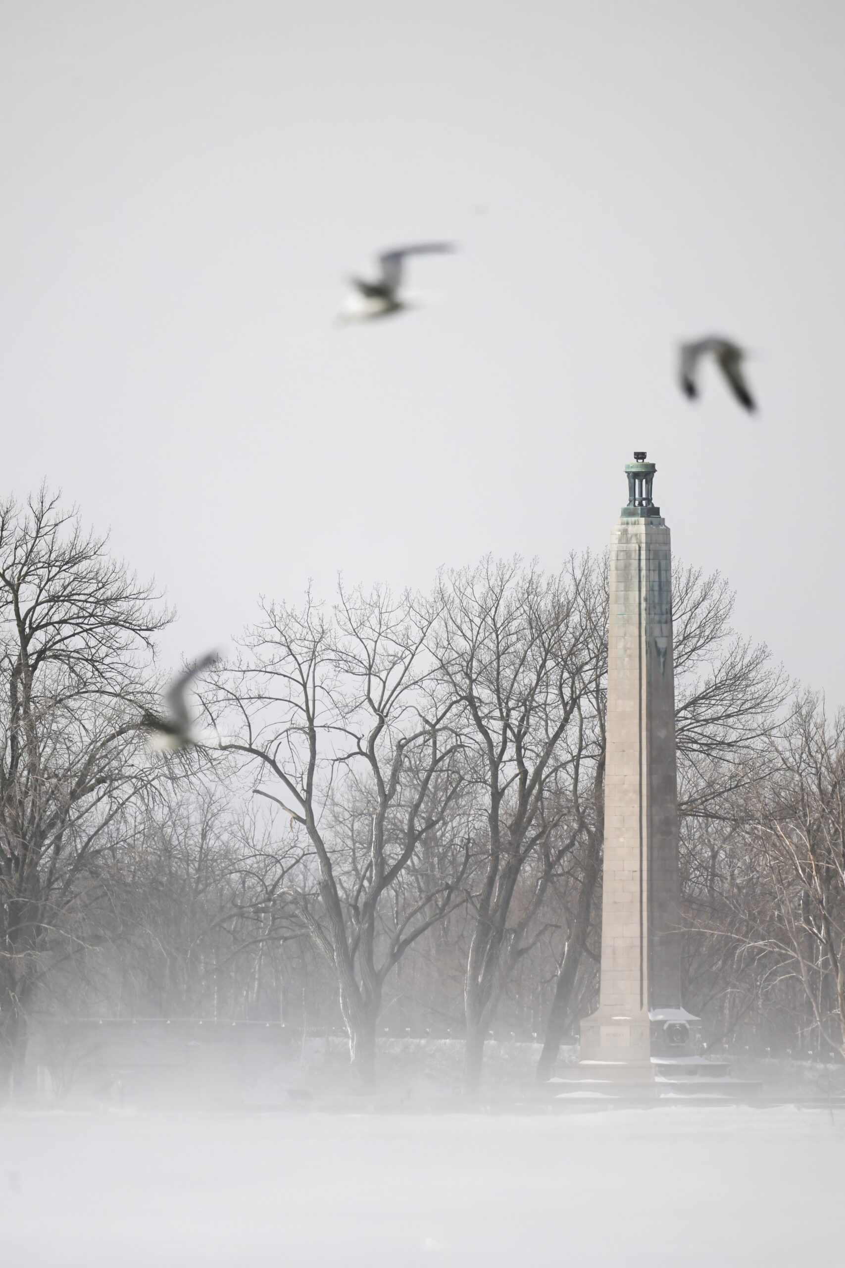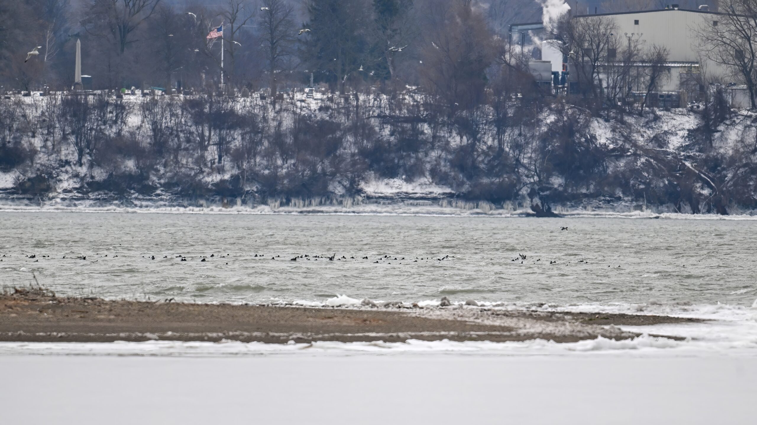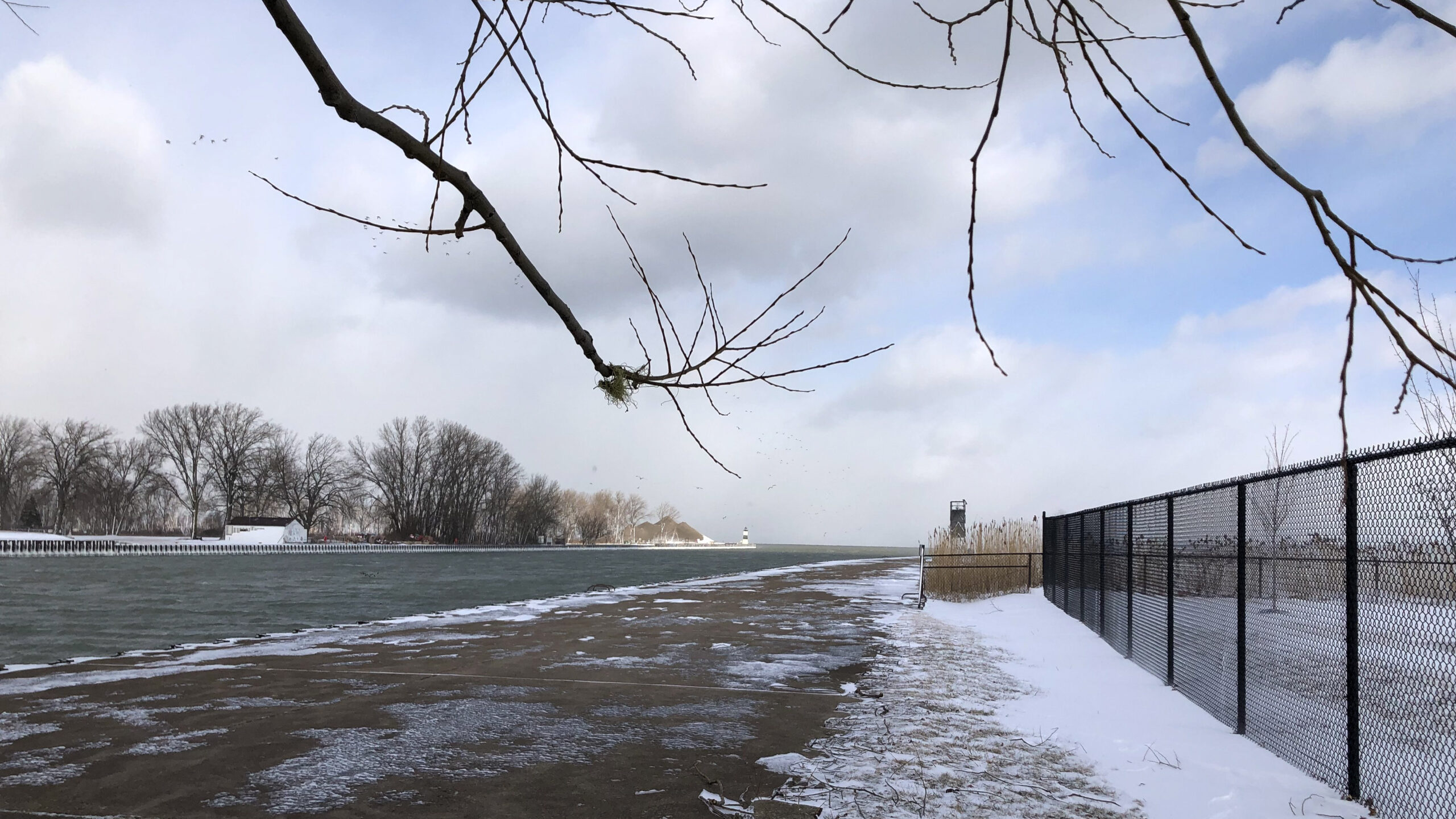 View of South Pier from behind the “South Pier tree”Perry Monument w/ blowing ice/snowLong-tailed Duck