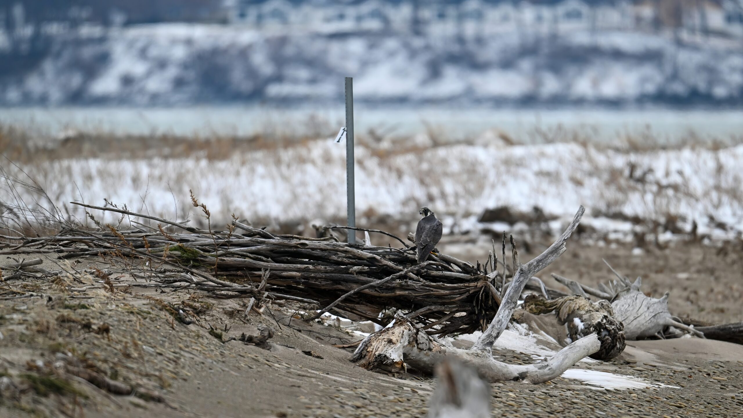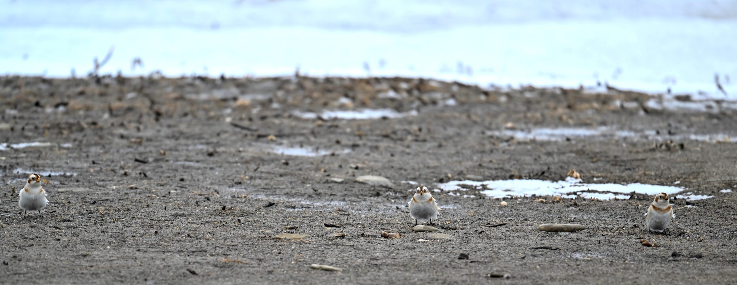 Three Snow Buntings @ center of shotView from outer Gull Point towards North Pier Light and Erie