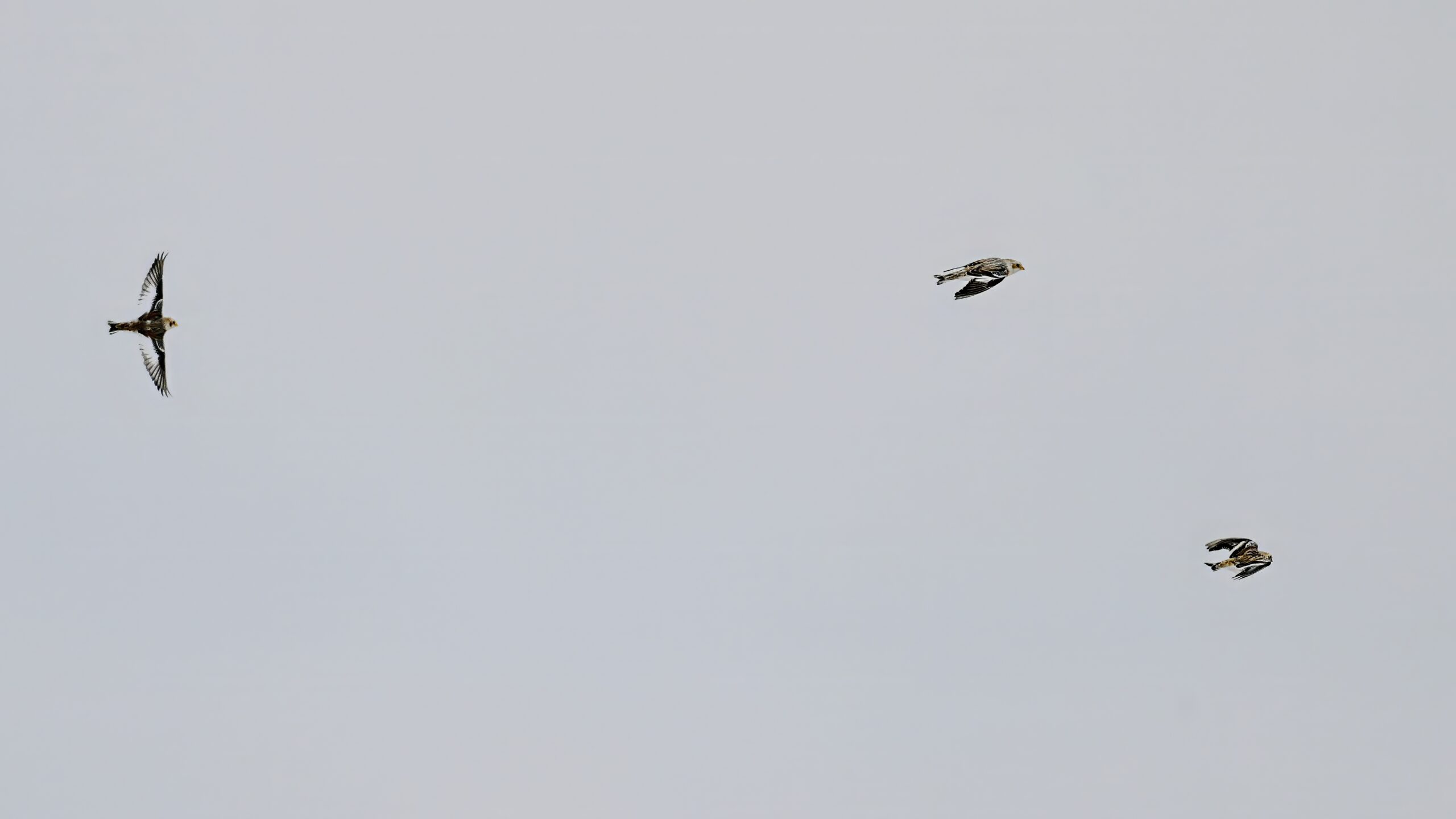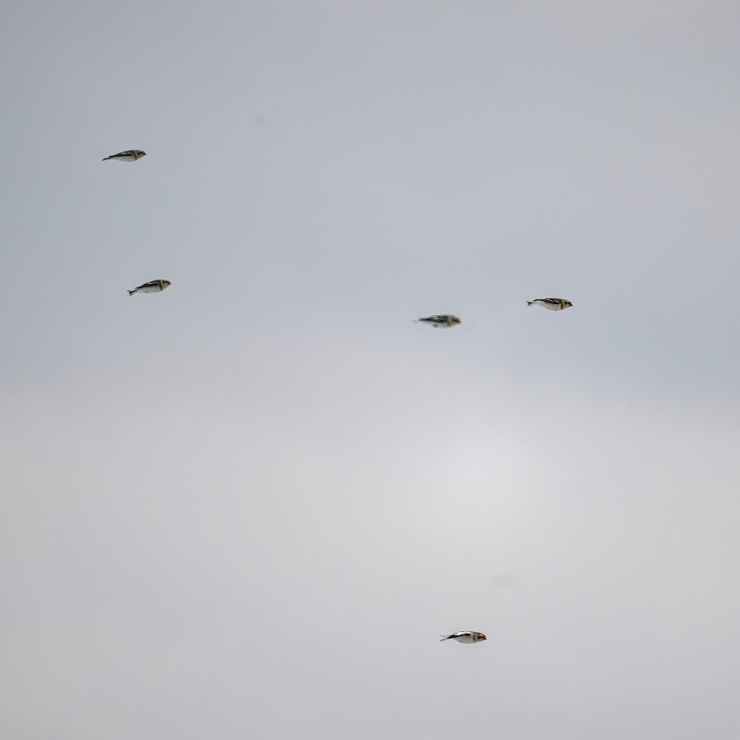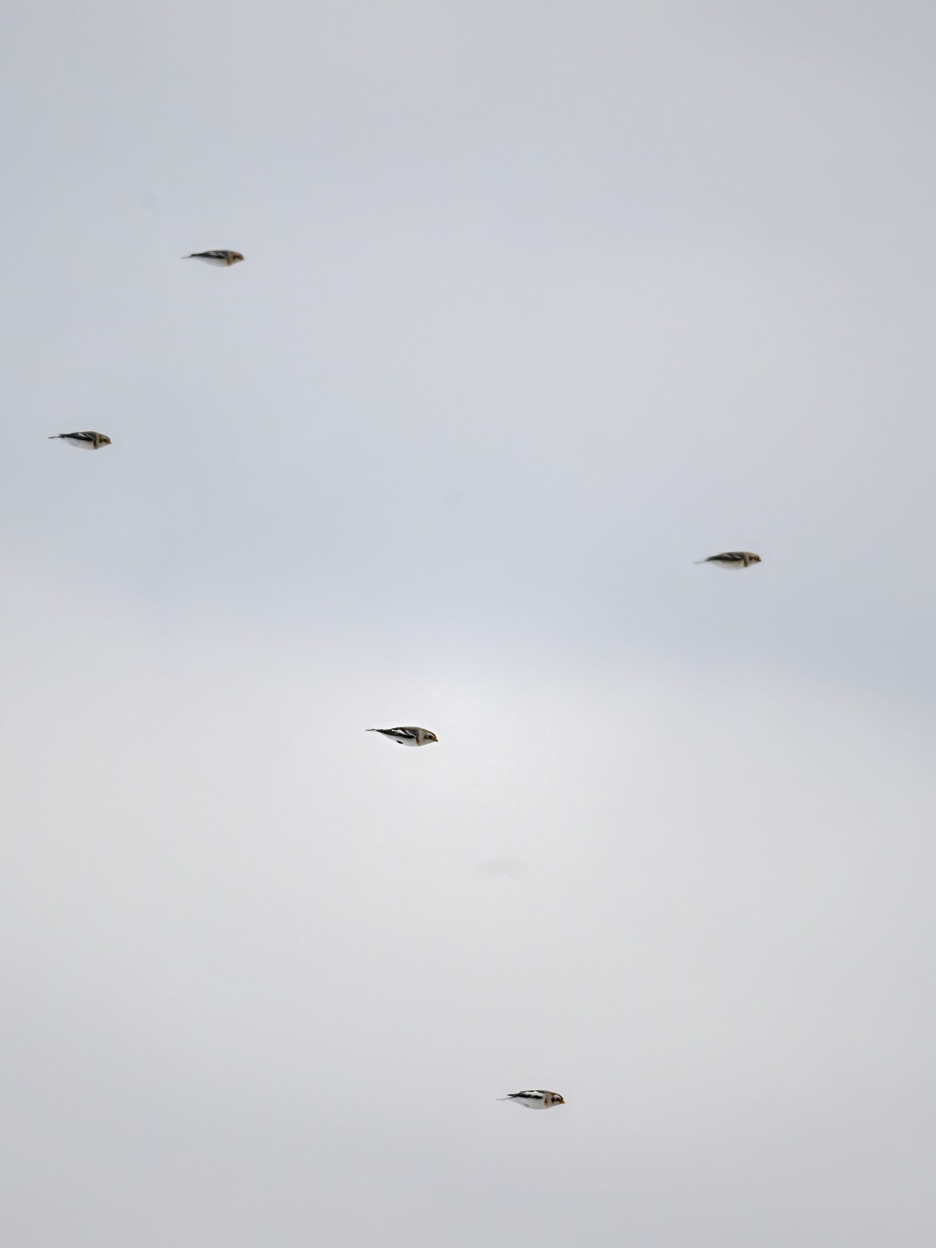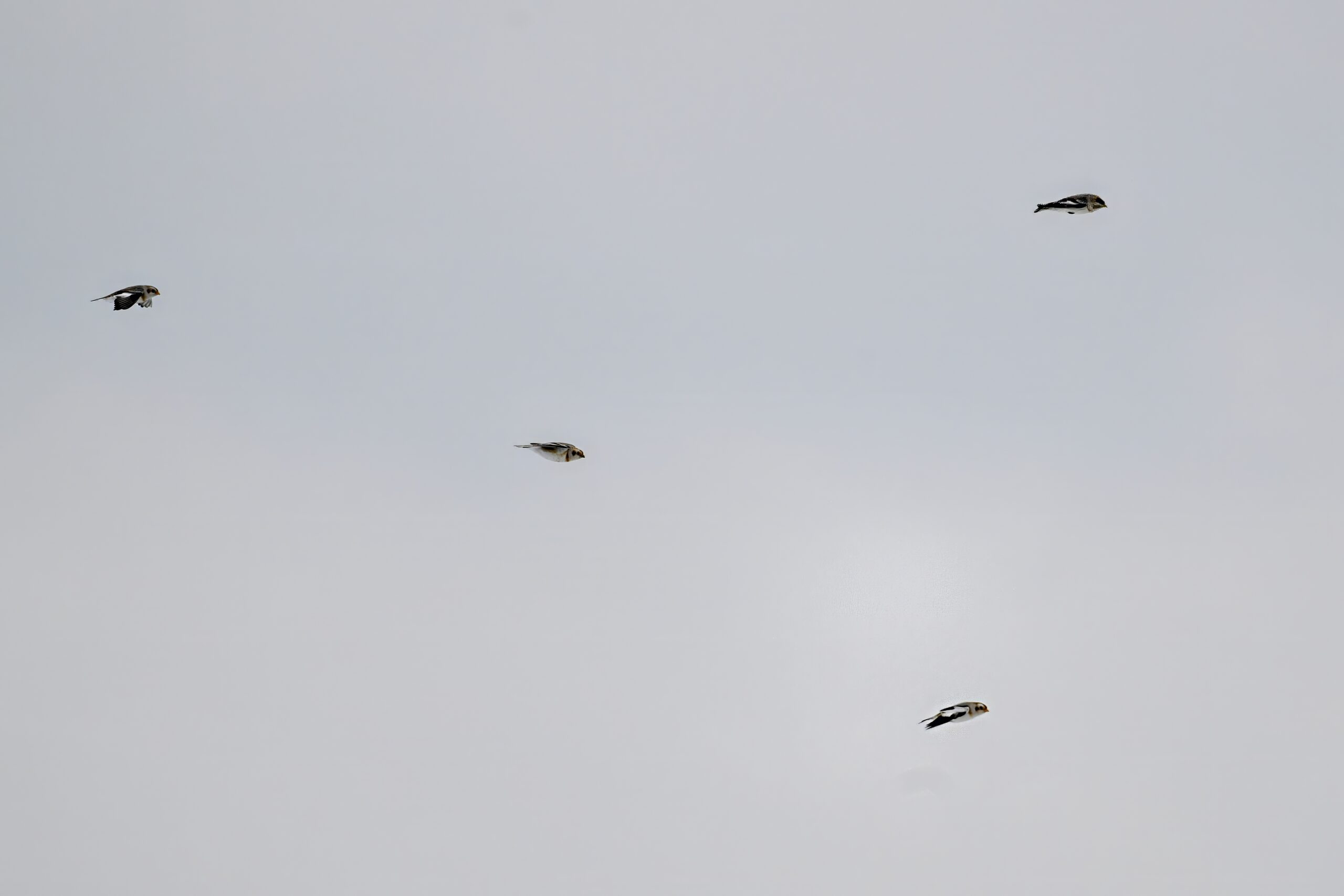 Following are all Snow Bunting (non-breeding plumage) on the ground and in the air, under cloudy conditions: