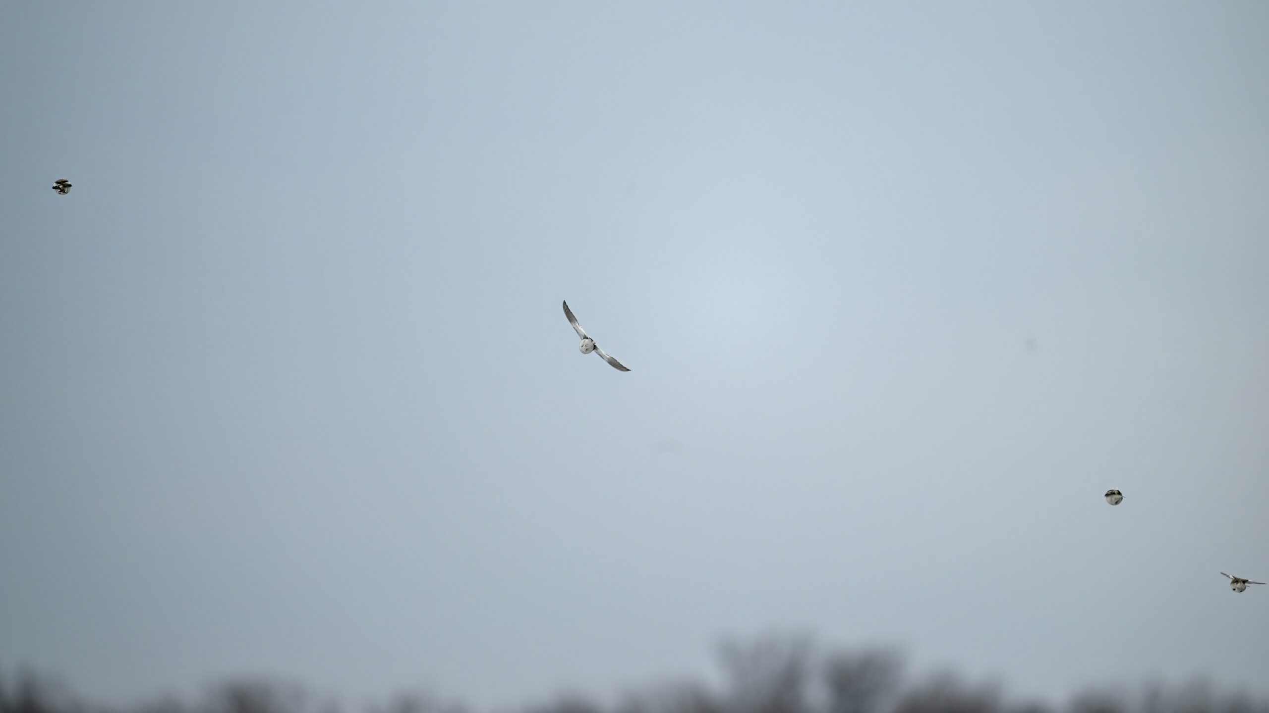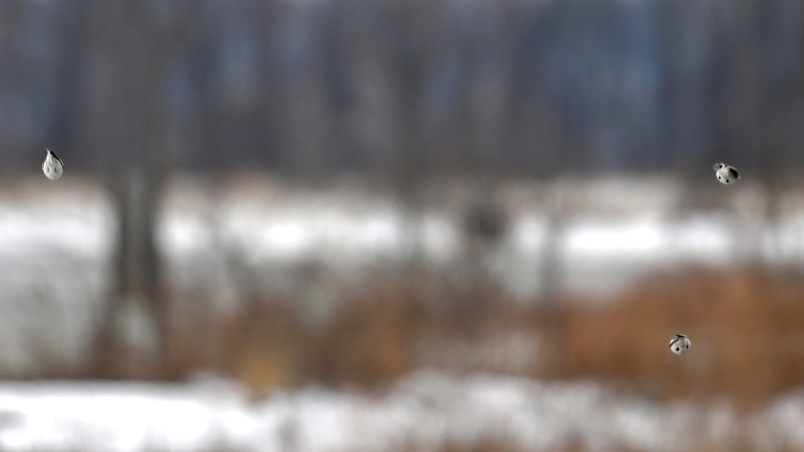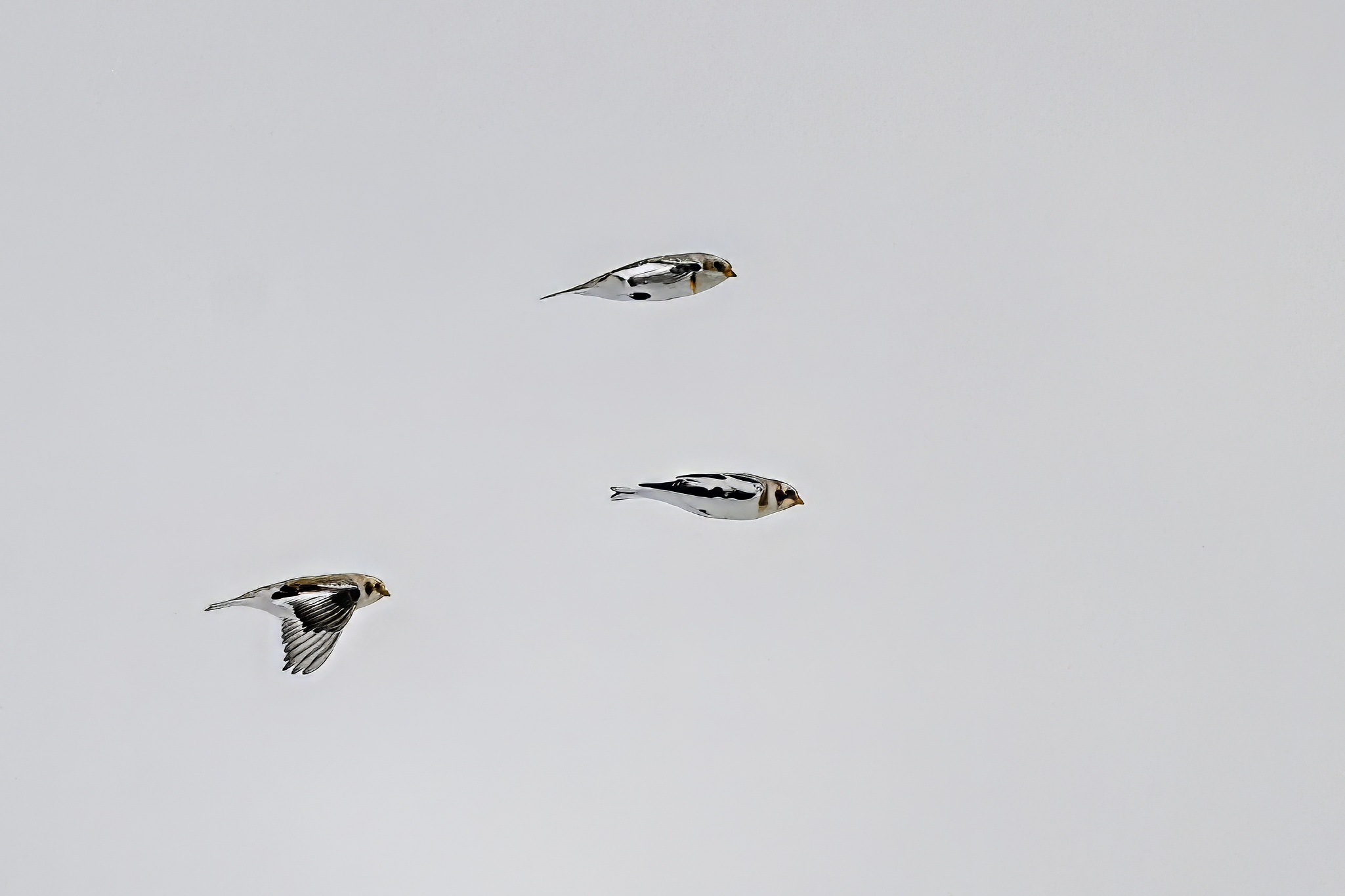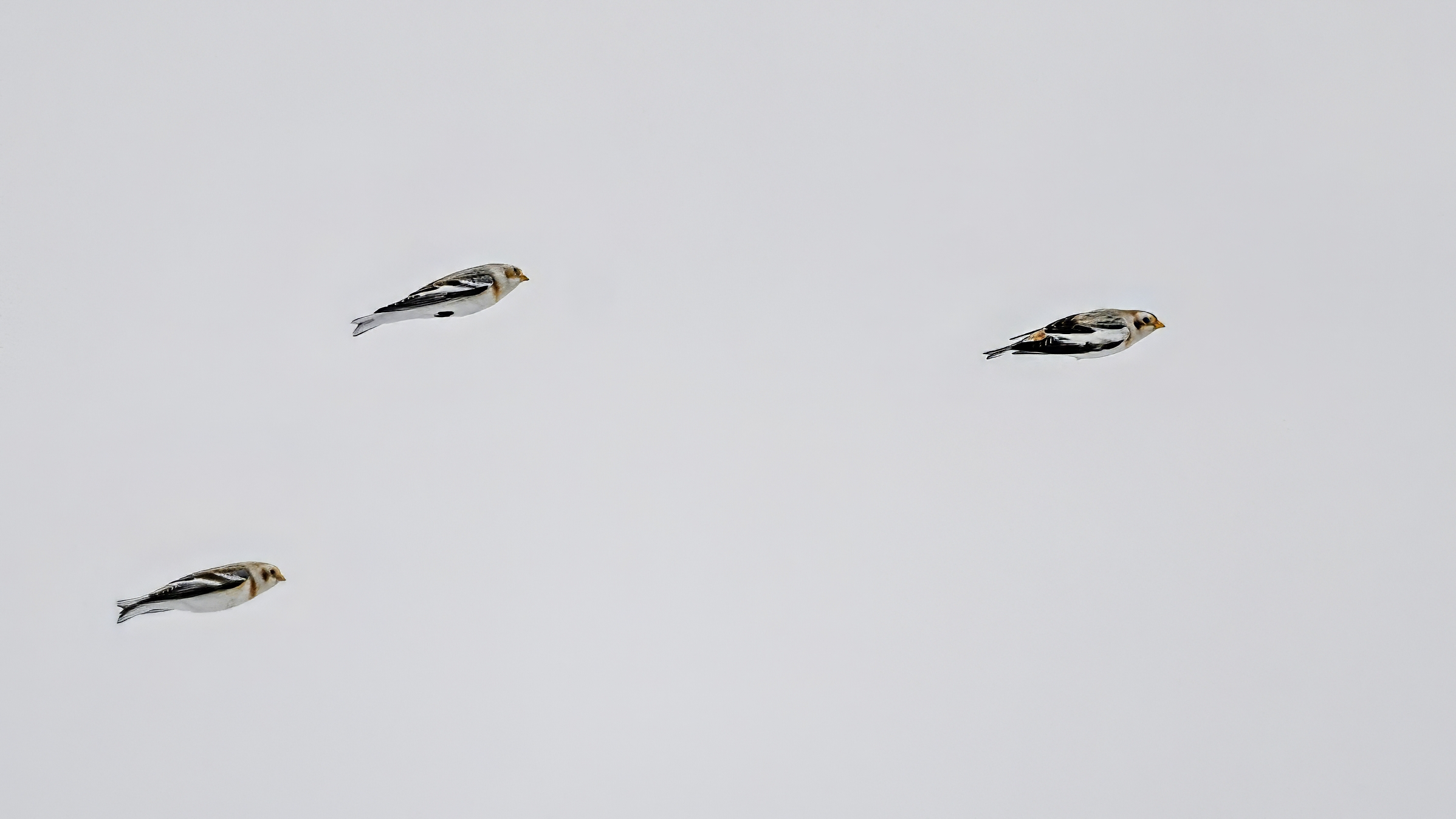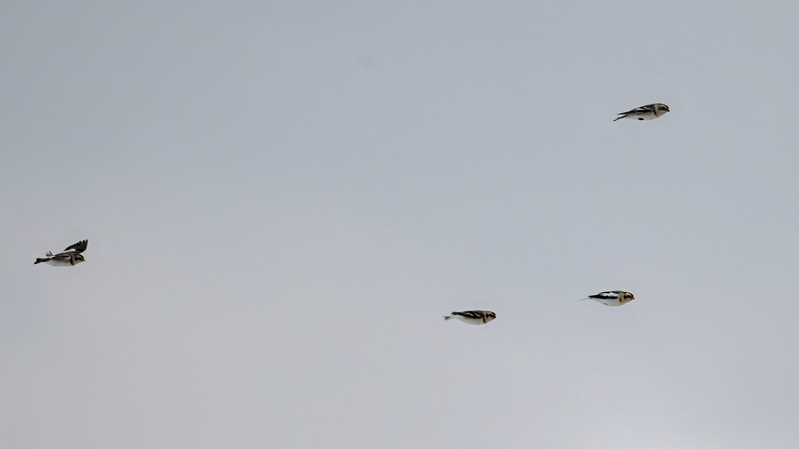 Following are all Snow Bunting (non-breeding plumage) on the ground and in the air, under cloudy conditions: