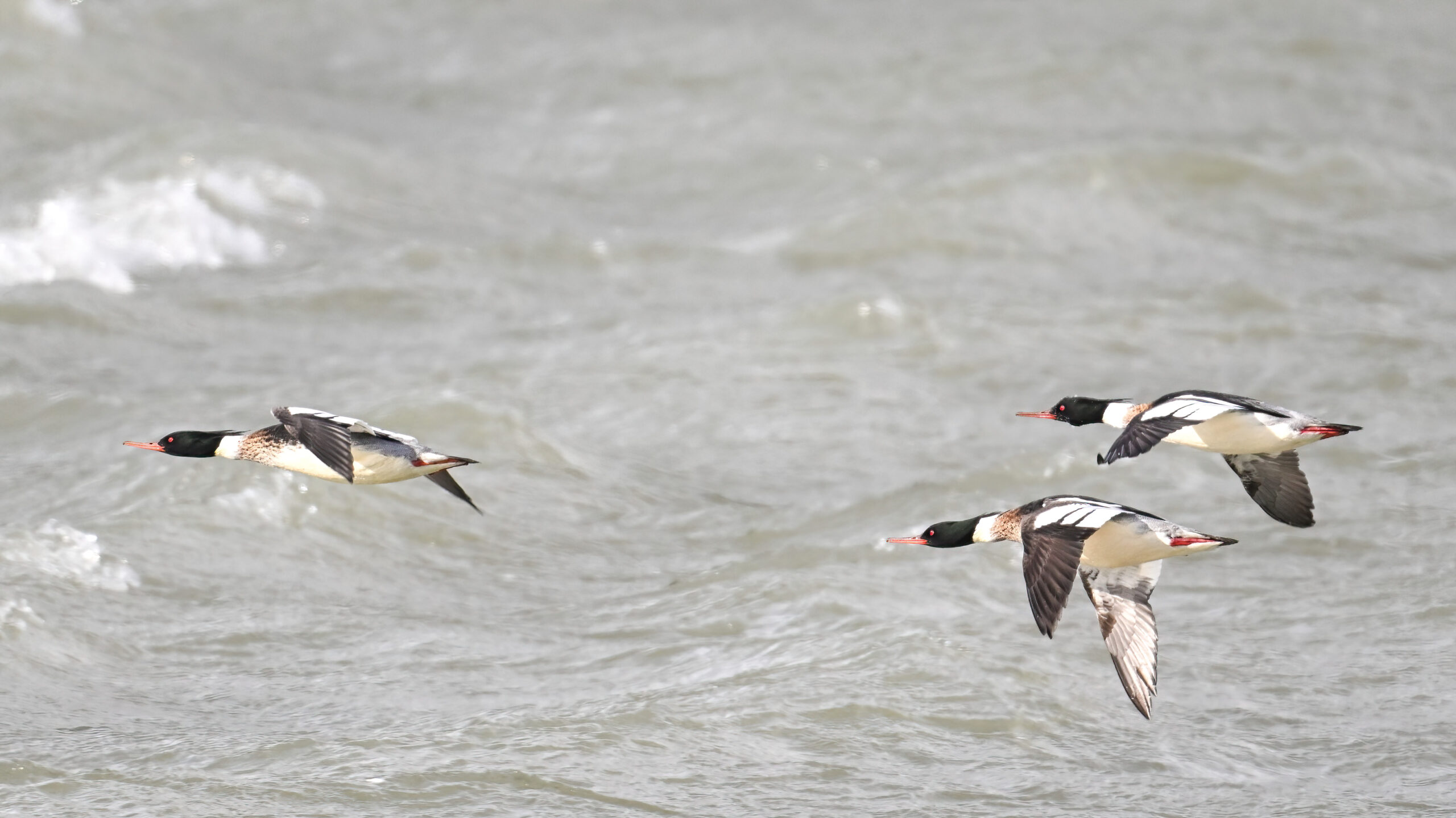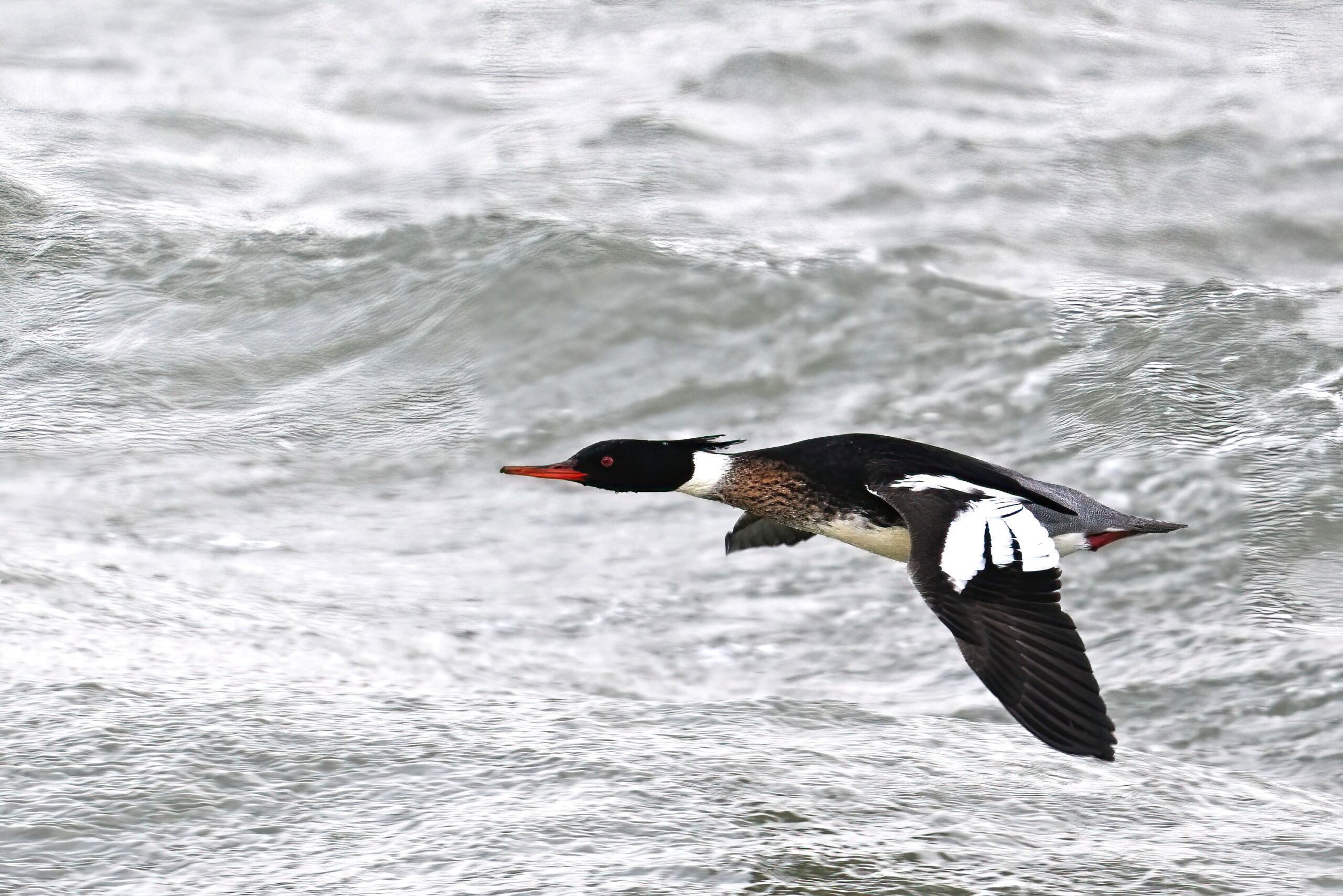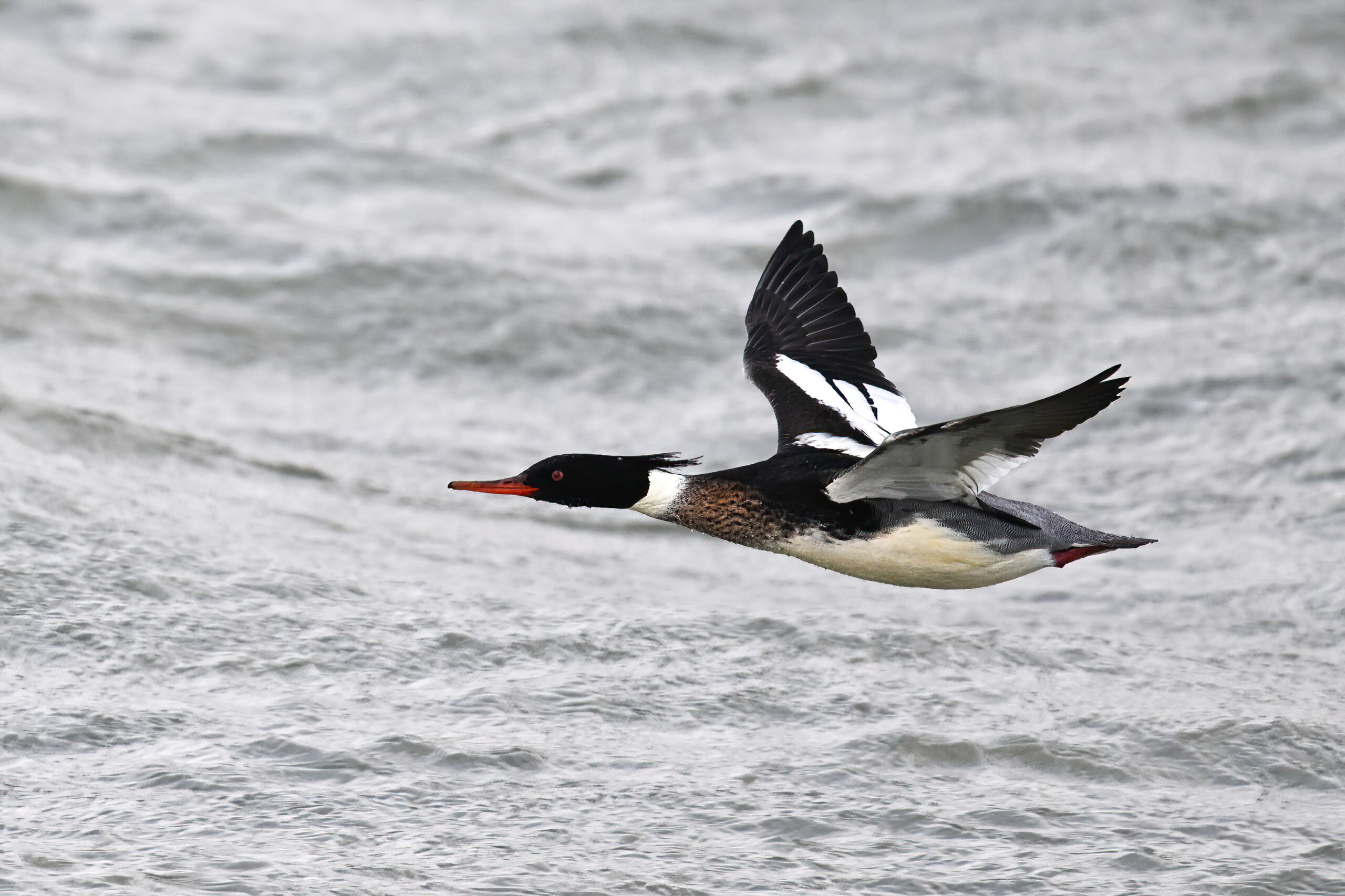 Finally, close to Budny Beach, a sequence of front-lit Red-breasted Merganser w/ dark sky (approaching snow squalls) background:
