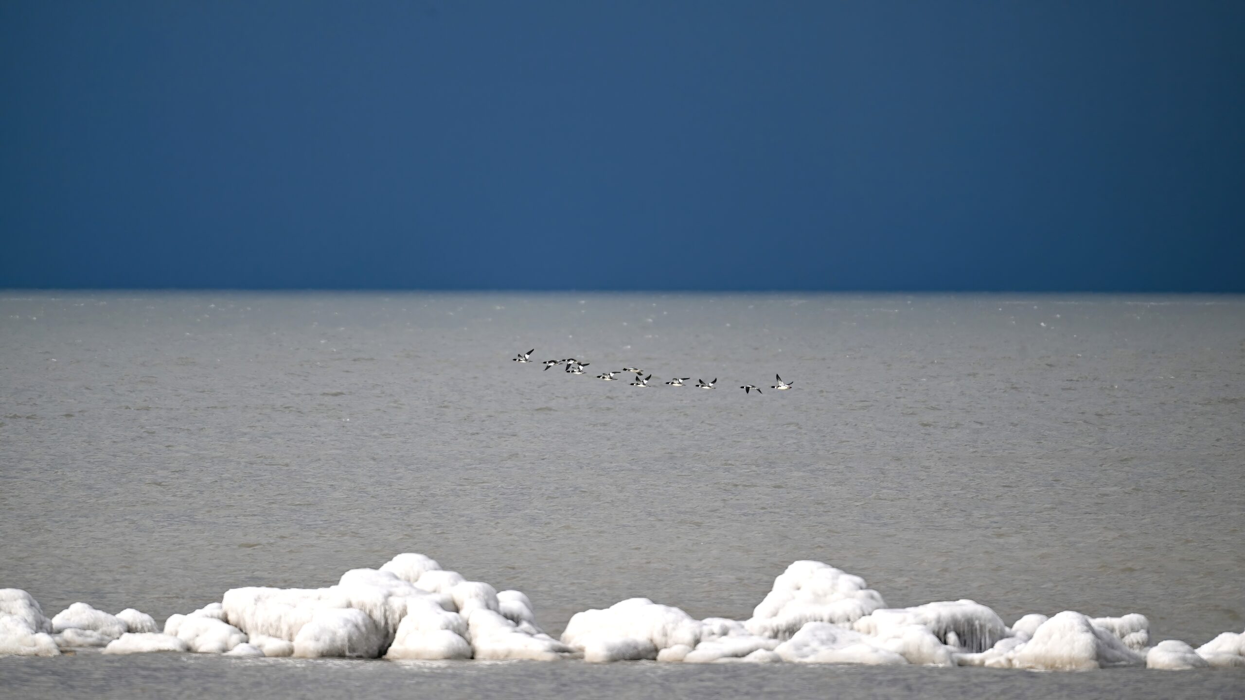 Outer Lake Erie w/ Red-breasted Mergansers, ice-covered breakwater in foreground