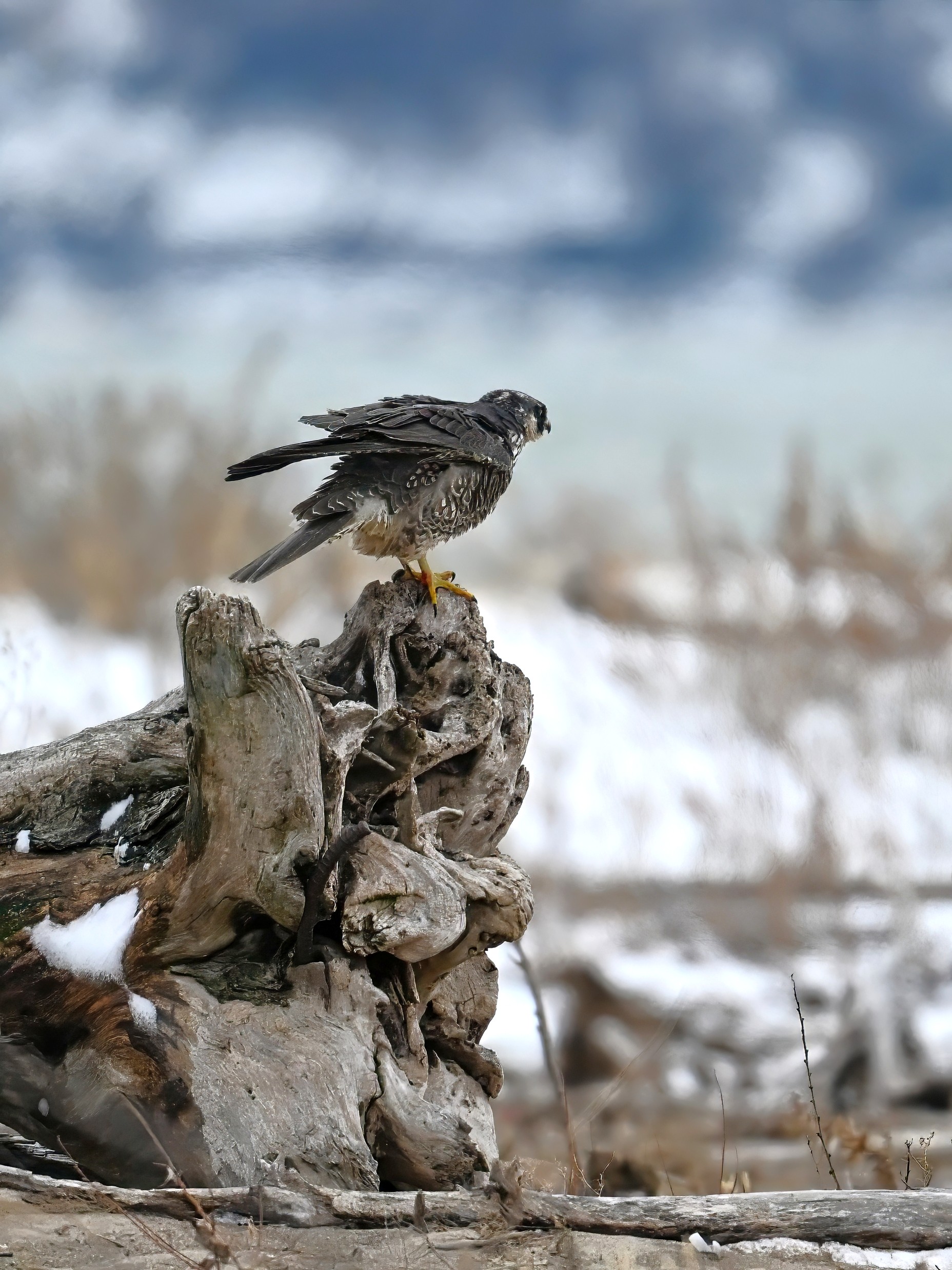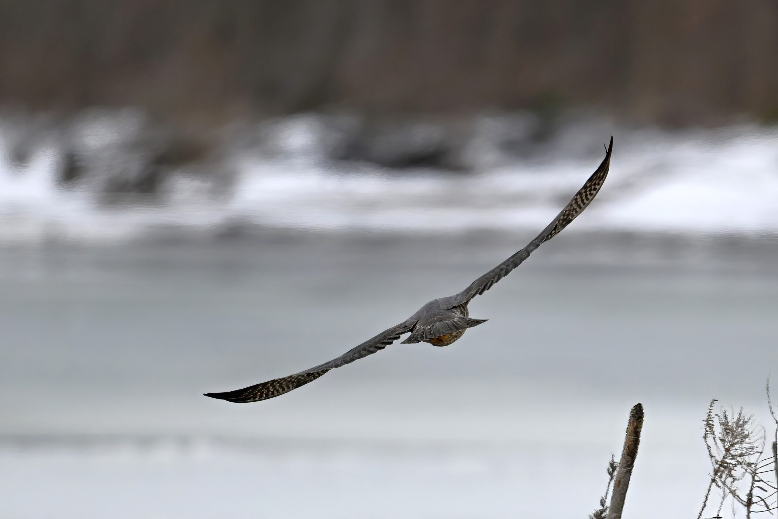 Red-shouldered Hawk (perched)Red-shouldered Hawk in flightRed-breasted Merganser (female – left, middle right; male – top/bottom right)Presque Isle Bay w/ float ice and gulls