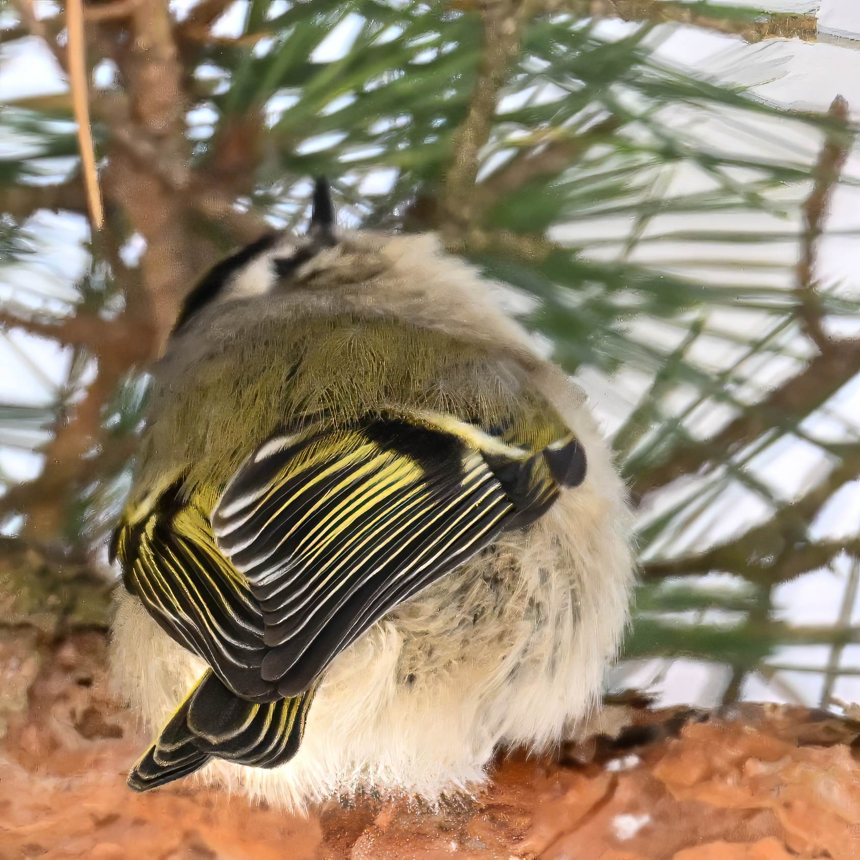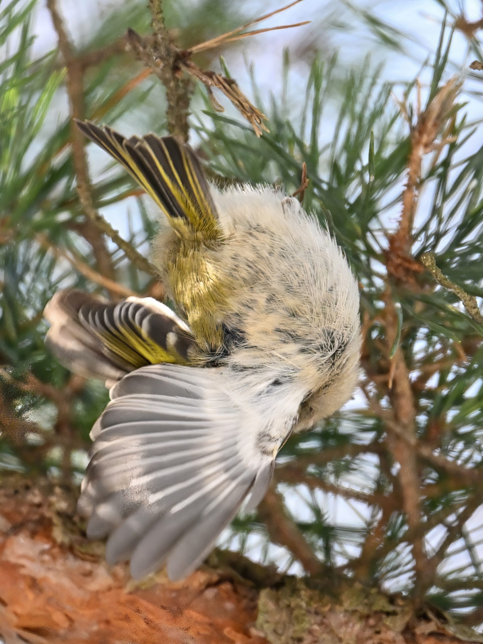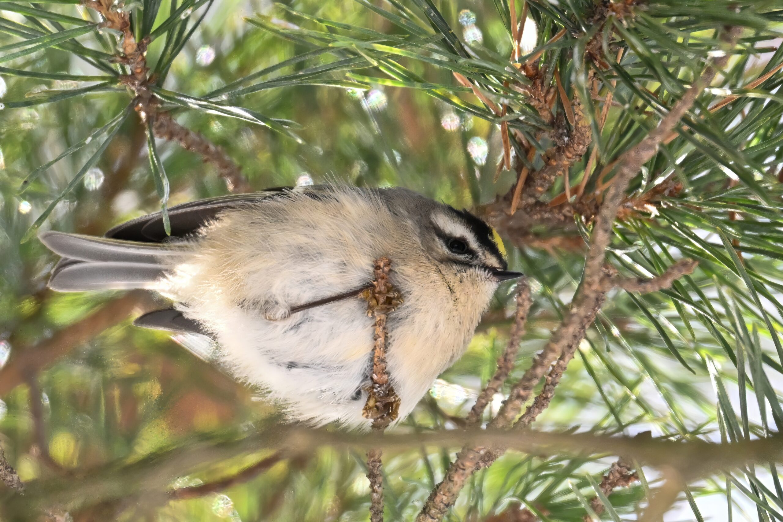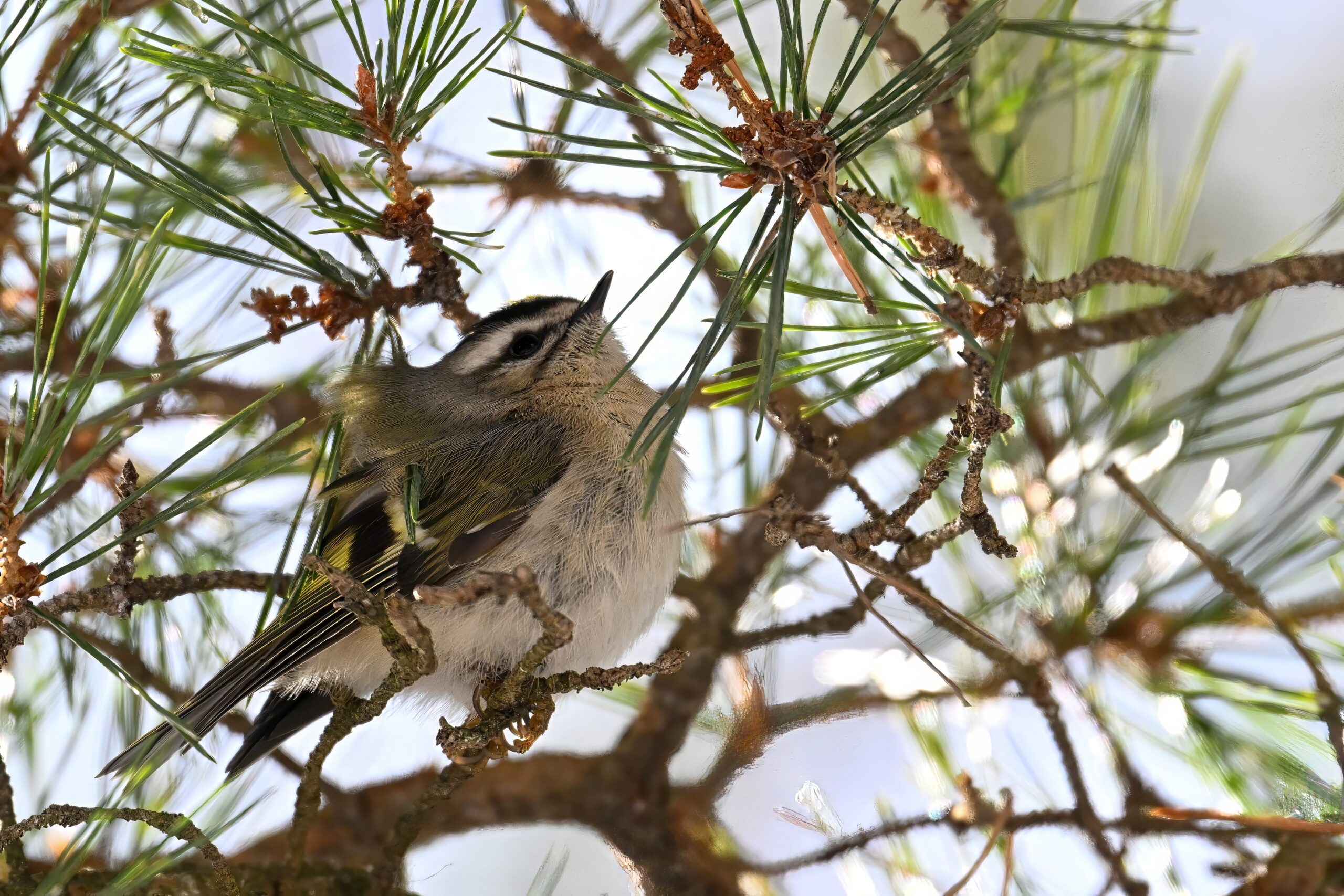 In today’s post, taking a break (temporarily) from ducks/South Pier with a beautiful Golden-crowned Kinglet yesterday in the pine woods at Presque Isle State Park. (Weather yesterday: sunny, temps around 9-10 deg F.) This individual perhaps the largest/fluffiest Kinglet we’ve ever seen.