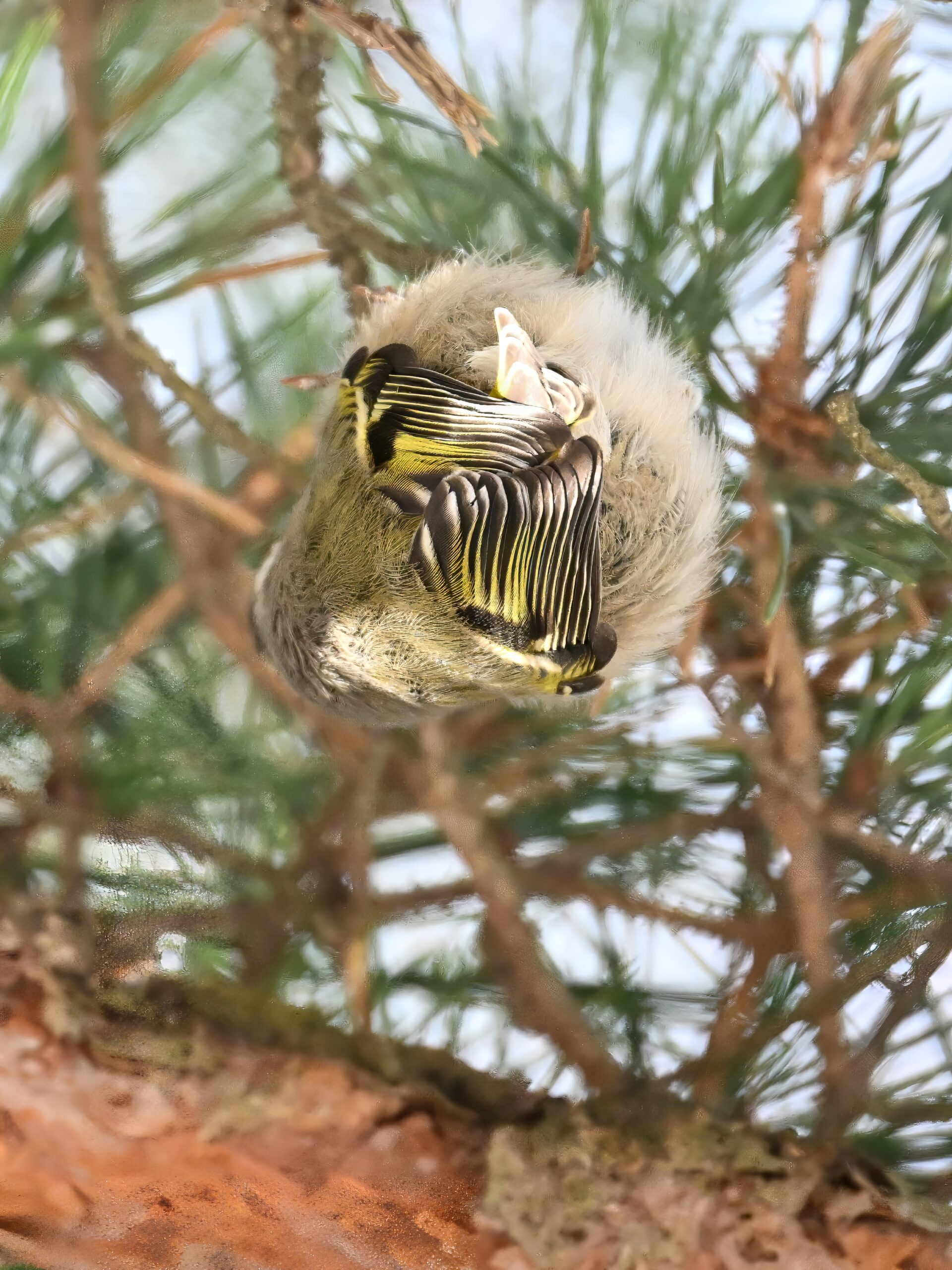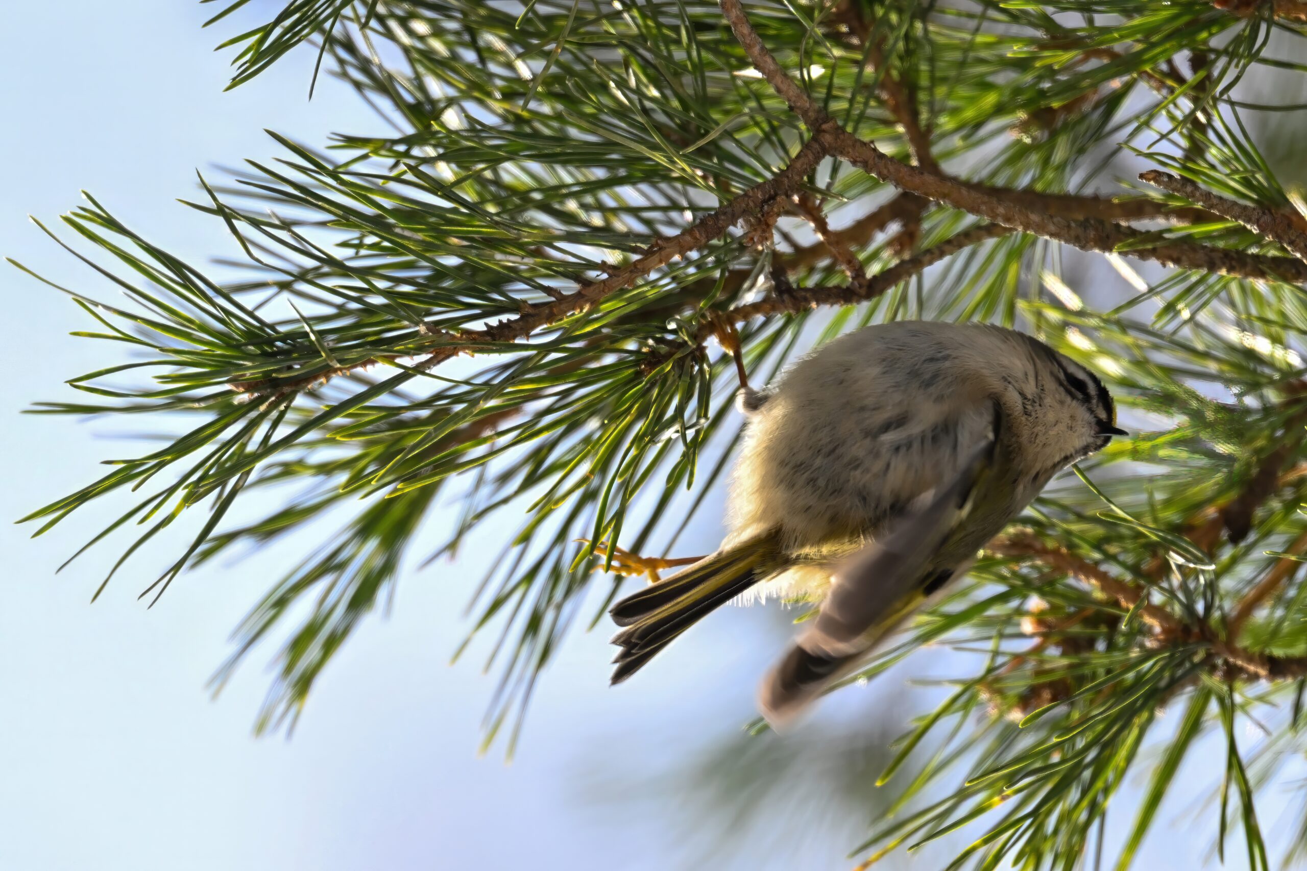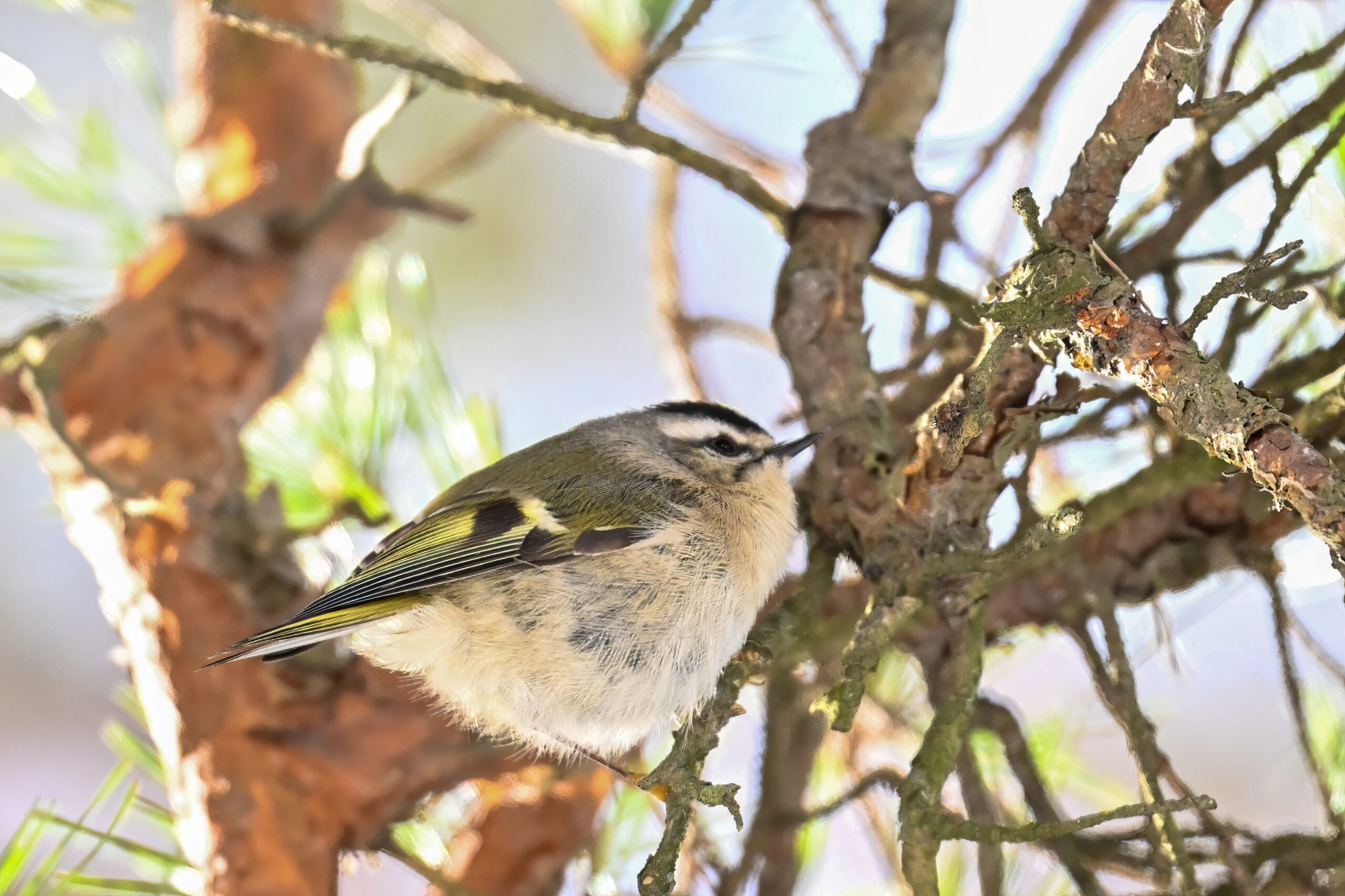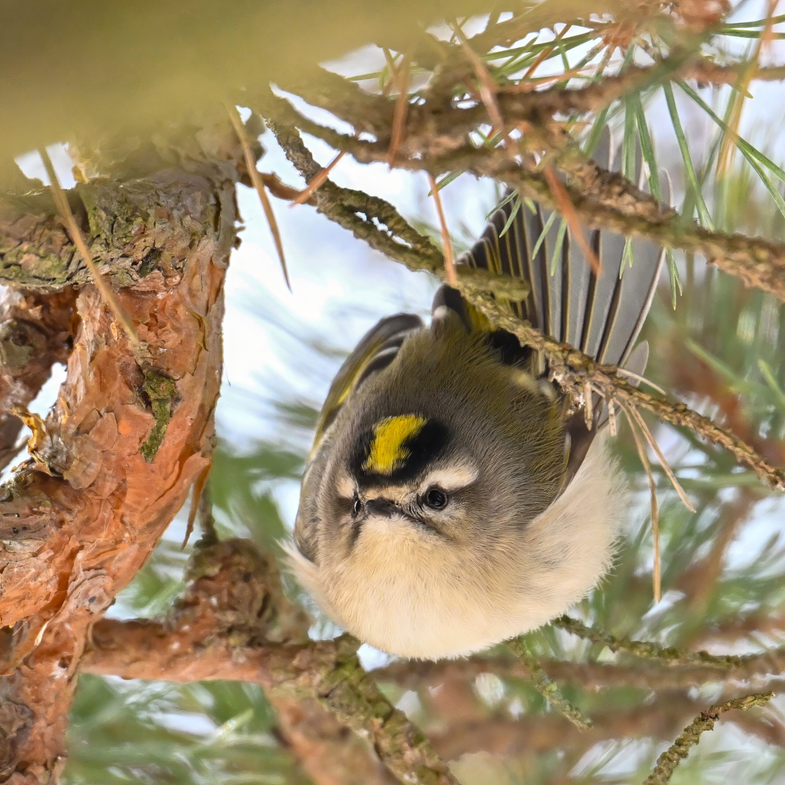 In today’s post, taking a break (temporarily) from ducks/South Pier with a beautiful Golden-crowned Kinglet yesterday in the pine woods at Presque Isle State Park. (Weather yesterday: sunny, temps around 9-10 deg F.) This individual perhaps the largest/fluffiest Kinglet we’ve ever seen.