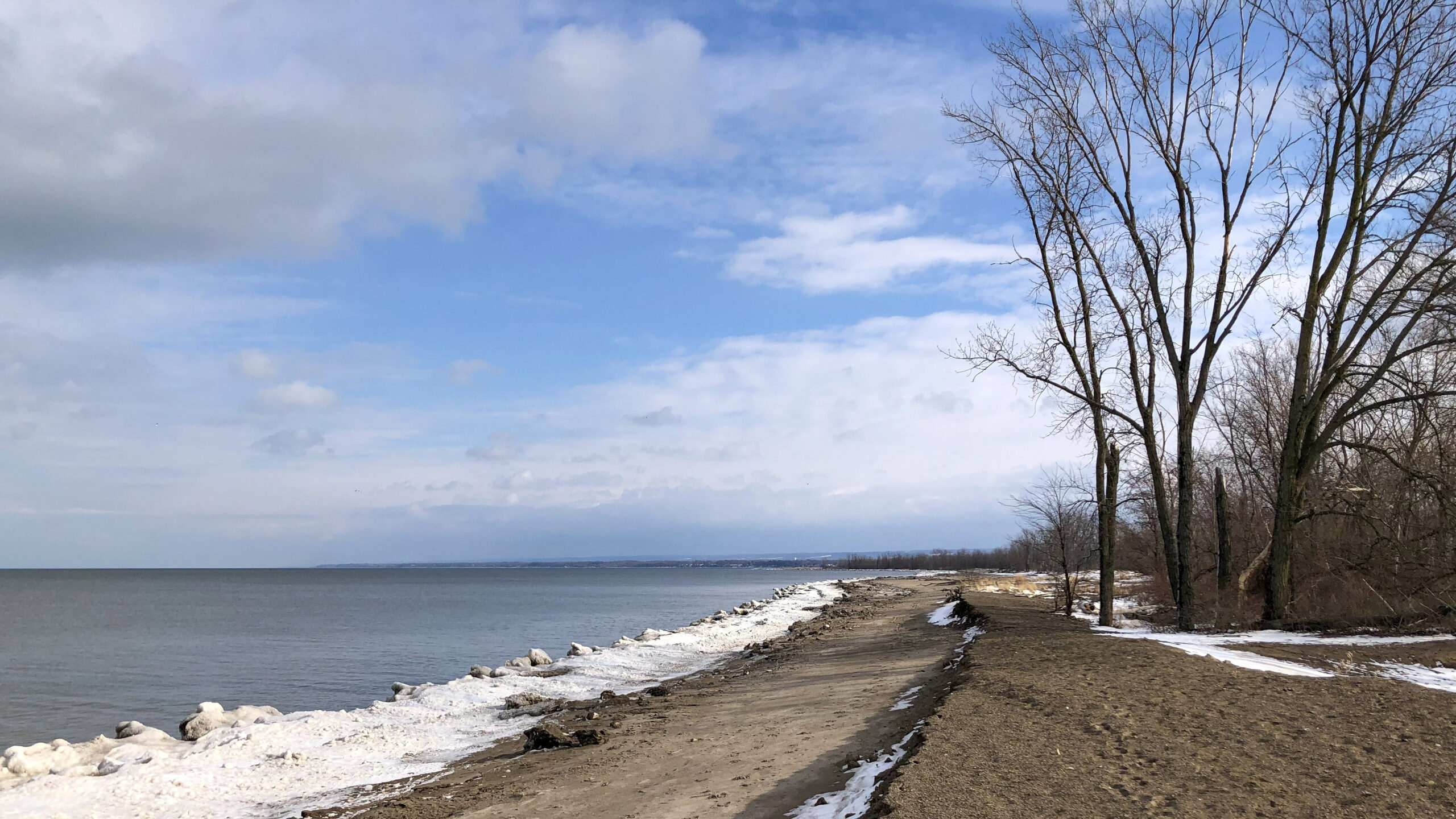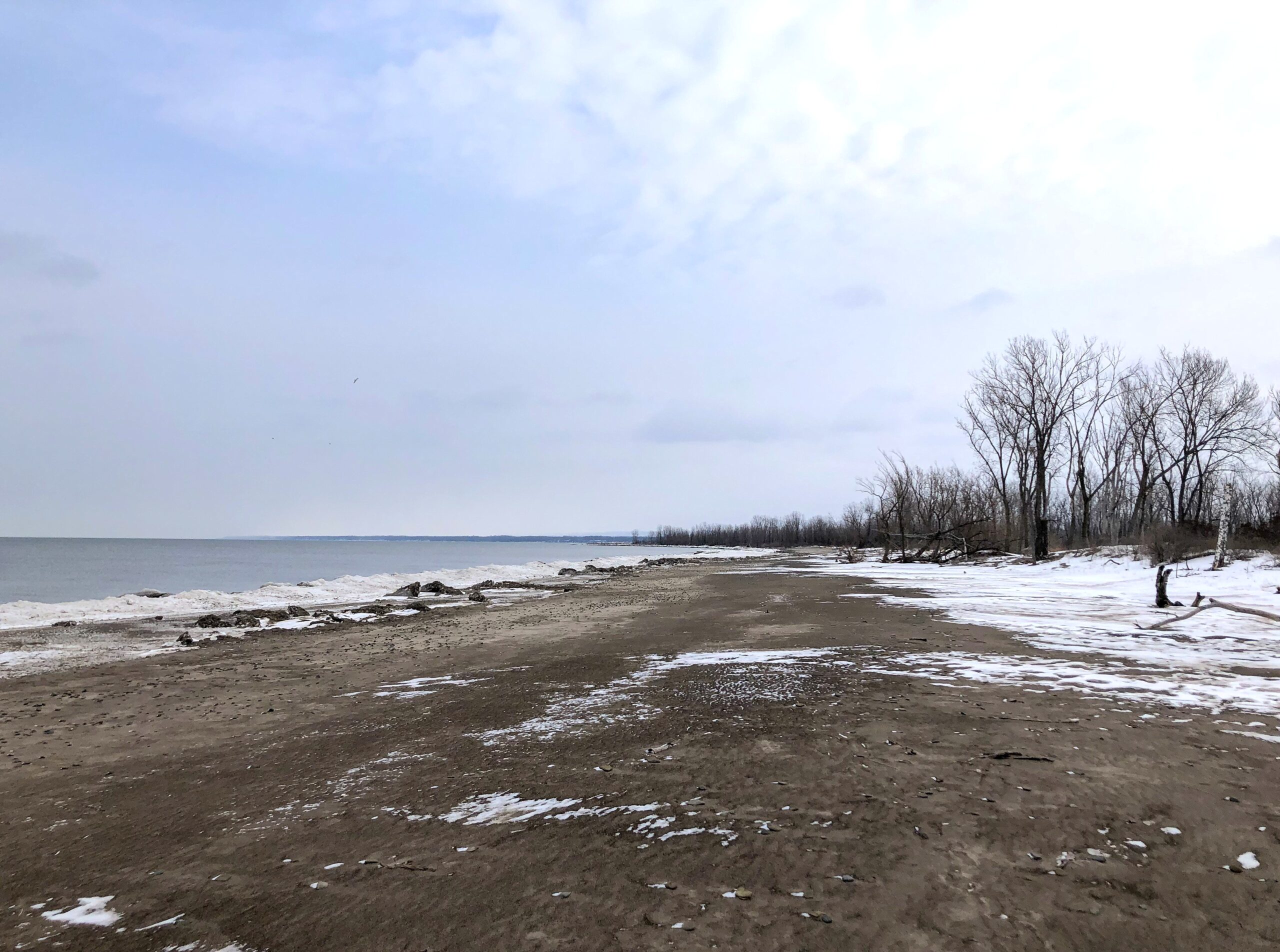 Beautiful day yesterday at Presque Isle State Park, up until 1:30PM when surprise snow squalls moved in with force. (Enough for a National Weather Service ’emergency broadcast’ over the cell network.) The following two shots were taken at Budny Beach (Beach No. 10) at approximately 1:17PM. The first is looking generally east – it’s turned into a nice, sunny day!