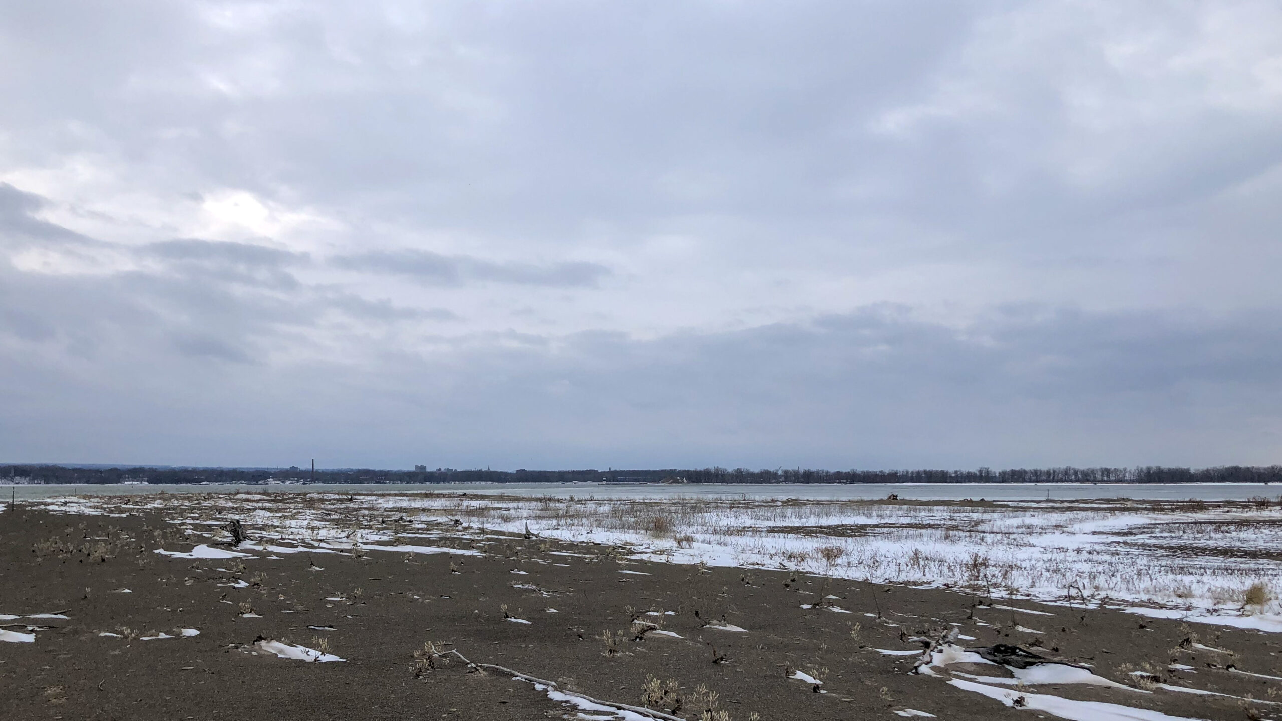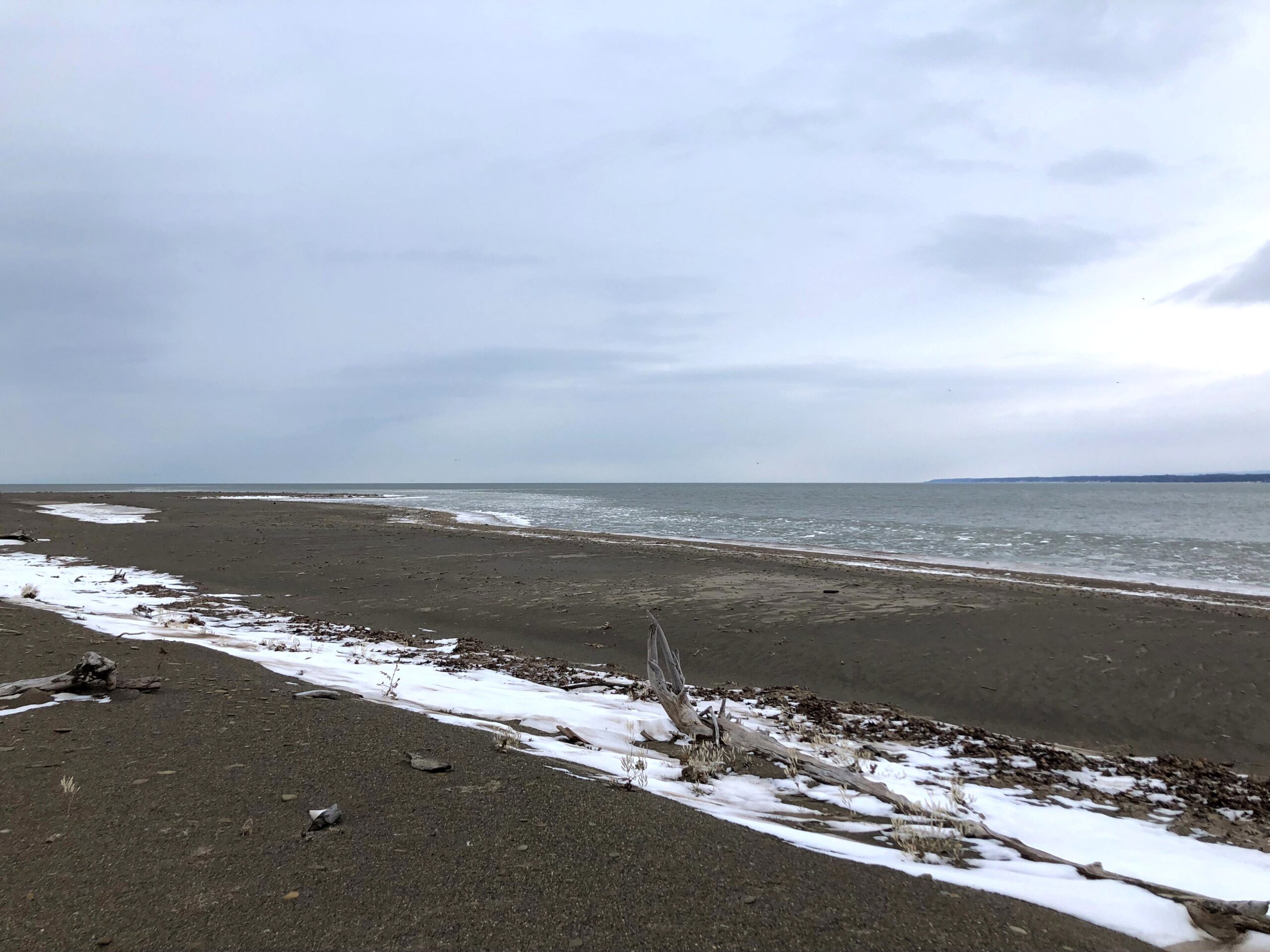 Sunny yesterday in Erie County, Pennsylvania, but also very, very cold. Sun = good for well-lit exposures, bad for atmospheric heat shimmer, e.g., as at the horizon of this shot of Presque Isle Bay looking east towards North Pier (left) and South Pier (right):